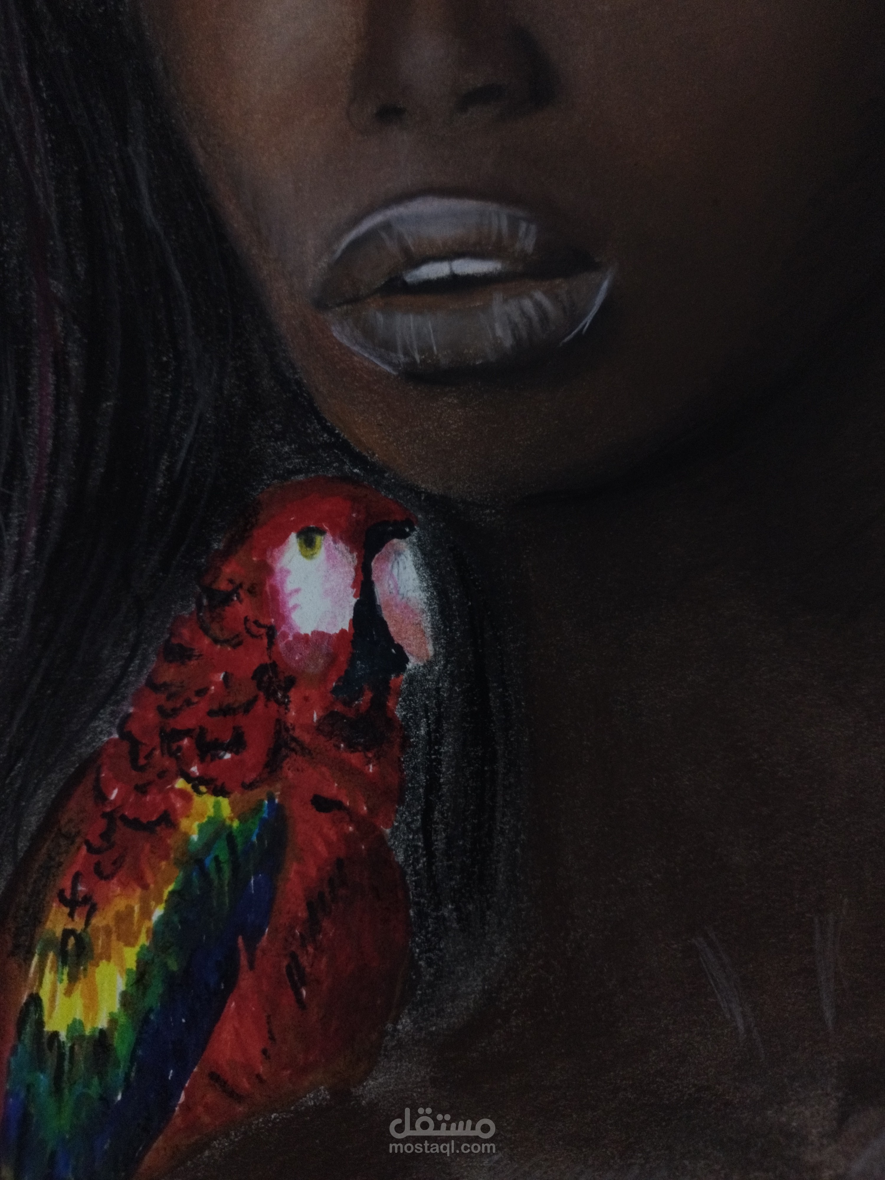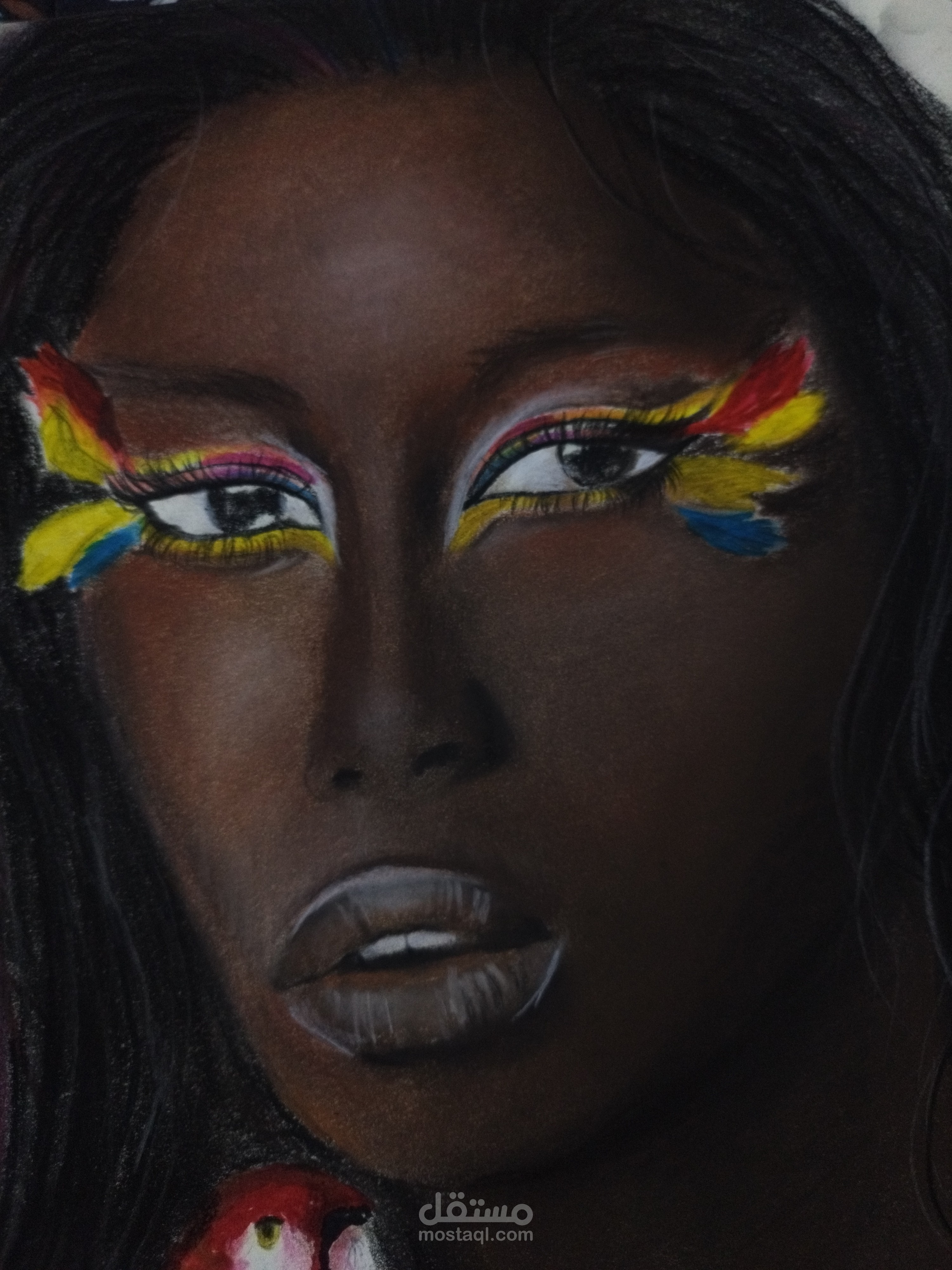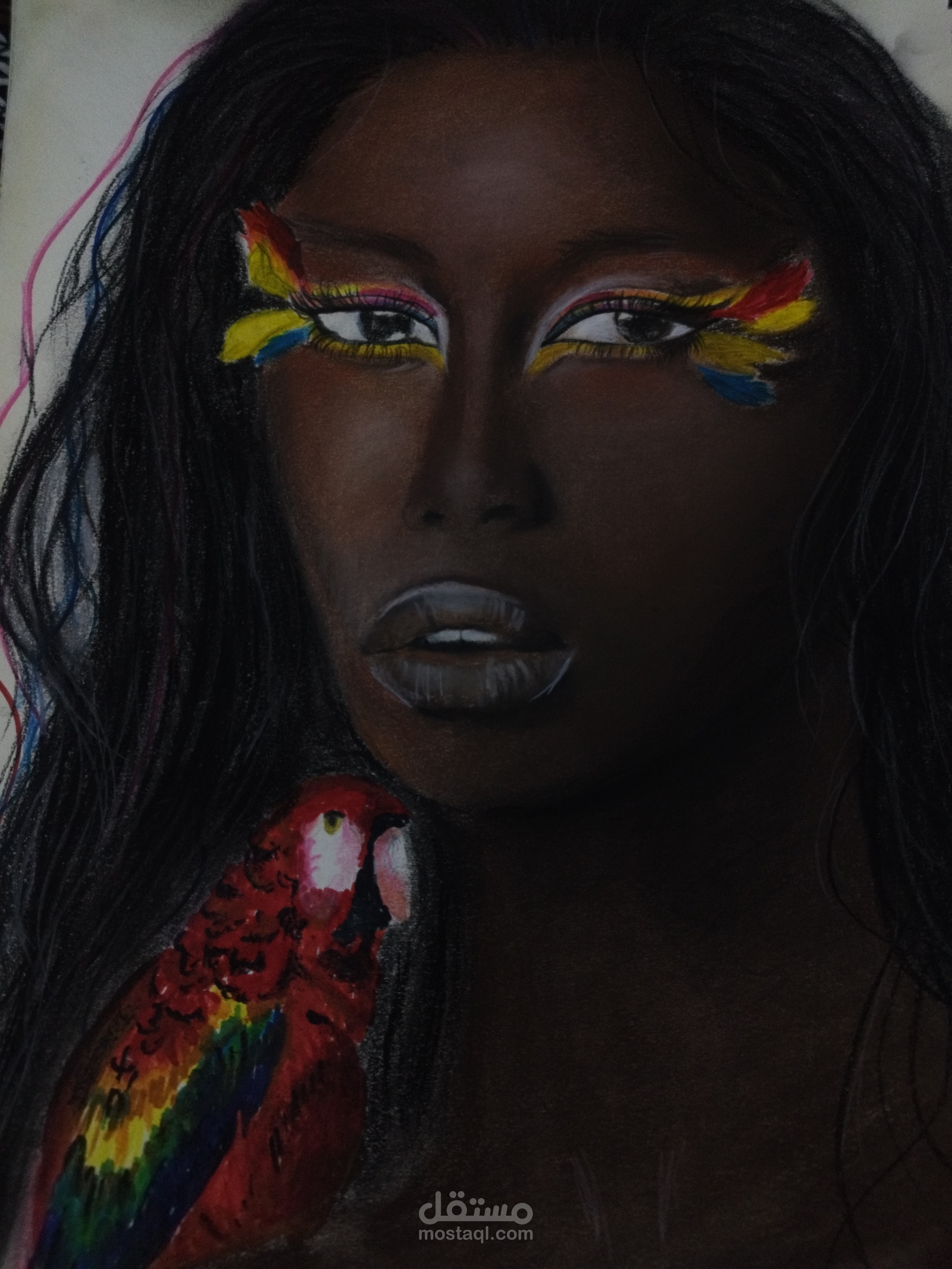 هذه رسمه مميزة جداً رسمه خيالية تم التركيز في لون البشرة رسم العين والشعر واستخدمت خصلات الشعر الملونه مع المكياج العين الملون لتتجانس الالوان مع طير الببغاء اللطيف والوانه الجميلة.