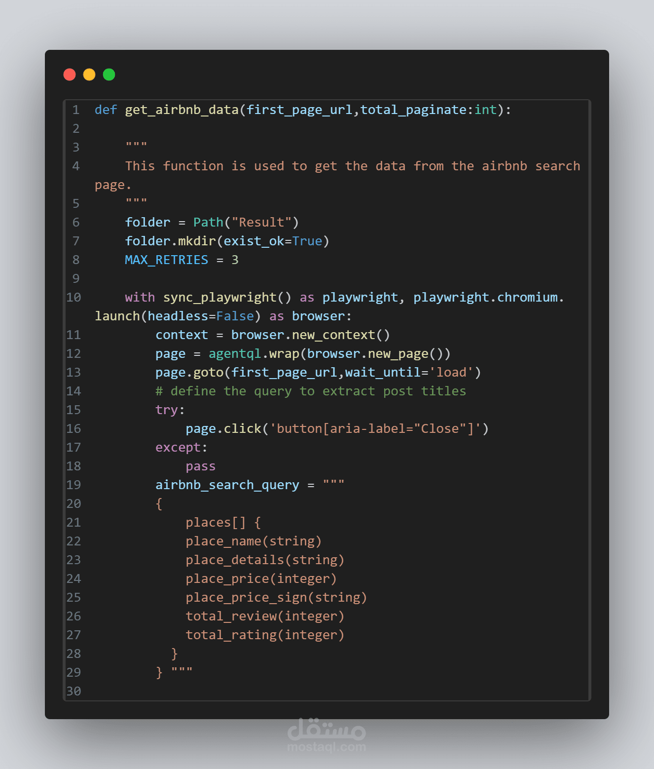 أداة ذكية لاستخلاص بيانات Airbnb باستخدام Playwright للتعامل مع المحتوى الديناميكي، بالإضافة إلى استخدام AI API (AgentQl) لتحسين دقة استخراج البيانات.
