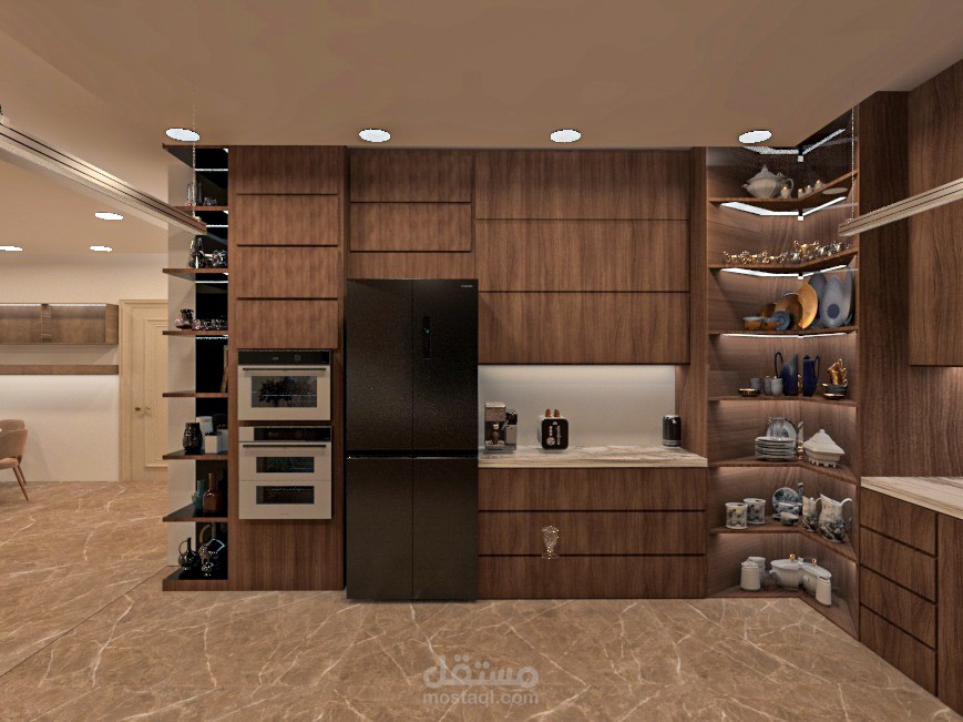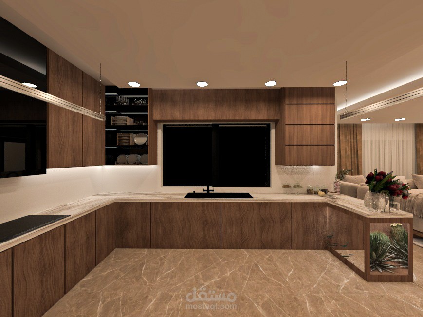 تصميم مطبخي يجمع بين الأناقة والعملية من خلال دمج ألوان دافئة ومحايدة تعكس ذوقاً رفيعاً. تعتمد الألوان الأساسية على البني الغني الذي يمنح المكان إحساساً بالدفء والراحة، مع لمسات راقية من الرخام الأبيض الموشح الذي يضيف إشراقة وتباين جذاب. تم اختيار الاكسسوارات باللون الأسود لتعزيز الطابع العصري والفخم، حيث تبرز التفاصيل الدقيقة وتكمل التصميم بشكل أنيق ومتناسق. هذا التوازن بين الألوان والمواد يجعل المطبخ مساحة مميزة تجمع بين الجمال والوظيفة في آن واحد.