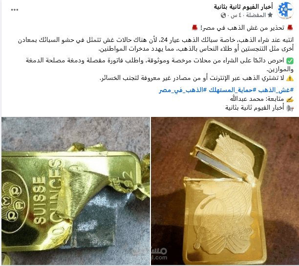 كتبت منشورًا توعويًا بصيغة جذابة ومباشرة بهدف تحذير المواطنين من حالات الغش التي تحدث عند شراء سبائك الذهب، خاصة عيار 24.