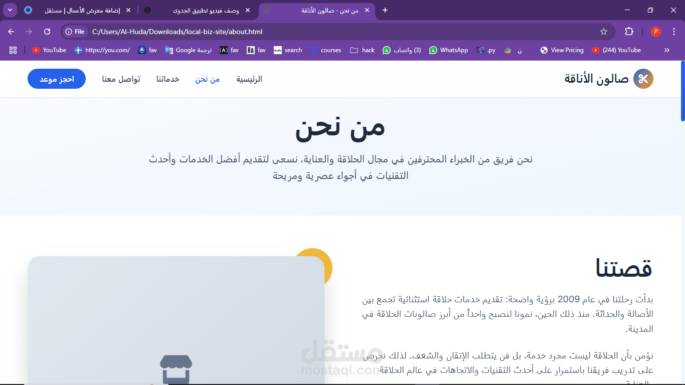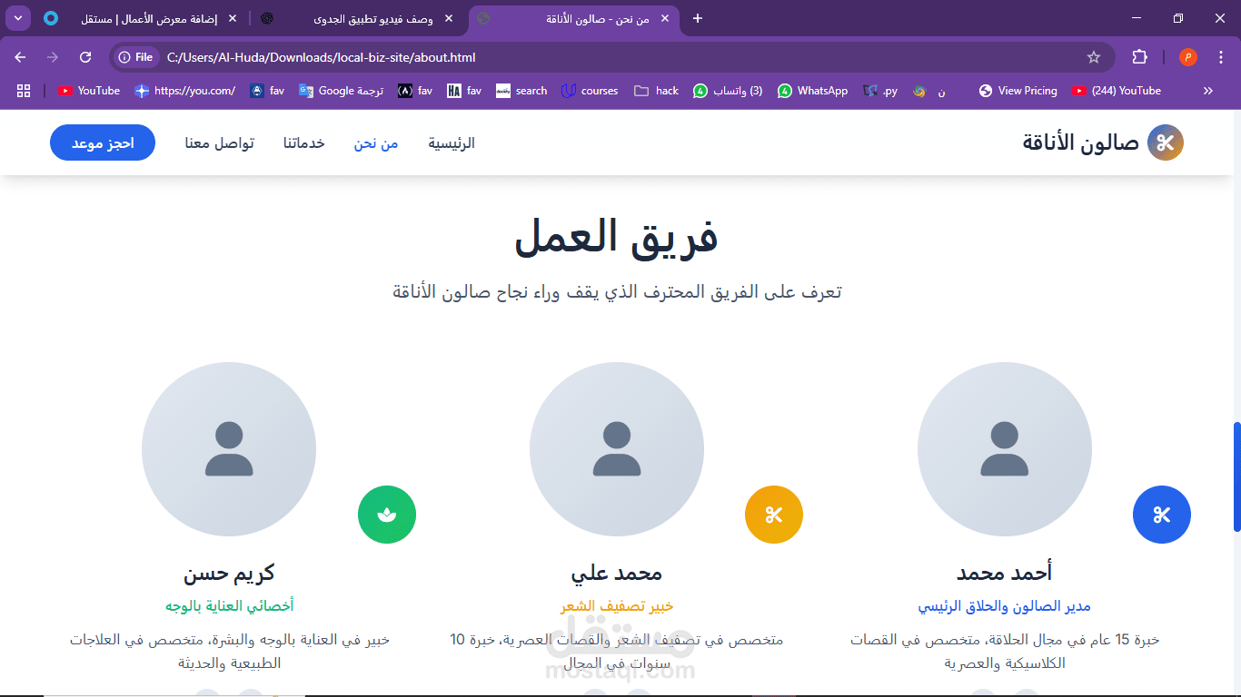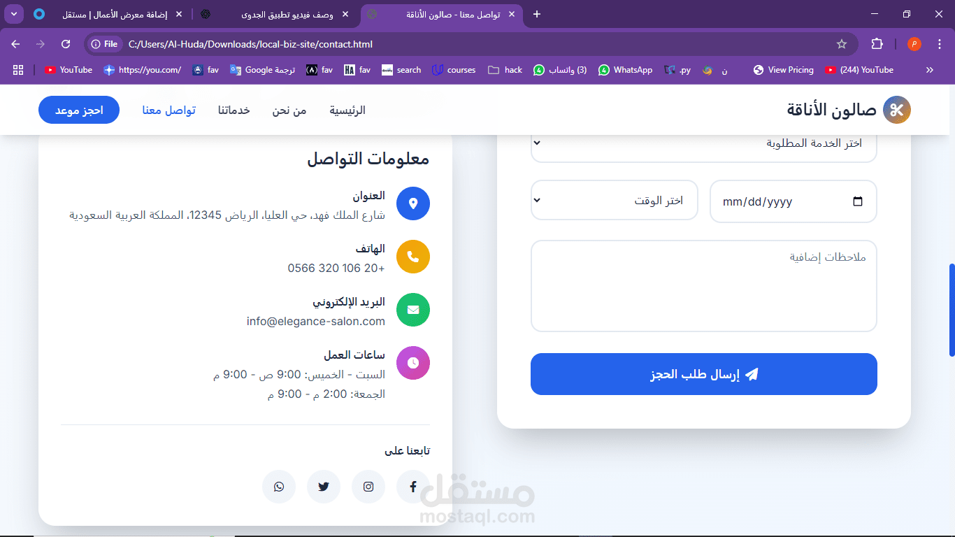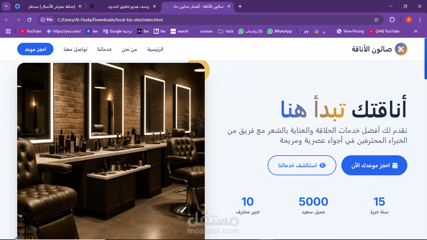 This project is a simple, modern website designed for a local barbershop called Salon Elegance. The goal of the site is to give customers a quick and easy way to learn about the shop’s services, book an appointment, and get in touch. The website is fully responsive and built using HTML, CSS, and JavaScript. It is written in Arabic and uses a right-to-left (RTL) layout.
