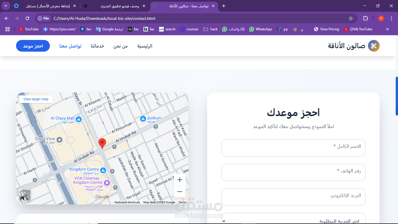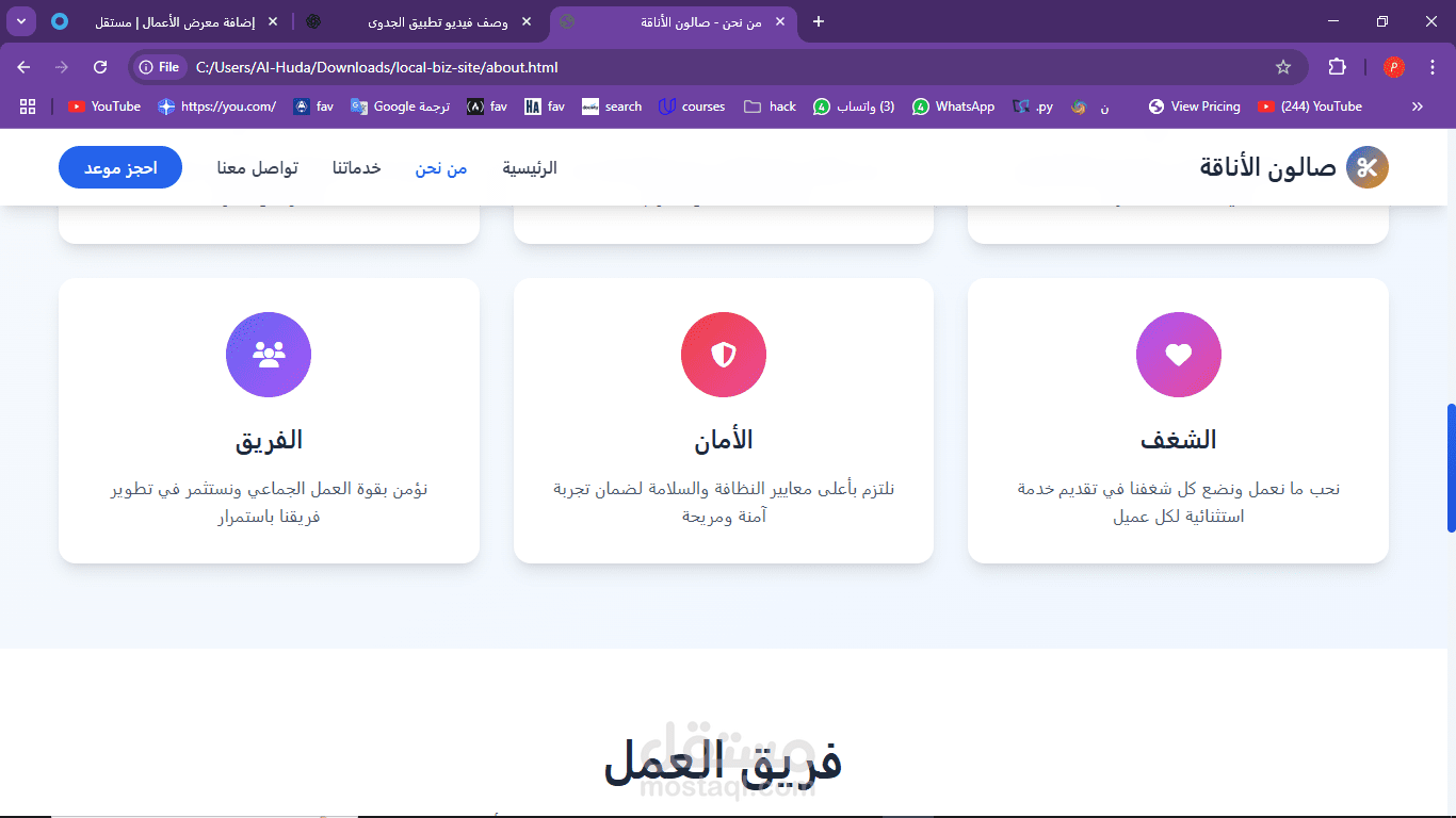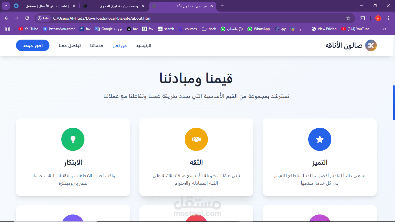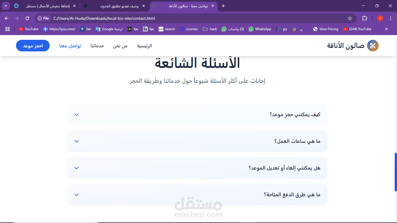 This project is a simple, modern website designed for a local barbershop called Salon Elegance. The goal of the site is to give customers a quick and easy way to learn about the shop’s services, book an appointment, and get in touch. The website is fully responsive and built using HTML, CSS, and JavaScript. It is written in Arabic and uses a right-to-left (RTL) layout.