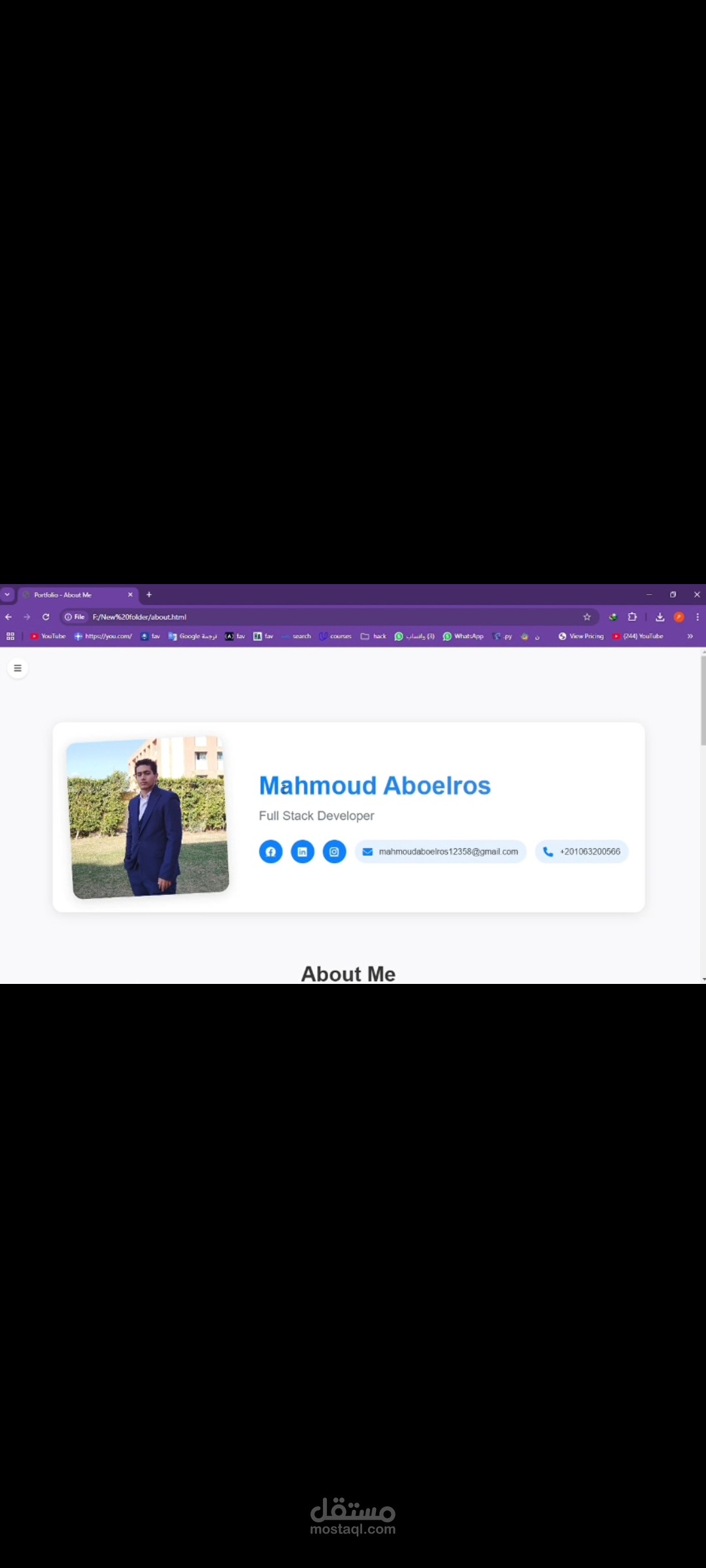 The “About Me” section introduces Mahmoud with a photo, a clear title ("Full Stack Developer"), and links to social media platforms such as LinkedIn, Facebook, and Instagram. Contact information is displayed clearly, including email and phone number, making it easy for potential clients or collaborators to reach him. The use of card-style elements and visual contrast helps separate sections and improve focus.