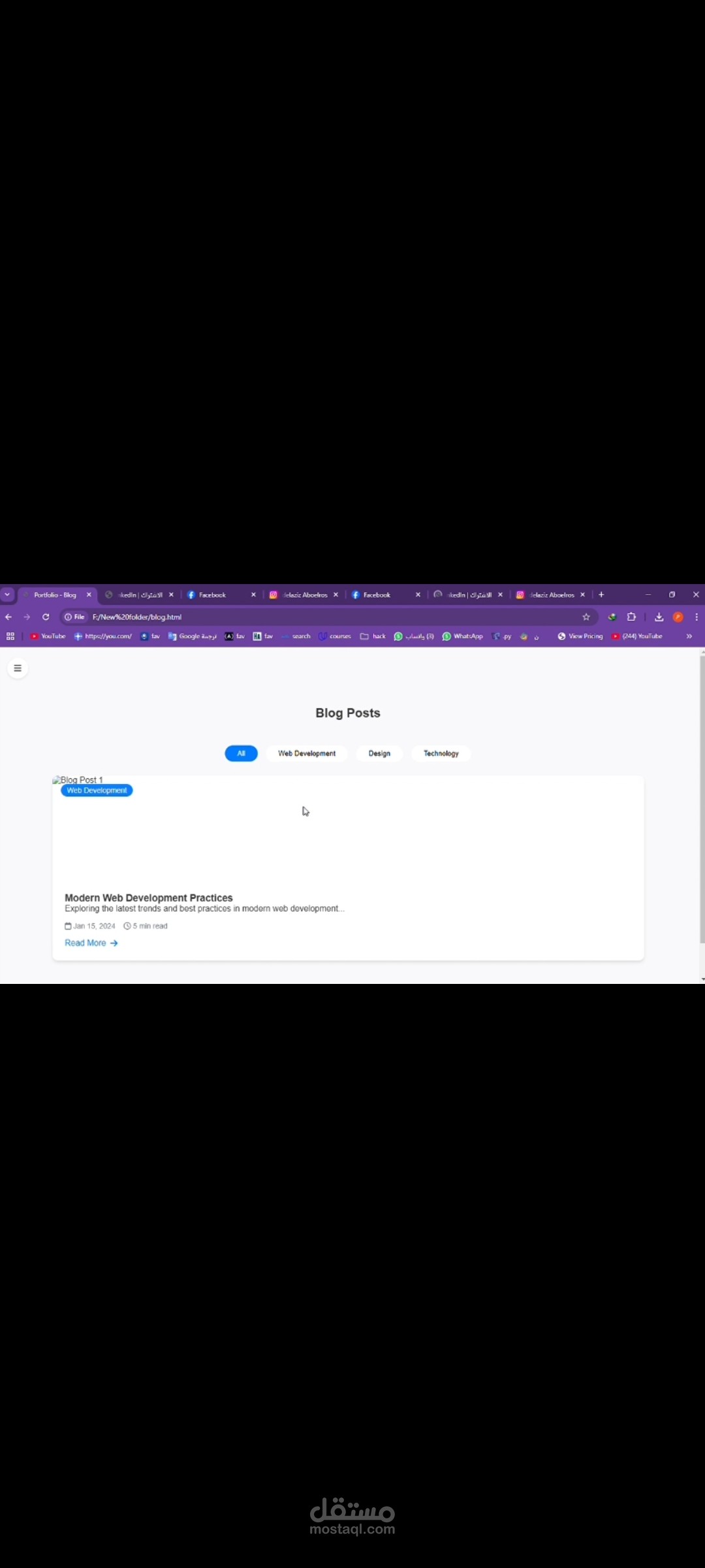 The blog section features categorized content about web development and technology. Posts can be filtered by category, and each includes a title, publishing date, estimated reading time, and a link to read the full post. This adds a personal and educational touch to the portfolio, reflecting Mahmoud’s interest in sharing knowledge and engaging with the tech community.