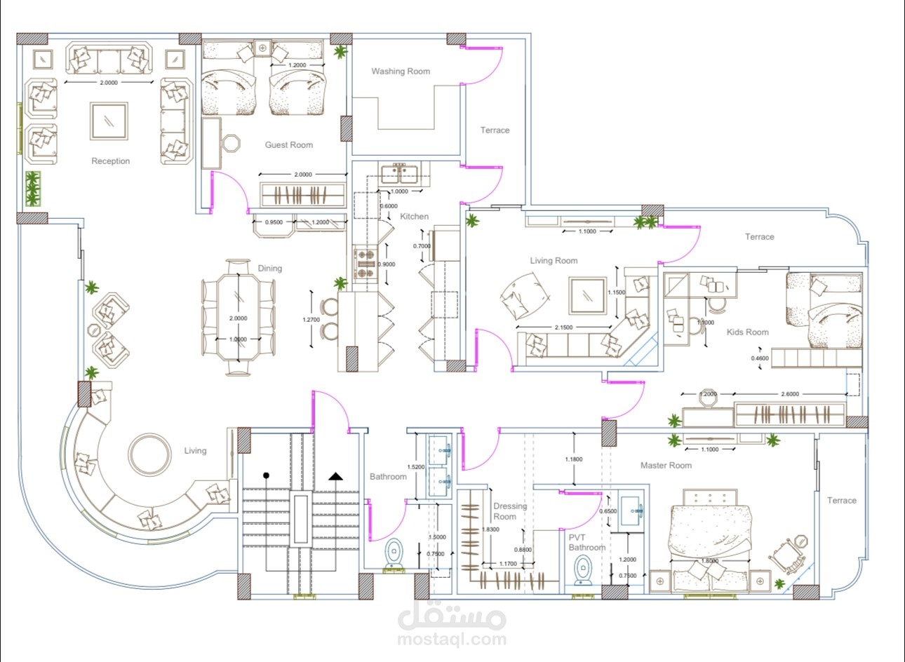 تصميم شقه بمساحه ١٦٠ متر مربع يتضمن الاثاث و التقسيم المعمارى مع الحفاظ على اماكن الاعمده