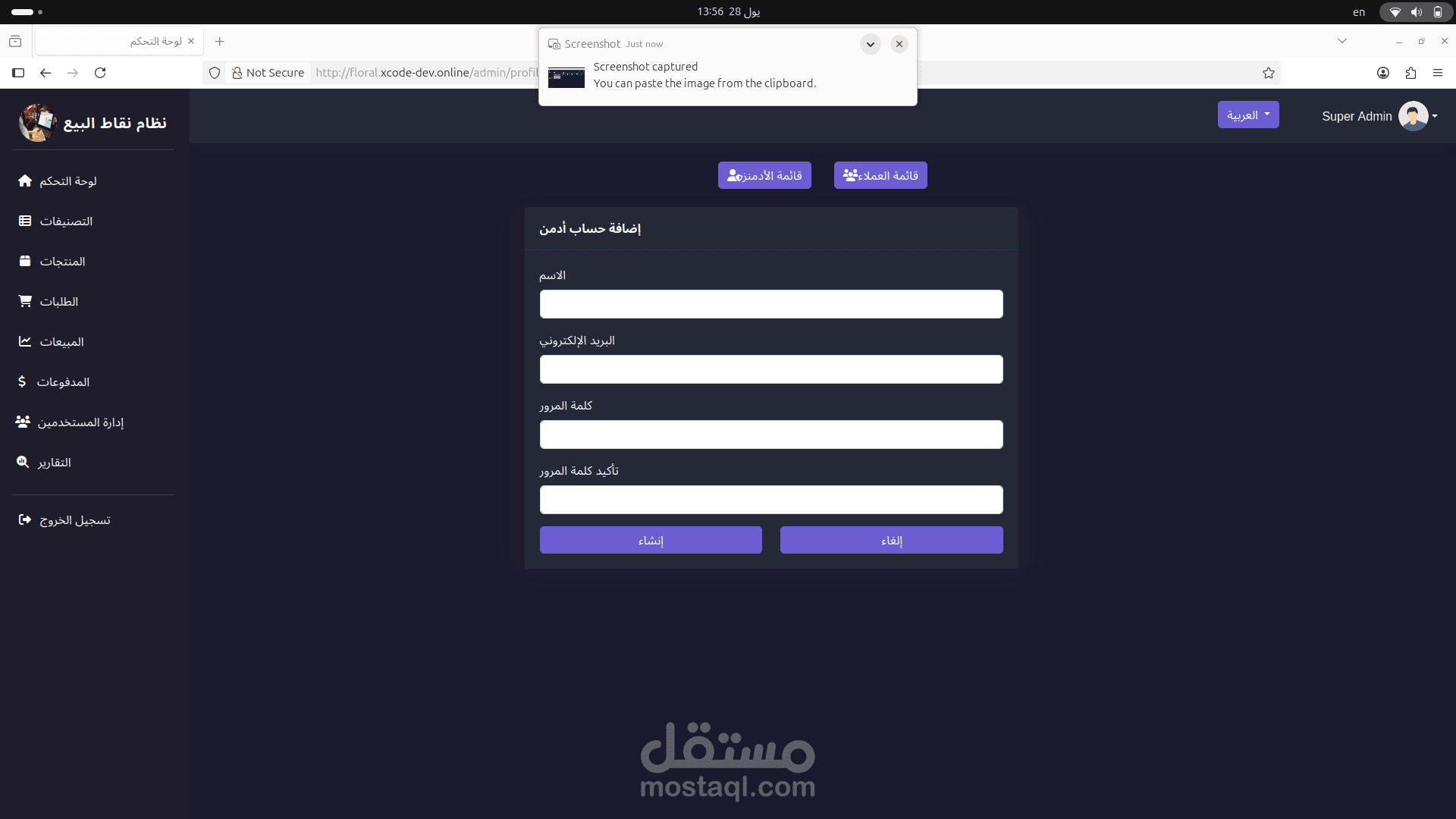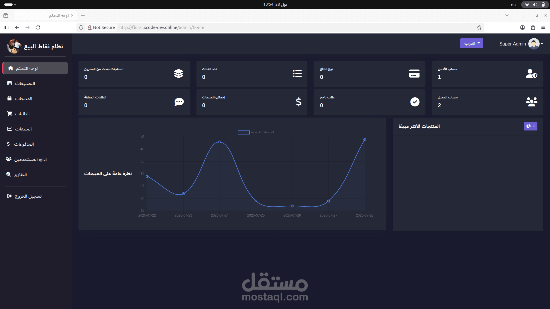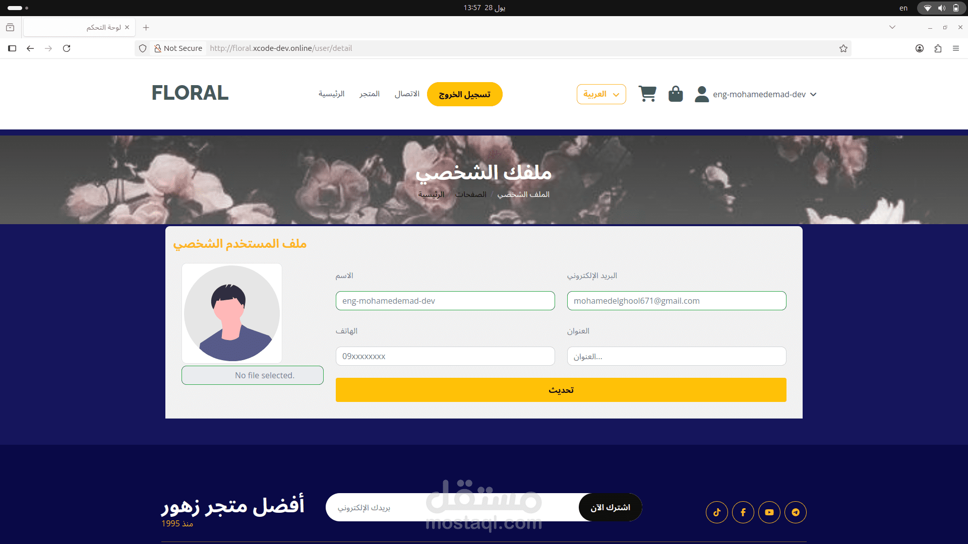 A fully integrated e-commerce website for managing a flower and gift shop. It allows users to browse products, purchase online, and choose suitable payment methods, with a powerful admin dashboard for managing orders, inventory, and sales. Developed with a modern interface supporting both Arabic and English, with full support for notifications and reports sign as admnin with email : superadmin@gmail.com,