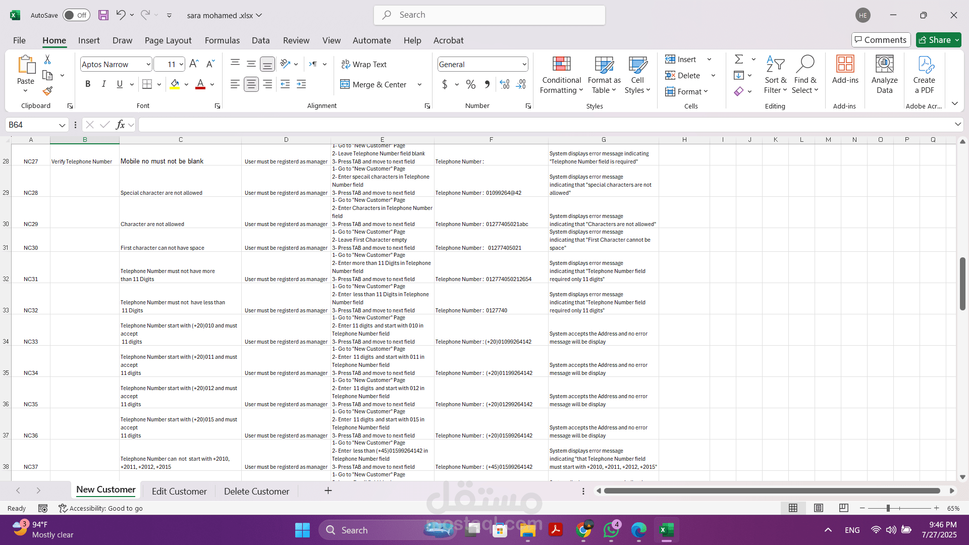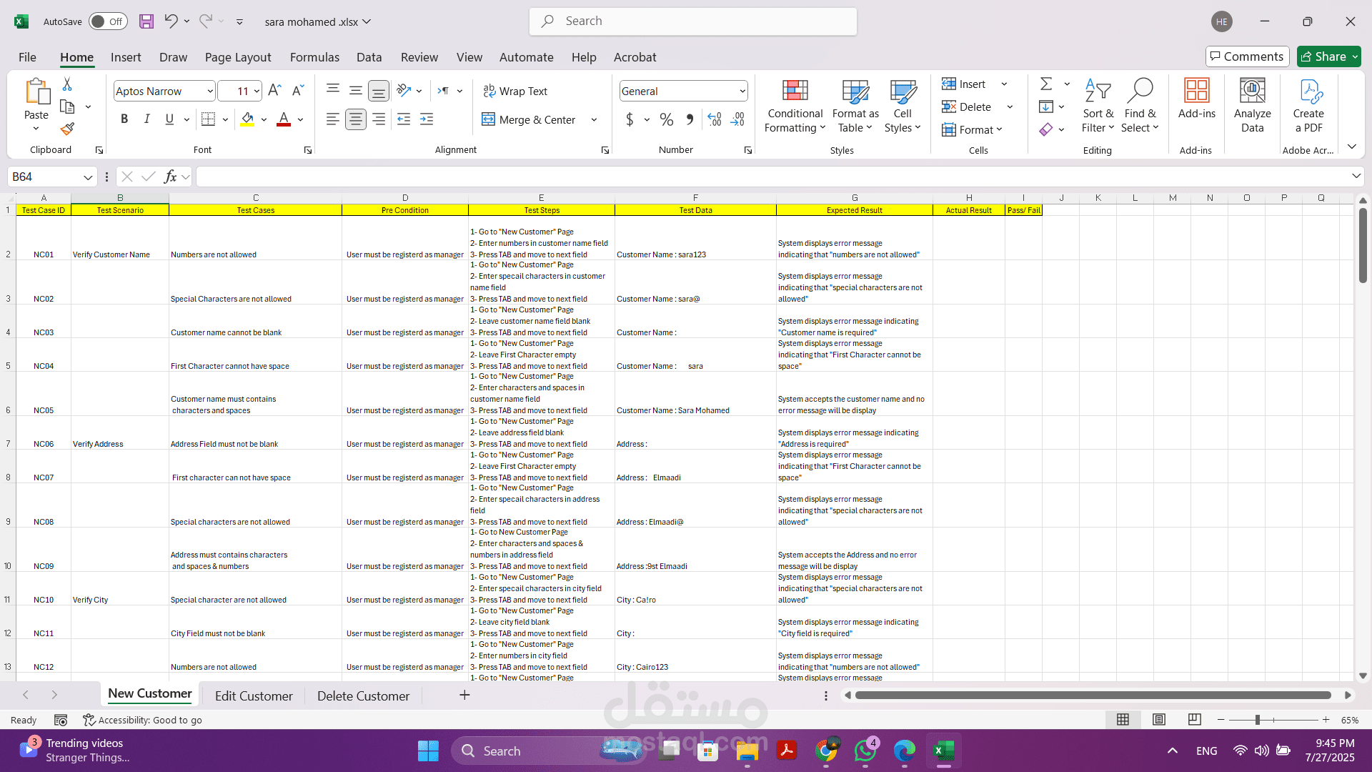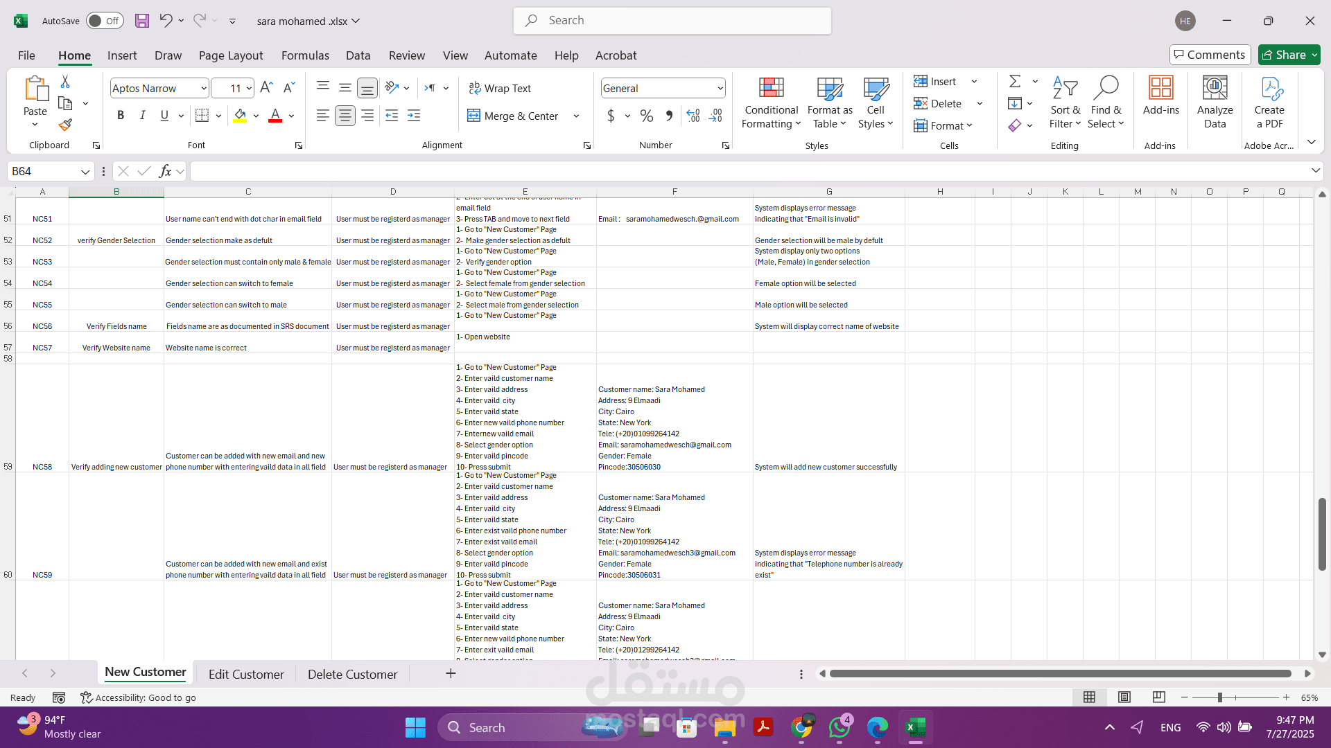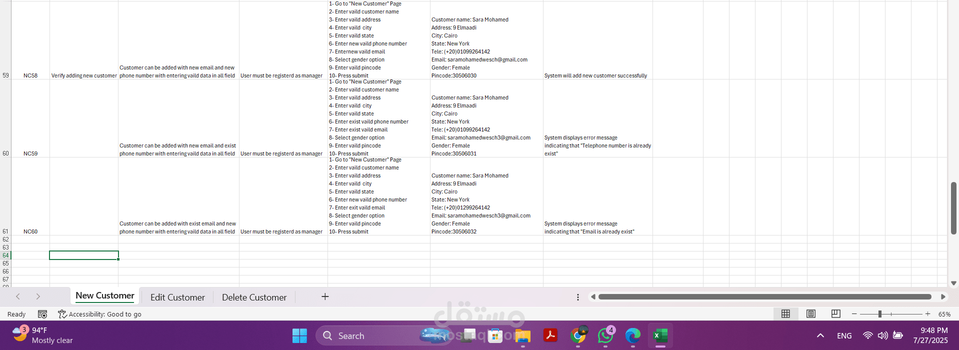 - تخطيط وتصميم حالات الاختبار (Test Cases): قمت بتطوير حالات اختبار مفصلة تغطي سيناريوهات إضافة عميل جديد، تعديل بيانات عميل حالي، وحذف عميل من النظام.