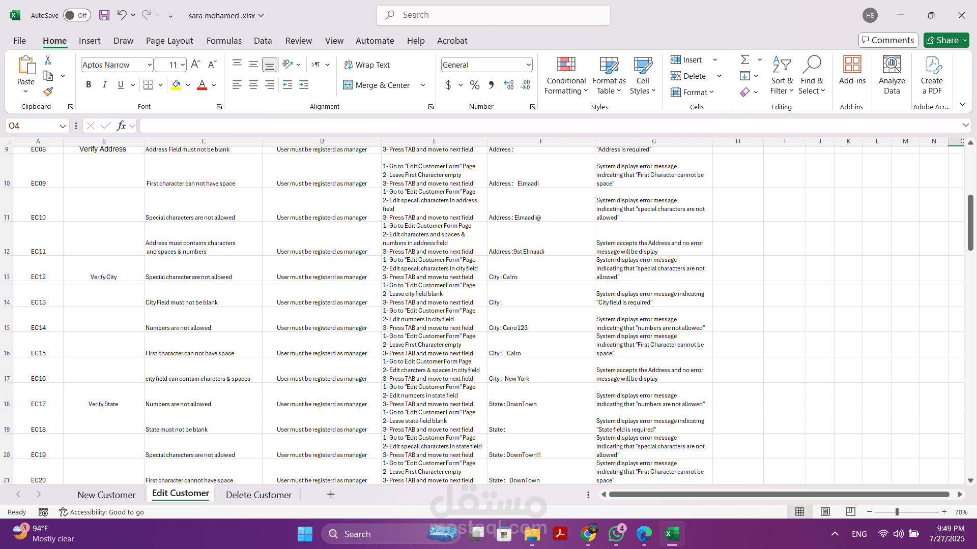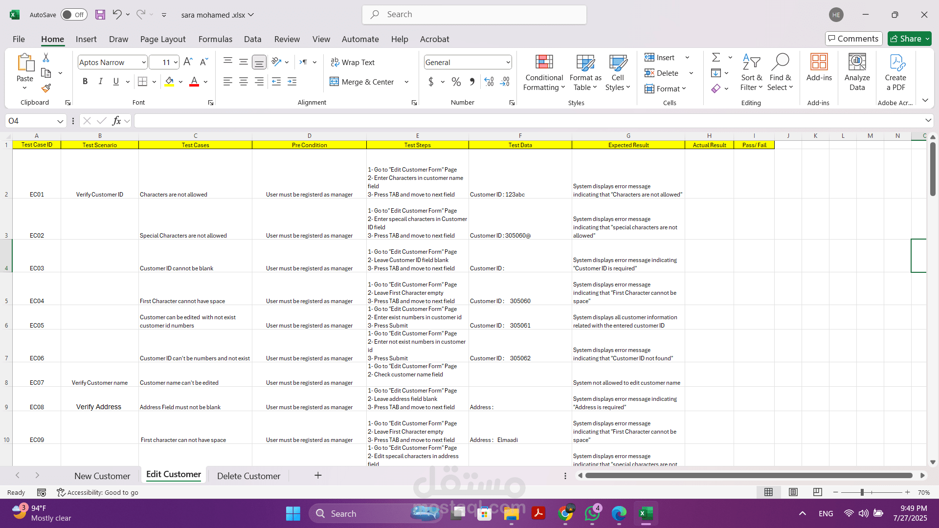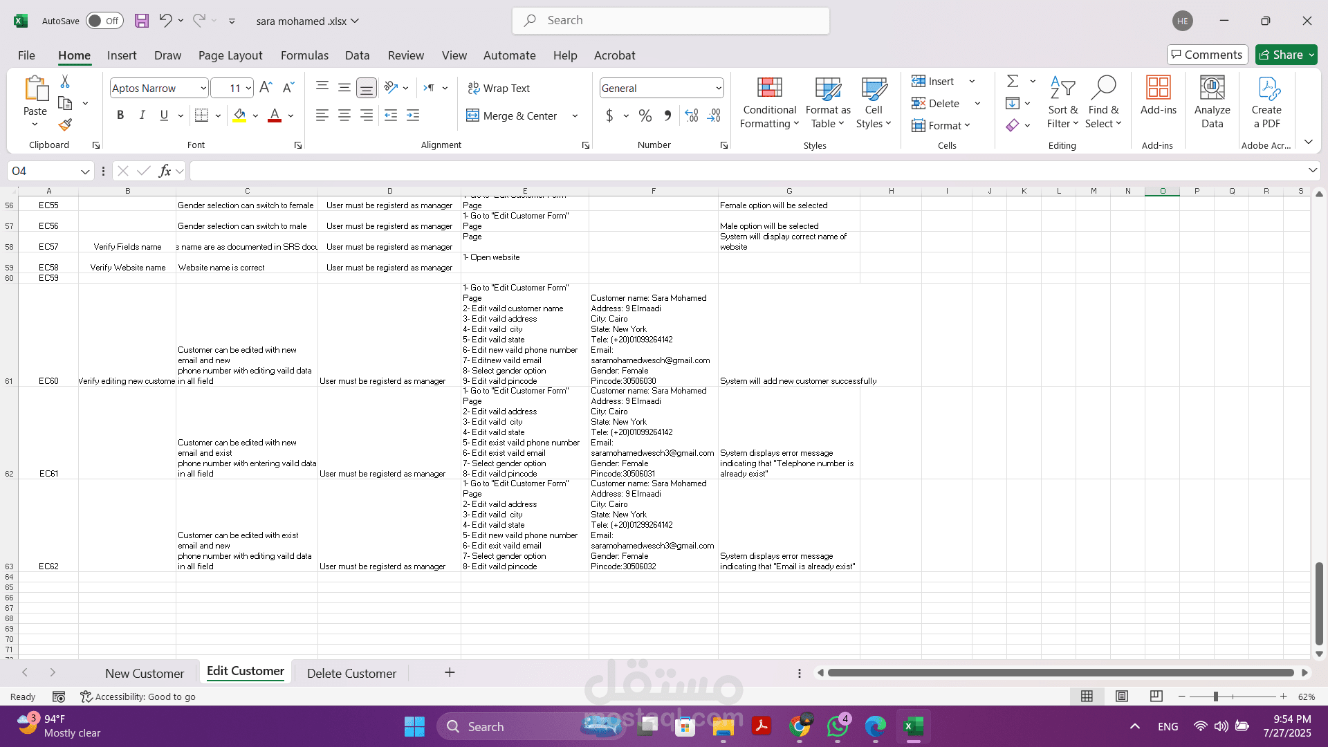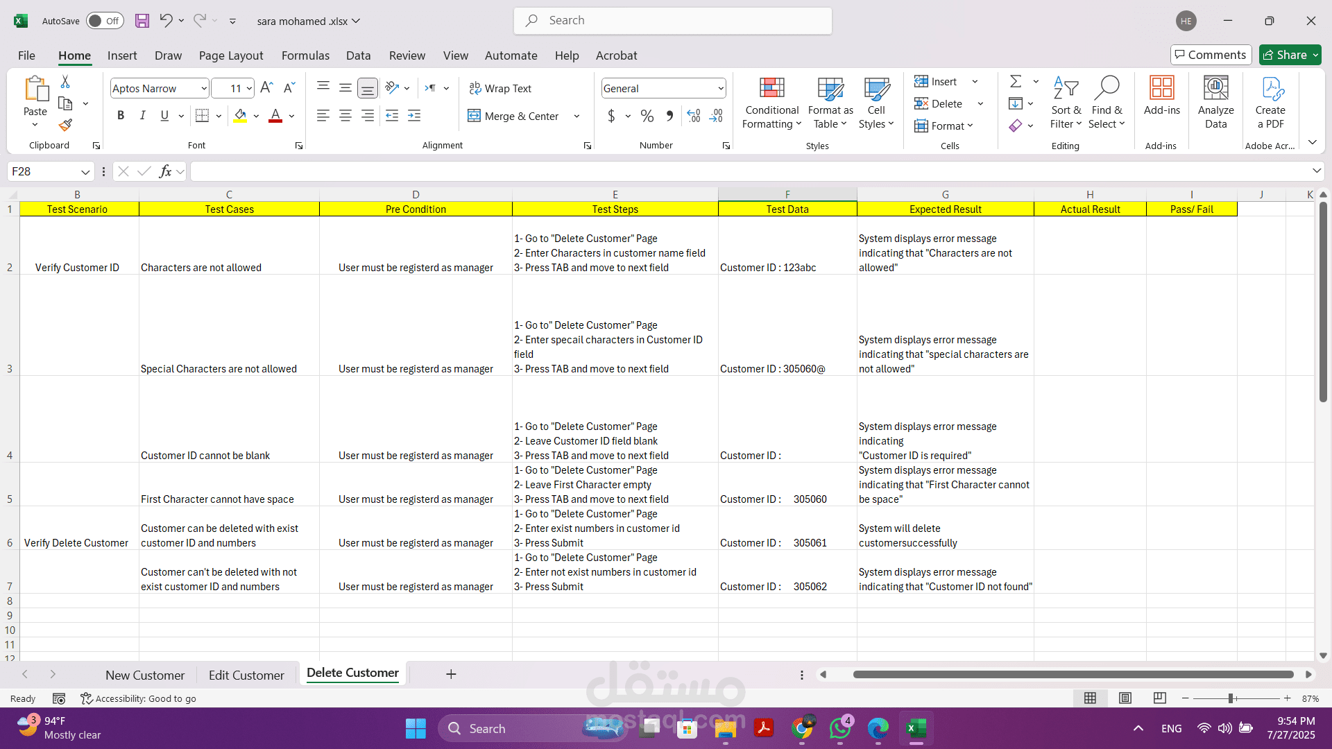 - تنفيذ الاختبارات اليدوية: قمت بتنفيذ هذه الحالات بدقة لضمان أن كل وظيفة تعمل كما هو متوقع وتلبي المتطلبات المحددة.