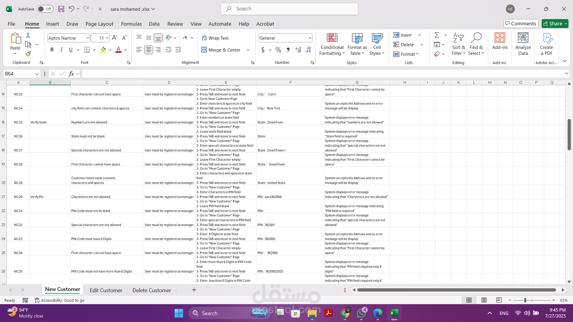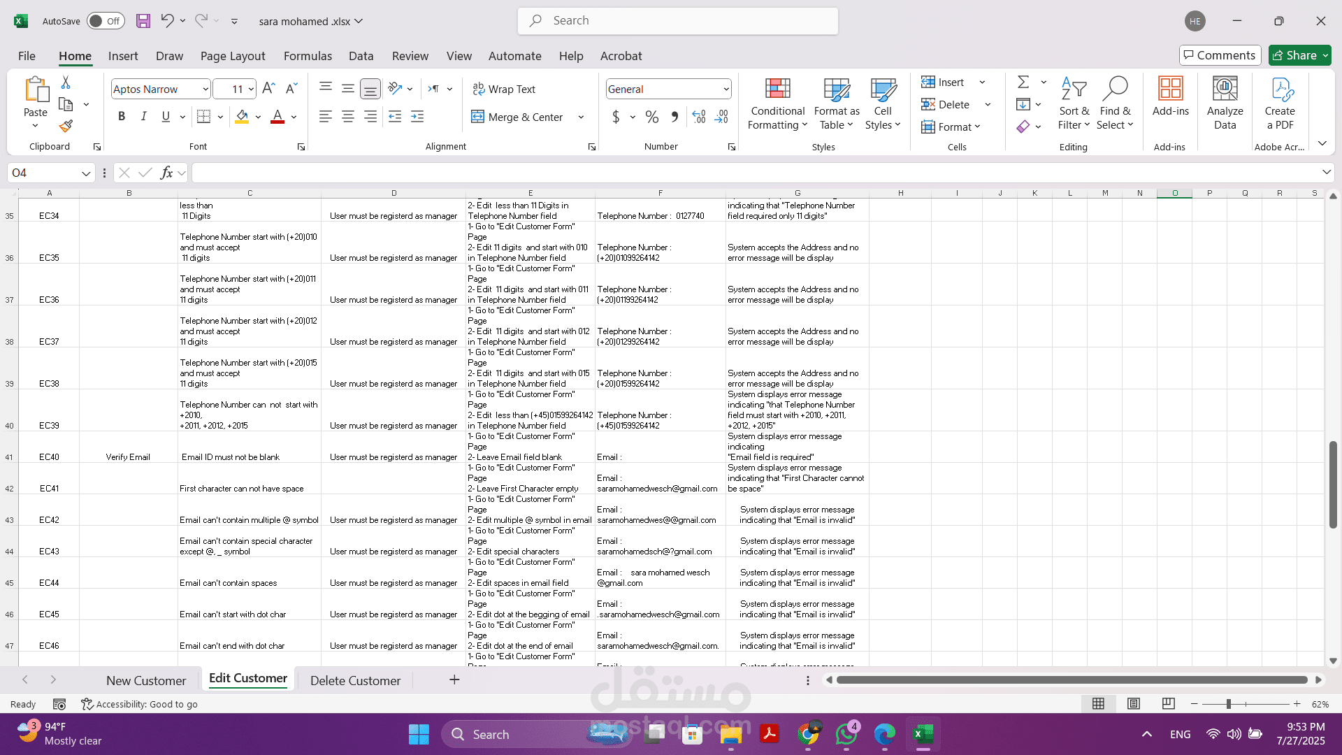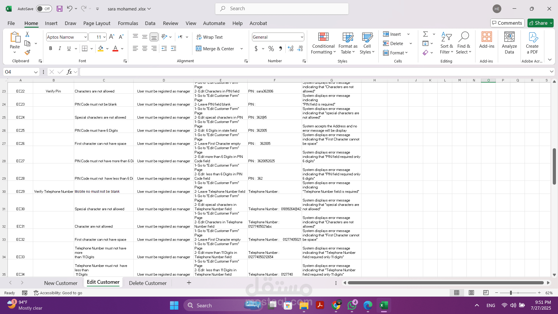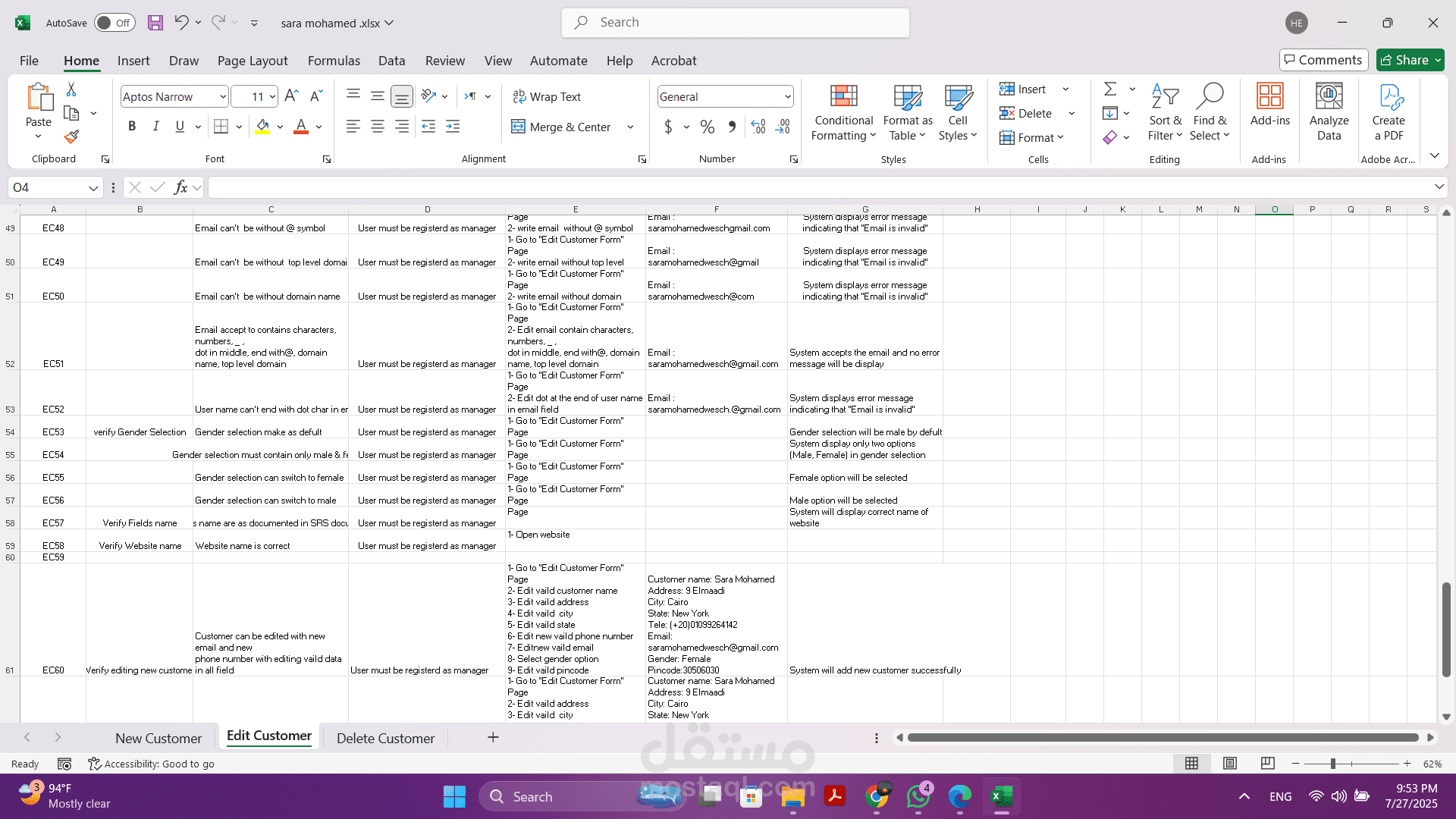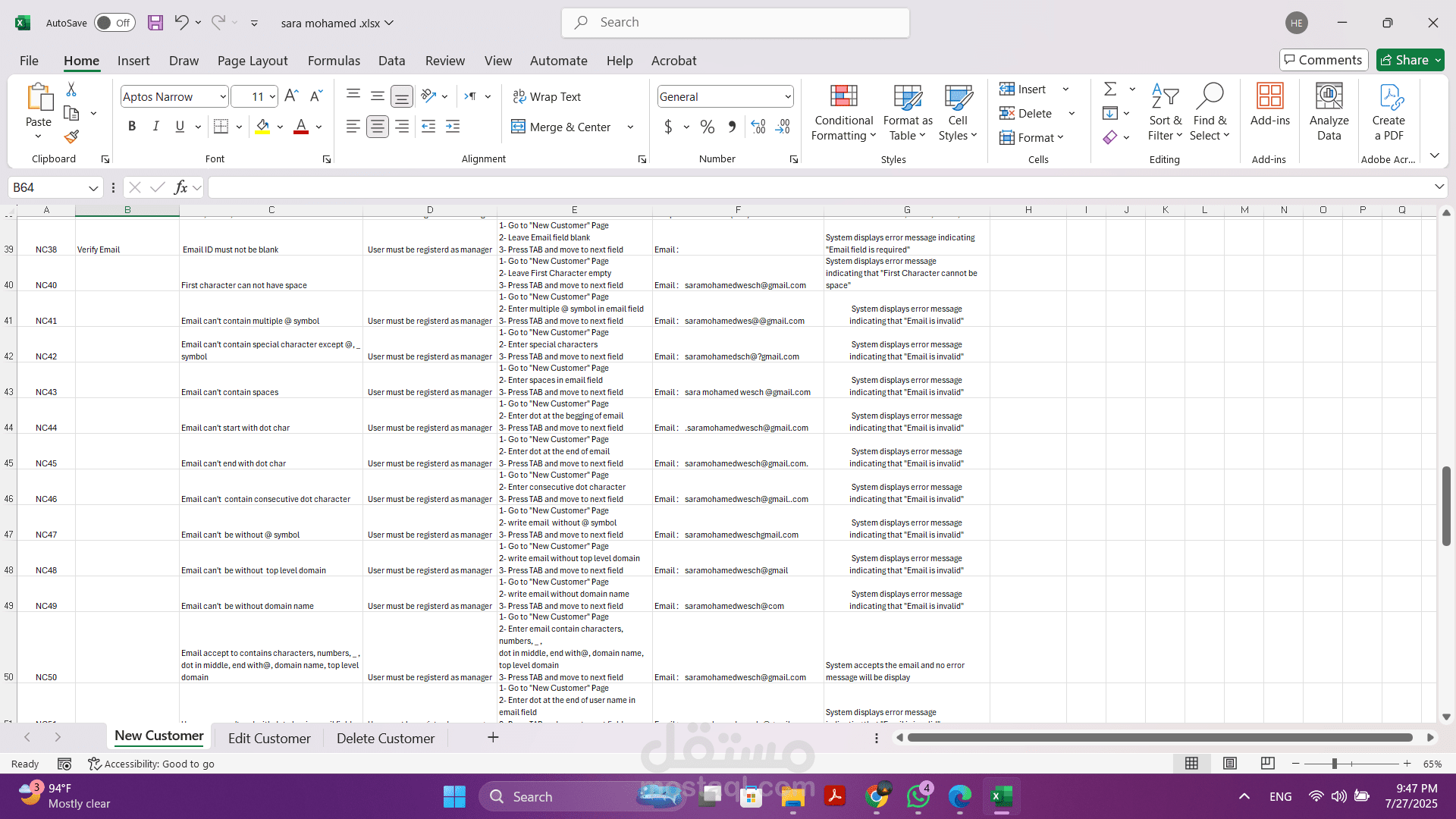 - تنفيذ الاختبارات اليدوية: قمت بتنفيذ هذه الحالات بدقة لضمان أن كل وظيفة تعمل كما هو متوقع وتلبي المتطلبات المحددة.