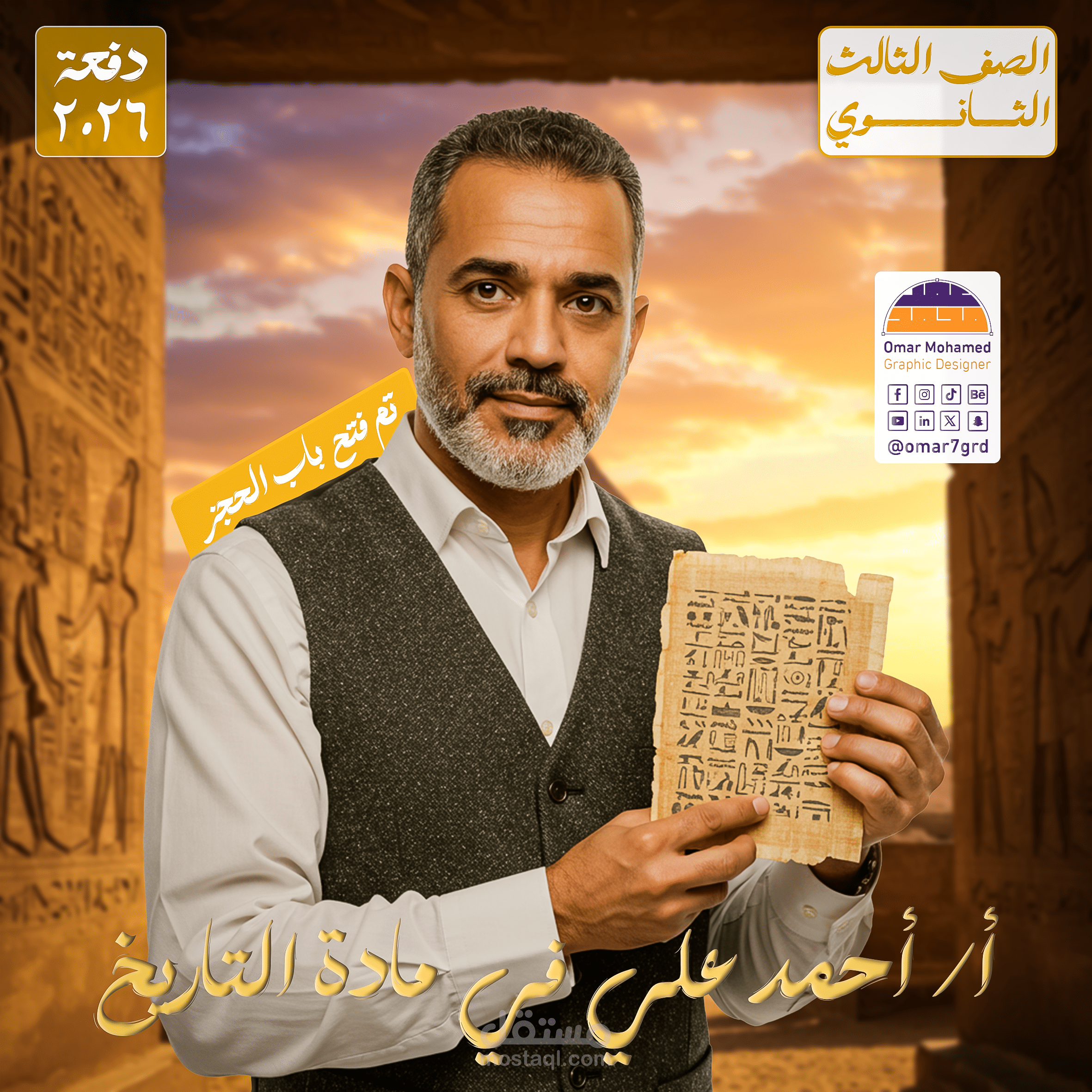هذا المشروع عبارة عن تصميم اعلاني للأستاذ أحمد علي، مدرس التاريخ لطلاب المرحلة الثانوية في مصر. الهدف الأساسي كان تصميم إعلان قوي وجذاب بصرياً لفتح باب الحجز للعام الدراسي ٢٠٢٦، مستهدفاً طلاب الصف الثالث الثانوي. الفكرة الجوهرية هي تجاوز الإعلانات التعليمية التقليدية وخلق هوية بصرية تضع الأستاذ كمرجع أساسي في مجاله، وتجعل من مادة التاريخ تجربة ملحمية وممتعة.
