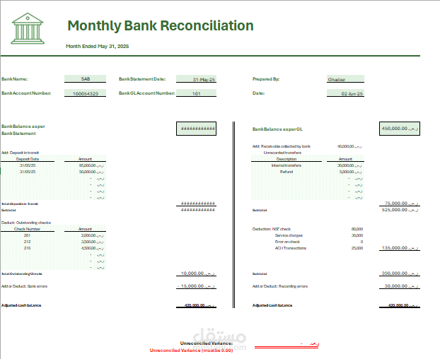 الملف يحتوي على صيغ ومعادلات تساعد في الوصول إلى الرصيد الصحيح بعد التسوية، ويُسهل اكتشاف الفروقات وحلها. مناسب للمحاسبين، مدراء الحسابات، أو رواد الأعمال اللي يحتاجوا نموذج بسيط لكن فعال لمتابعة حساباتهم البنكية.
