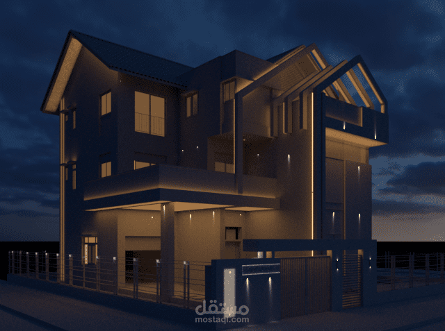 تصميم 3D للشكل الخارجي لفيلا سكنية مكونة من طابقين مع توزيع الاضاءات