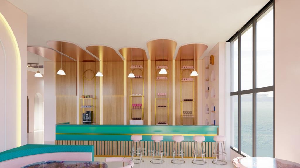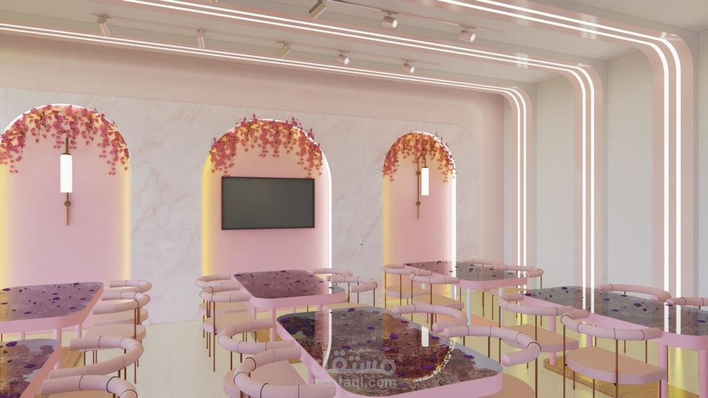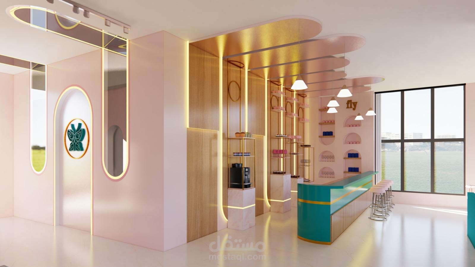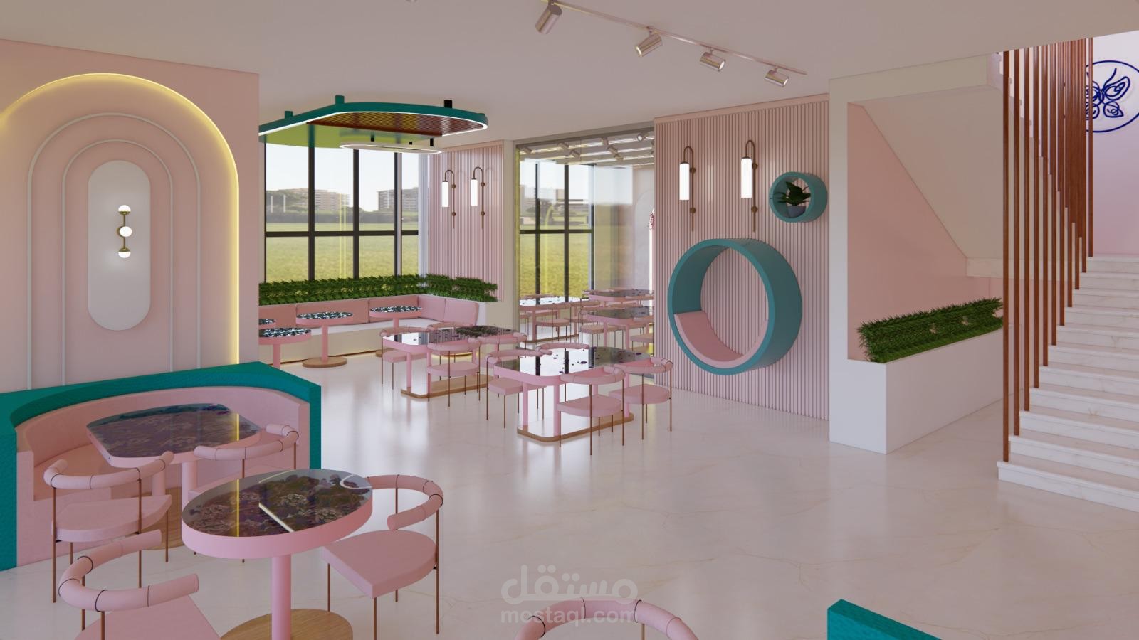 يُنفَّذ المطعم كمساحة راقية مخصصة للنساء، مستوحاة من رمز الفراشة كعنصر تصميمي أساسي يعكس الرقة، الأنوثة، والتحول. يعتمد التصميم الداخلي على خطوط منحنية ناعمة وتفاصيل خفيفة مستوحاة من أجنحة الفراشة، سواء في تشكيل الأسقف أو توزيع الإضاءة والديكور الجداري. الألوان المستخدمة تتراوح بين درجات الباستيل الهادئة والذهبي أو النحاسي اللامع، مما يعزز الإحساس بالرقي والخصوصية. تُستخدم خامات ناعمة مثل المخمل، الزجاج المزخرف، والأرضيات اللامعة لإكمال الجو العام. تتوزع مناطق الجلوس ضمن فراغ مفتوح بتقسيمات مرنة تتيح الخصوصية، مع وحدات إضاءة معلّقة مستوحاة من شكل الفراشة تضفي طابعاً بصرياً فريداً. يحقق التصميم تجربة أنثوية متكاملة، راقية وهادئة، تعكس روح الفراشة وتقدّم بيئة ضيافة مميزة ومريحة
