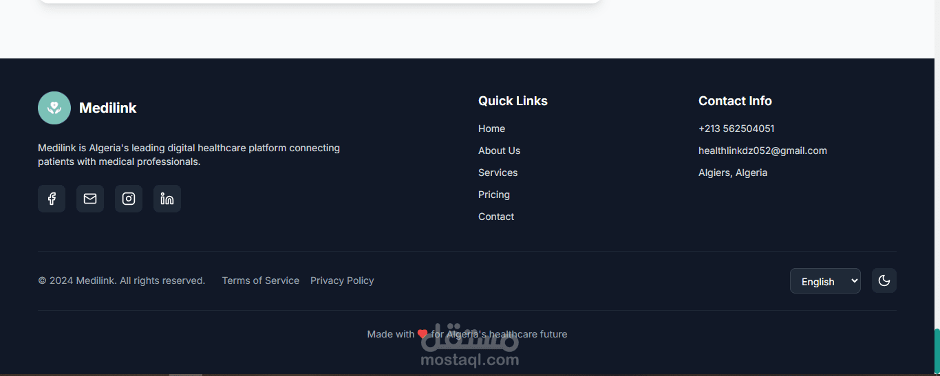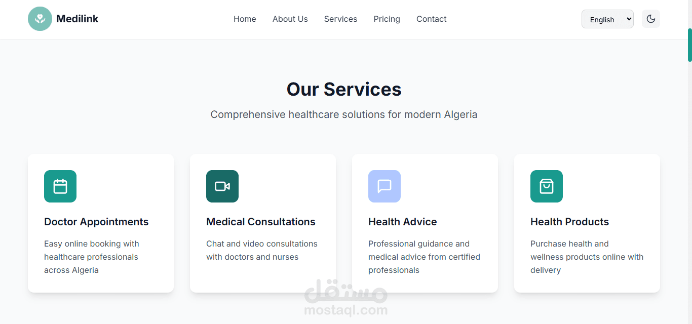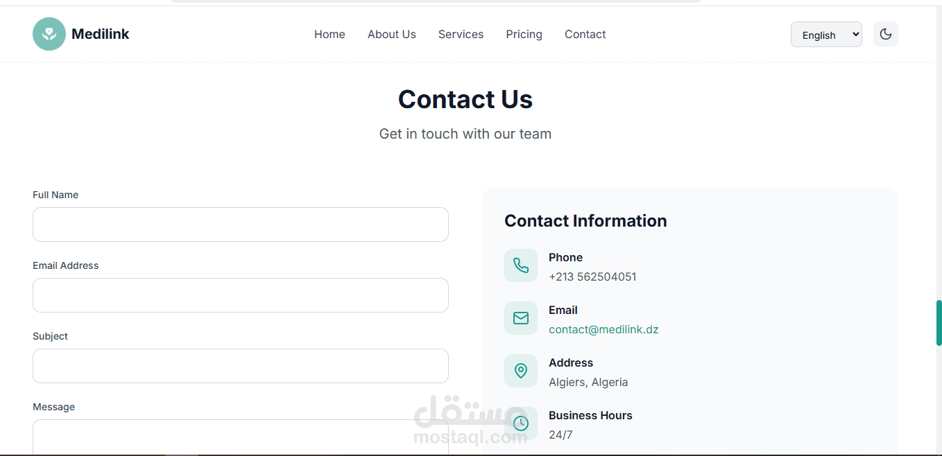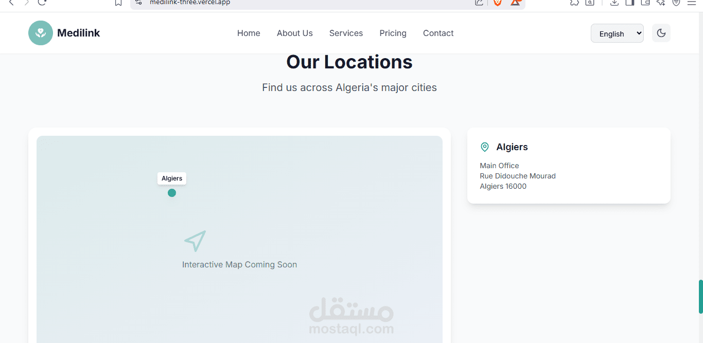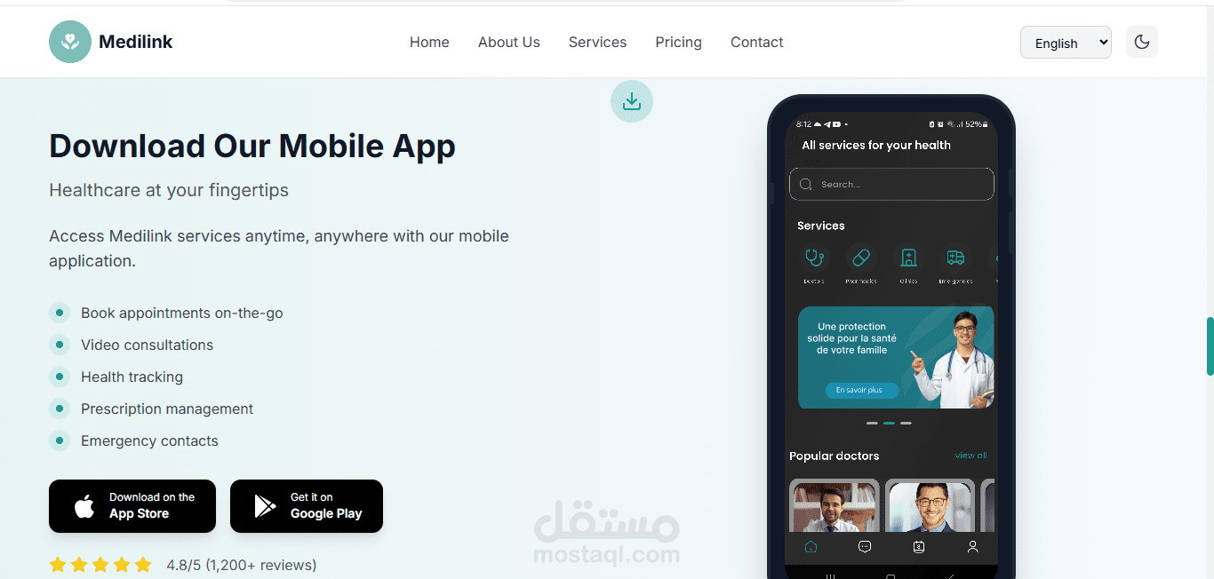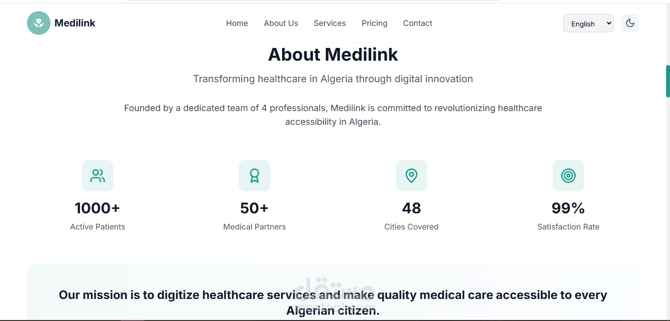 هذه صفحة هبوط متجاوبة مصممة لتعريف تطبيق ميديلينك. تدعم لغات متعددة (العربية، الإسبانية، الإنجليزية، والفرنسية) وتتضمن أقسامًا لفريق المشروع، الخدمات، عنا، روابط تحميل التطبيق، التسعير، موقع الشركة، وقسم التواصل معنا. يتضمن التذييل معلومات اتصال إضافية.
