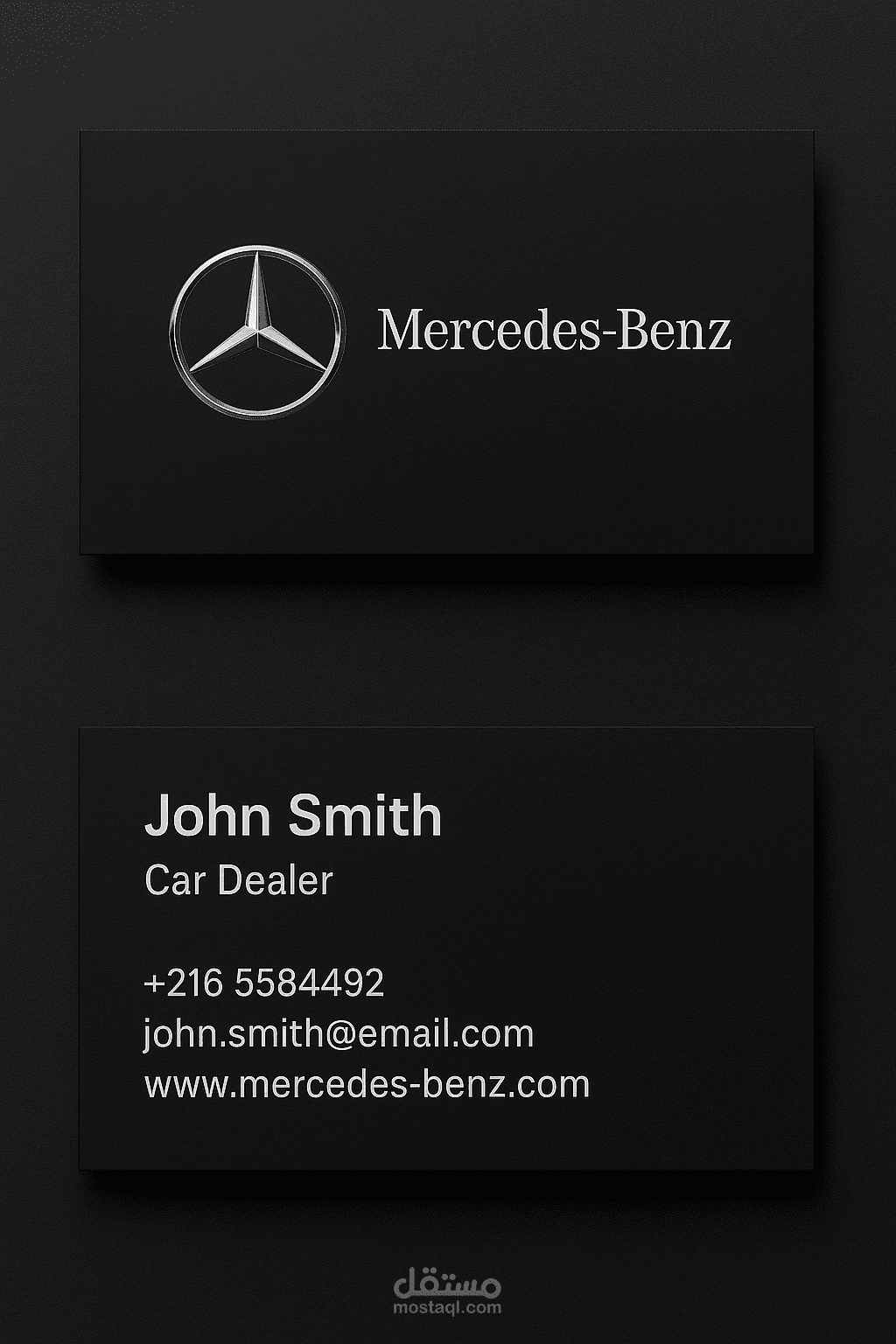 بطاقة عمل بتصميم أنيق واحترافي، تم تنفيذها بأسلوب عصري يعكس الفخامة والاحترافية المرتبطة بعلامة Mercedes-Benz.