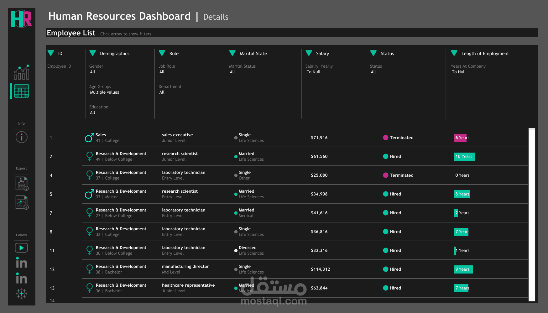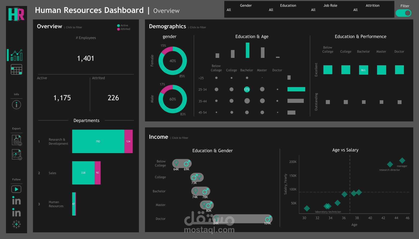 -تحليل دقيق لبيانات الموظفين مثل الجنس، التعليم، الأداء، الراتب، العمر، الحالة الاجتماعية وغيرها.