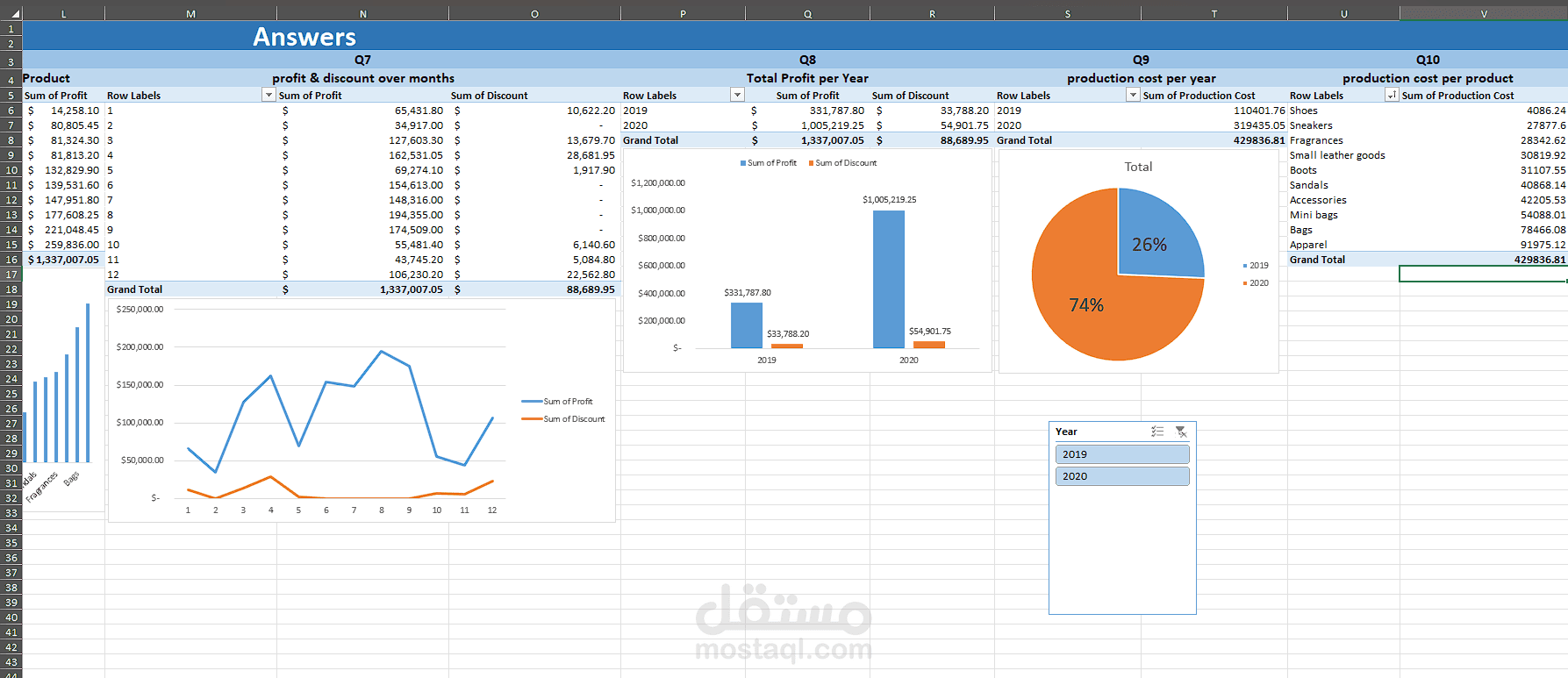 مشروع تحليل بيانات مبيعات متجر باستخدام برنامج Excel، بهدف فهم الأداء العام للمبيعات، وتحديد المنتجات الأكثر ربحًا وتكلفة، وتحليل الفروقات بين السنوات المختلفة من حيث الأرباح والتكلفة والخصومات.