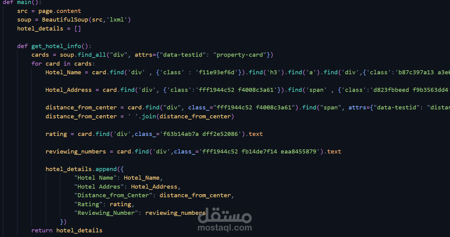 هذا المشروع عبارة عن أداة استخراج بيانات ويب مبنية باستخدام بايثون لجمع معلومات الفنادق المنظمة من Booking بناءً على مدينة ونطاق زمني محددين. يؤتمت هذا المشروع عملية زيارة صفحات نتائج البحث، ويستخرج تفاصيل الفندق مثل الاسم والسعر والتقييم والموقع وعدد التقييمات، ويحفظ البيانات في ملف نظيف ومنظم للتحليل أو الاستخدام التجاري.