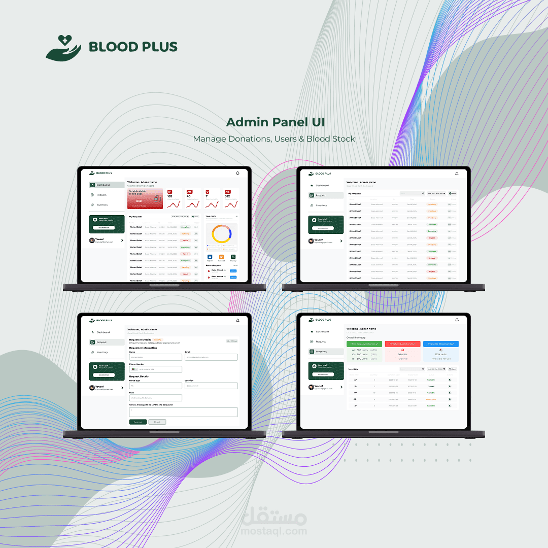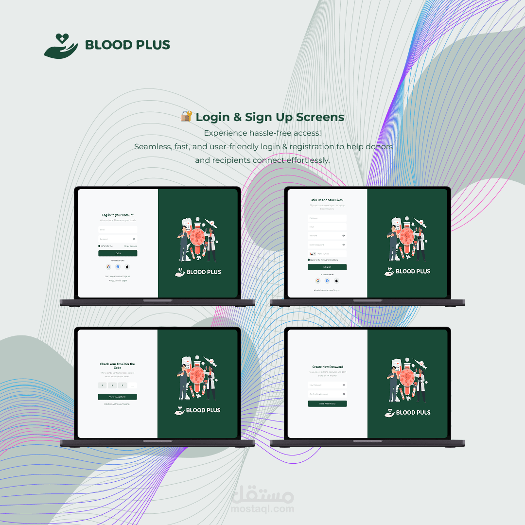 تصميم واجهات تطبيق خاص ببنك الدم يهدف لتسهيل عملية التبرع بالدم وربط المتبرعين بالمستشفيات والبنوك القريبة.