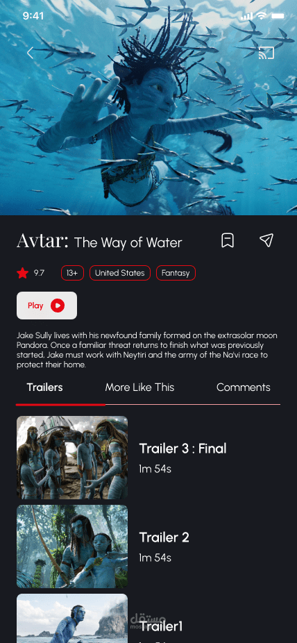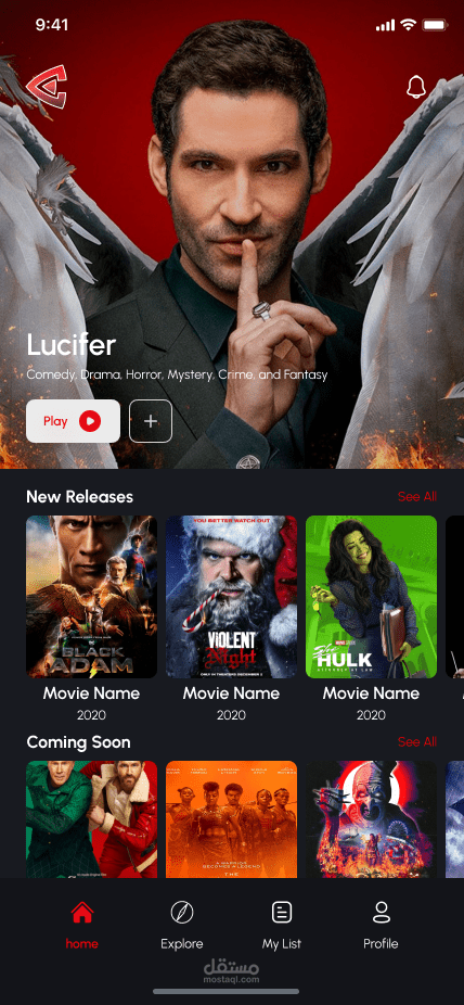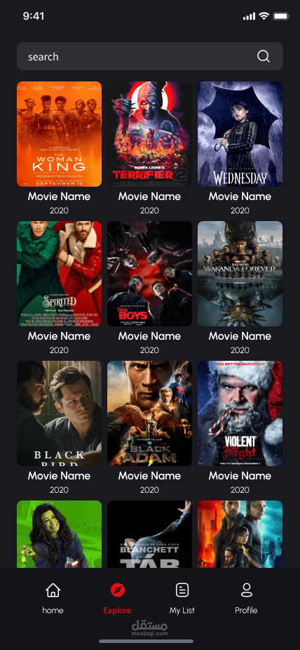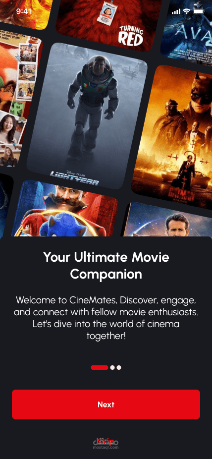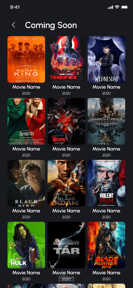 يحتوي التطبيق على أقسام مخصصة للفئات، قوائم التوصيات، صفحة تفاصيل الفيلم، المشاهدة لاحقًا، وحساب المستخدم، مع تجربة مستخدم سلسة ومظهر عصري يناسب مستخدمي تطبيقات الترفيه.