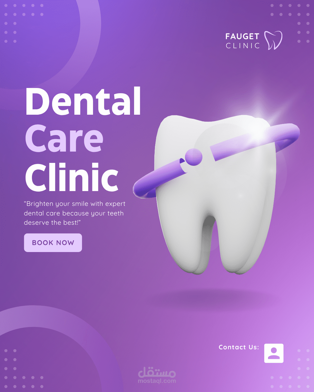 الحملة الأولى: إعلان دعائي لعيادة أسنان يشمل عروضًا مجانية وخدمات مثل التنظيف والفحص الدوري، مع اعتماد ألوان هادئة وتصميم يعكس النظافة والاحتراف الطبي.