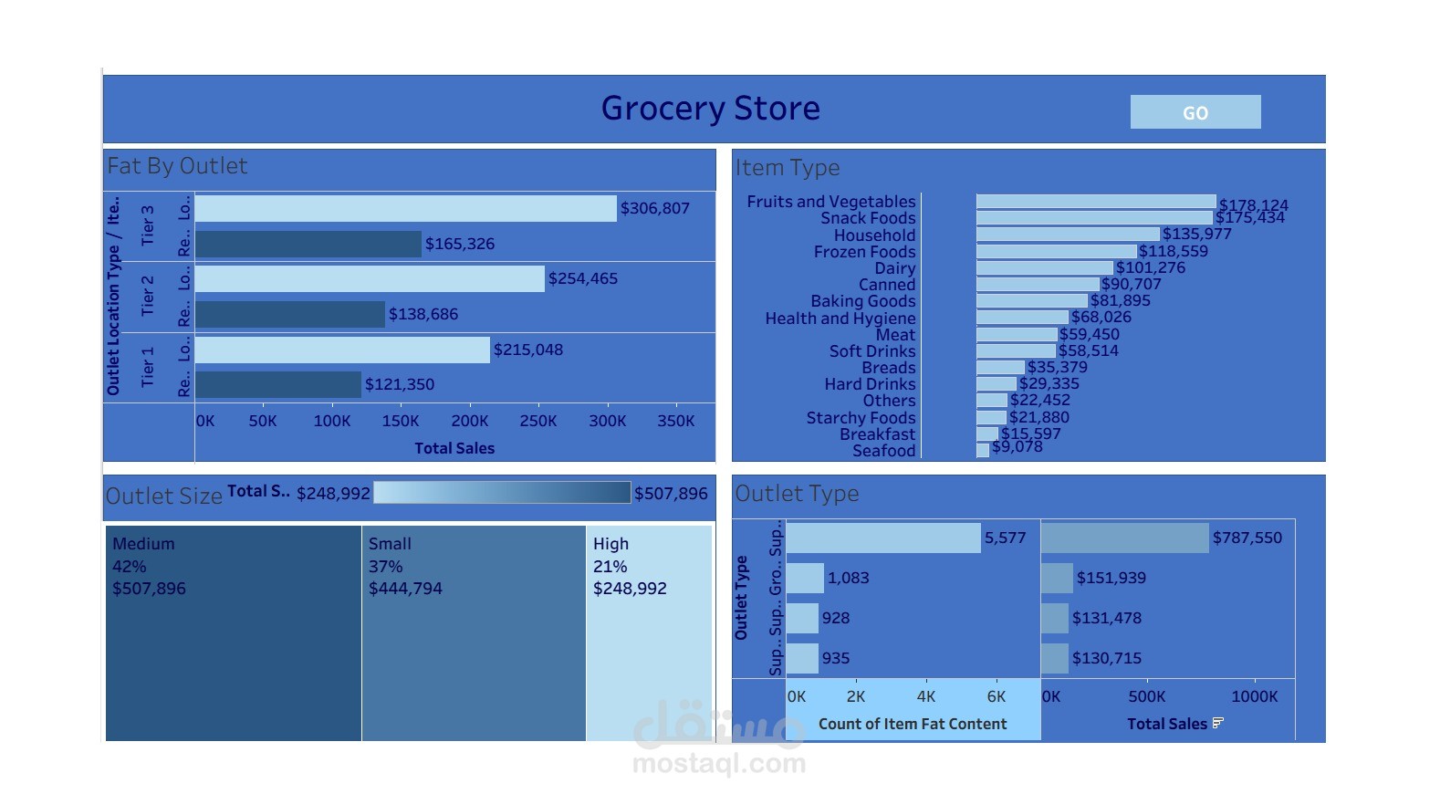 This Dashboard about Grocery Store tells us about some charts like bar charts for fat by outlet, item type, outlet size and outlet type toward sales.