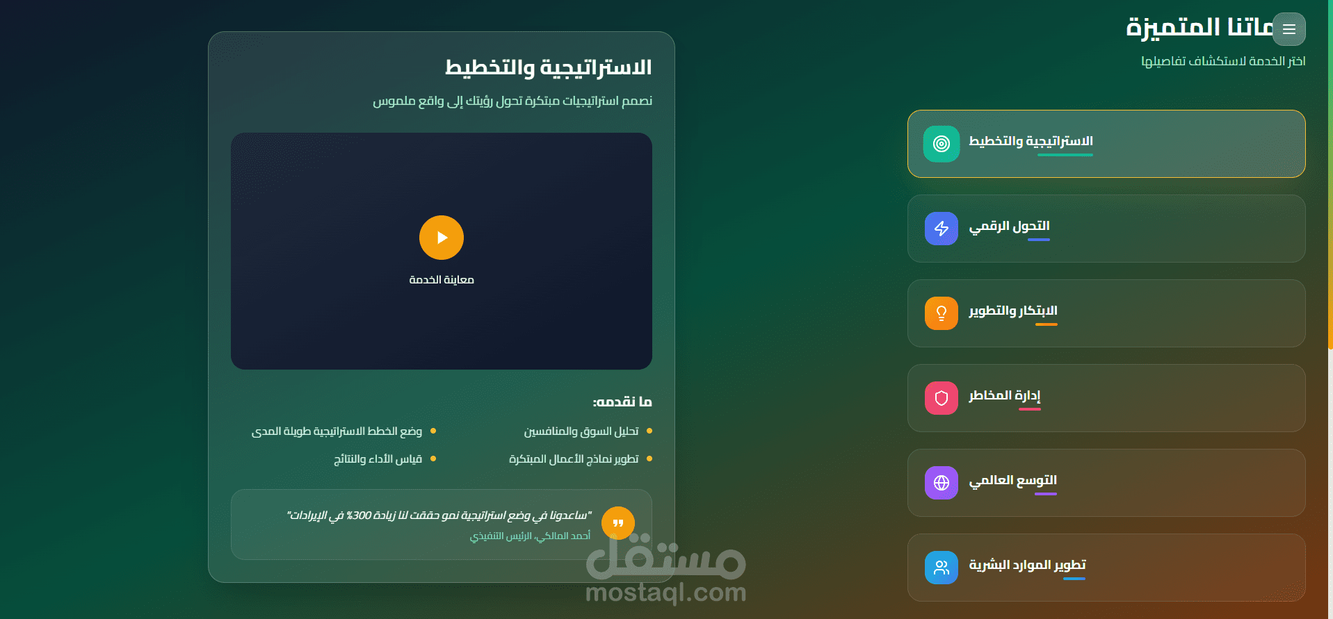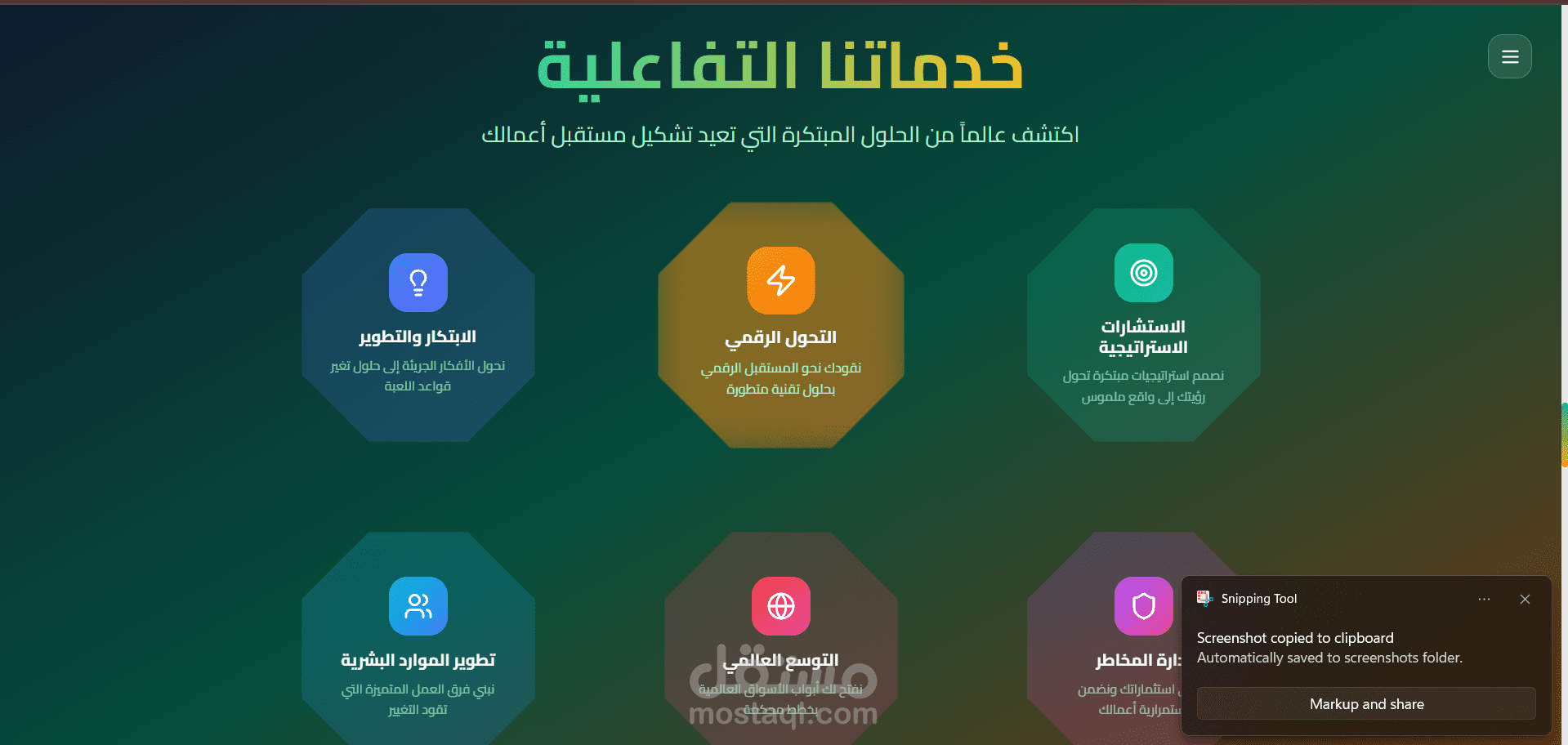 يركّز الموقع على إبهار الزائر من خلال تصميم سينمائي، عناصر تفاعلية ثلاثية الأبعاد، وسرد بصري يحكي قصة الشركة، رؤيتها، وخدماتها. ليس مجرد موقع، بل رحلة رقمية تمزج بين الفن والتقنية، موجهة للشركات الطموحة الباحثة عن التميز والشراكة المؤثرة.