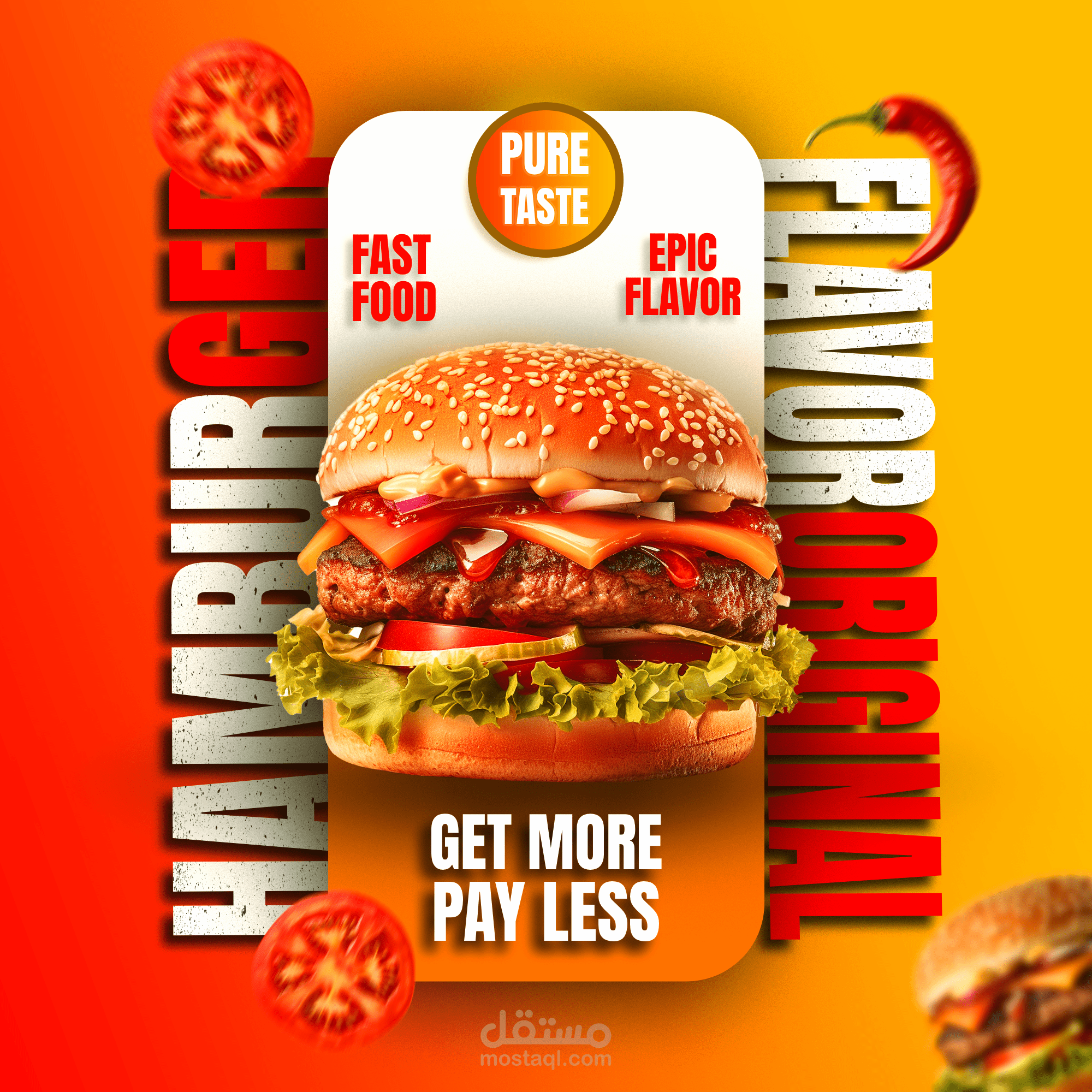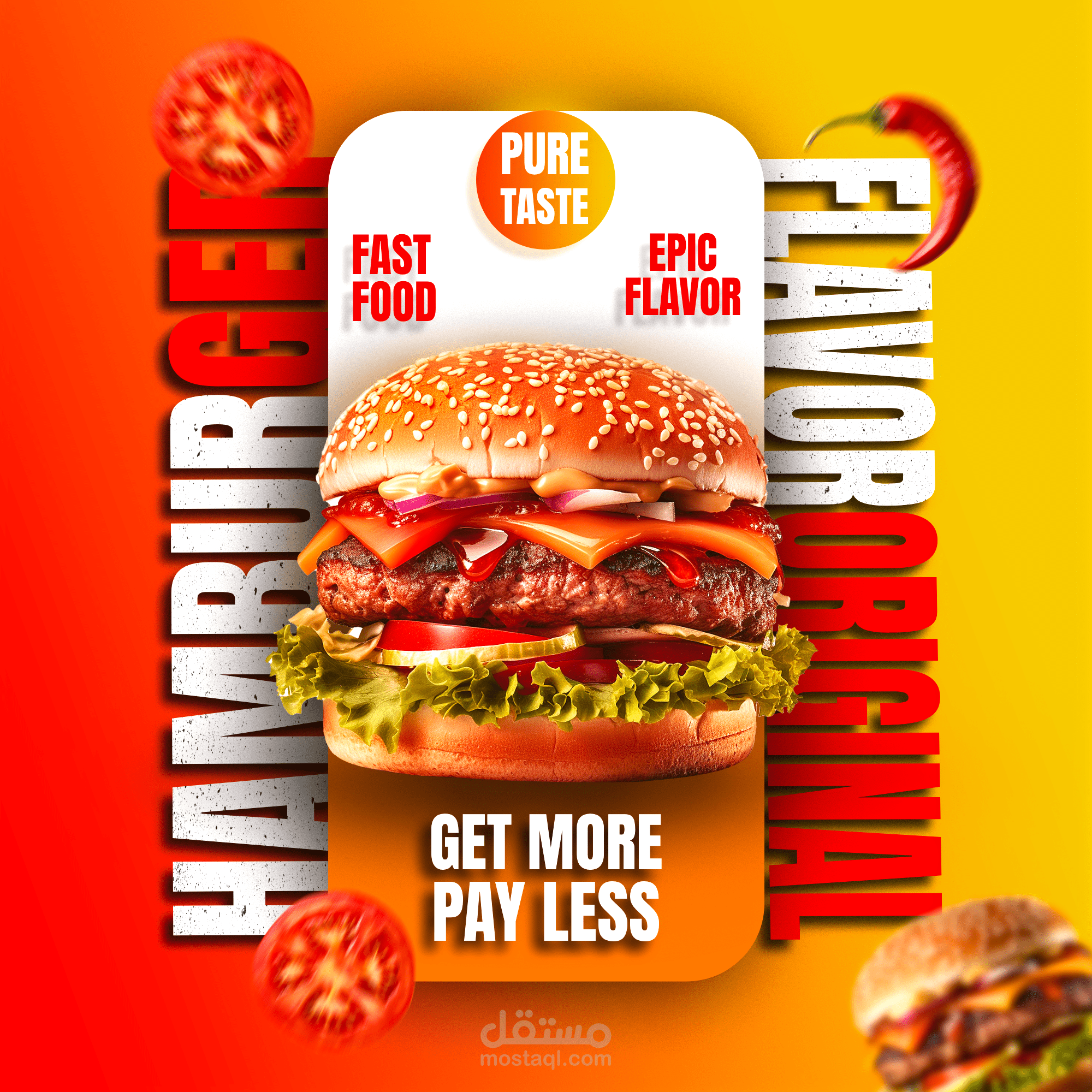 تصميم دعائي احترافي يناسب الإعلانات التجارية والمطاعم والمنتجات الغذائية. يتميز بالتوازن البصري، واستخدام الألوان الملفتة، وتوظيف النصوص بطريقة تعزز الرسالة التسويقية.