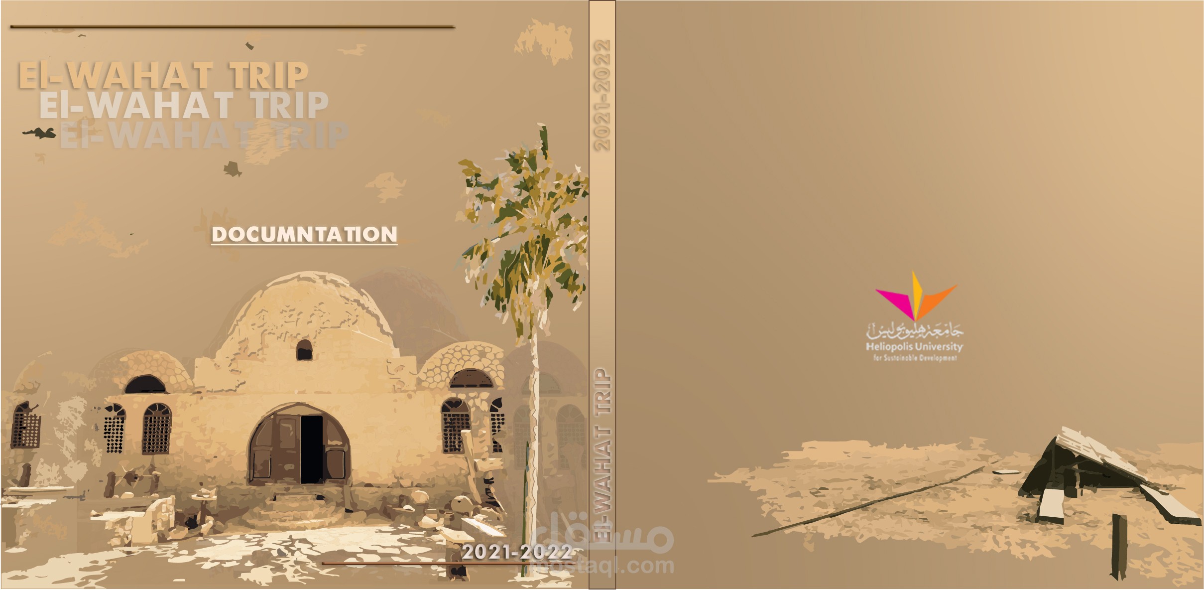 تم تنفيذ تصميم غلاف مخصص لكتاب توثيقي بعنوان El-Wahat Trip يوثّق رحلة ميدانية إلى منطقة الواحات، بتنظيم من جامعة هليوبوليس للتنمية المستدامة.