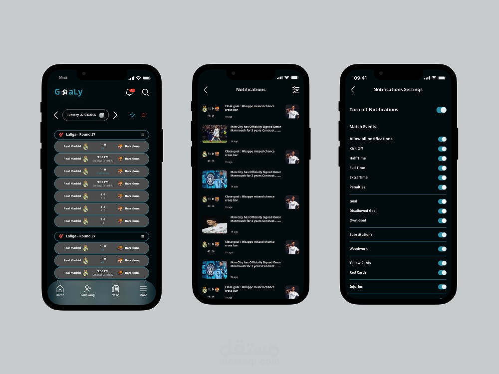 Goaly هو تطبيق موبايل لعشّاق كرة القدم يتيح لهم معرفة مواعيد المباريات ومتابعة الأحداث المباشرة، الأخبار، والانتقالات — مع تجربة مخصصة حسب الفرق واللاعبين والمسابقات المفضلة لديهم. يتمحور التطبيق حول التخصيص والبساطة، ويقدّم منطقة جماهير خاصة بكل مباراة ليتفاعل فيها المشجّعون أثناء البث المباشر، مما يوفّر تجربة ممتعة وواقعية بدون تشويش أو تحديثات غير مهمة.