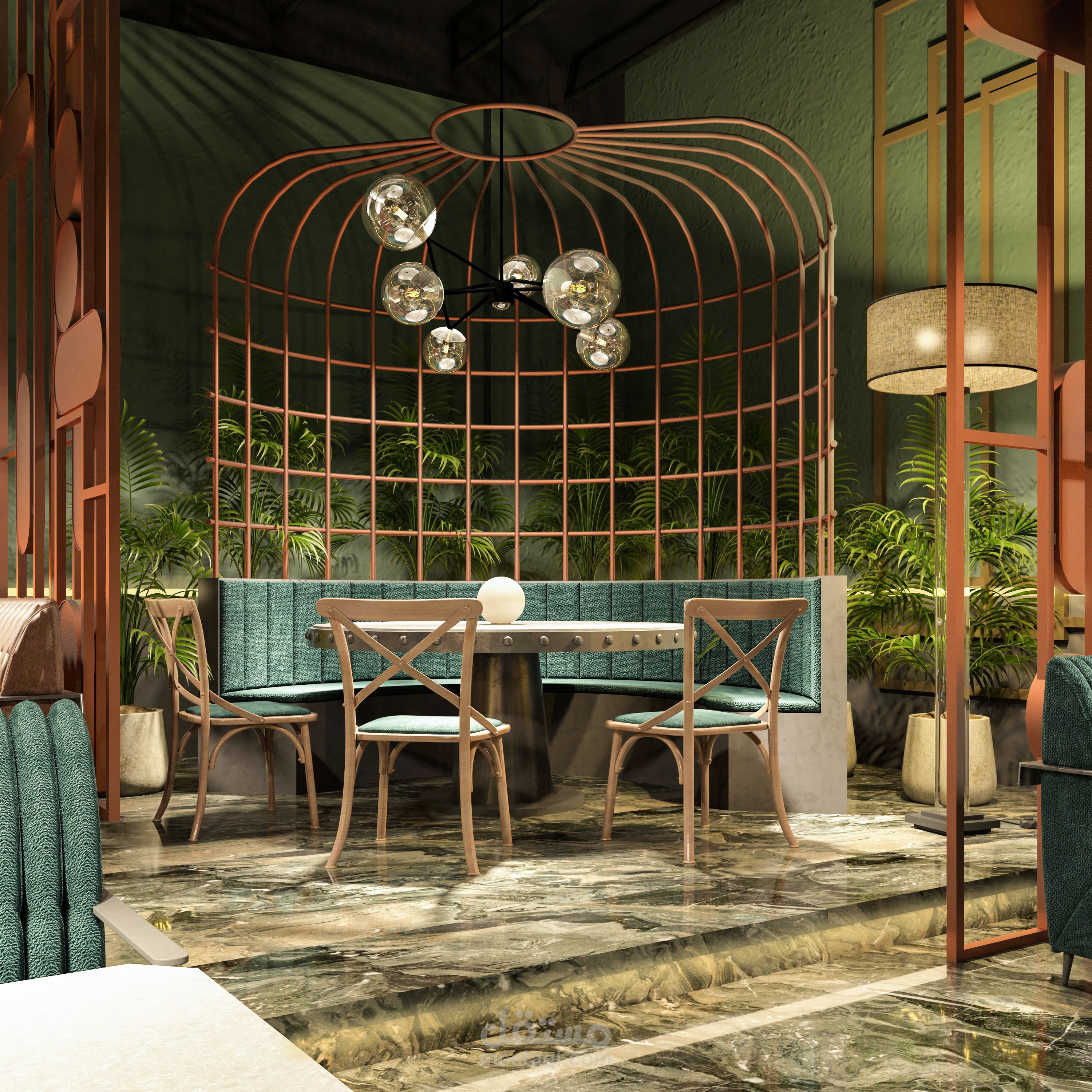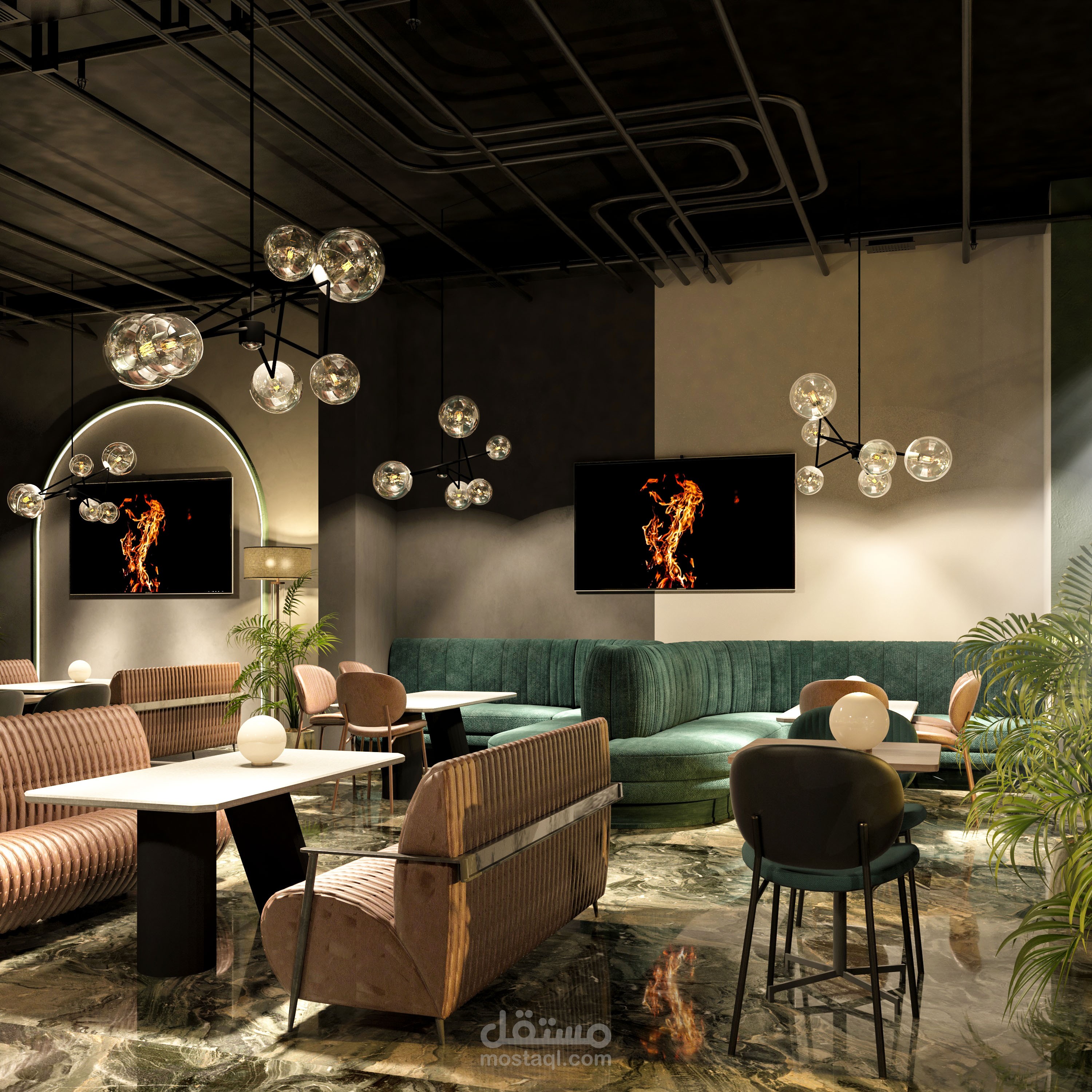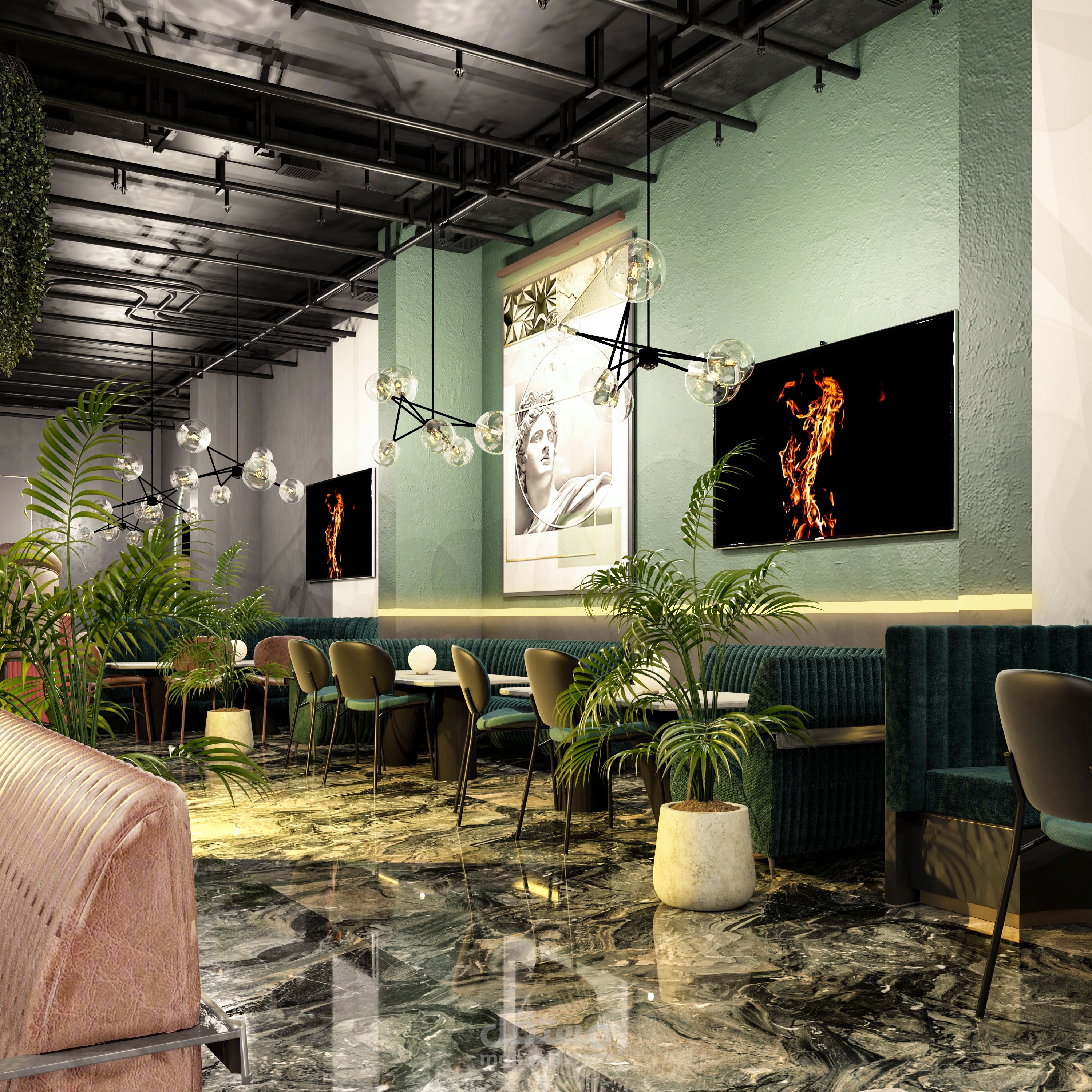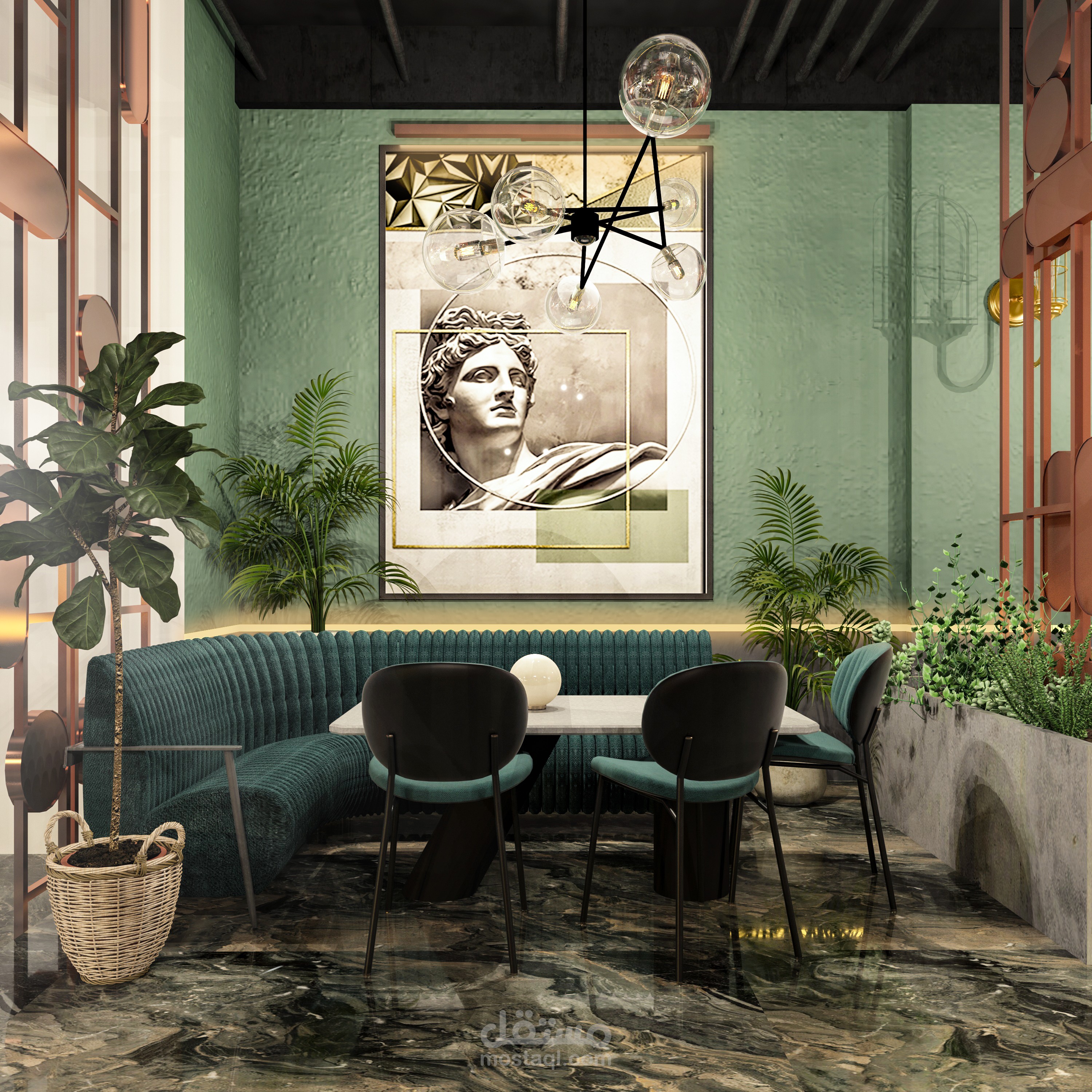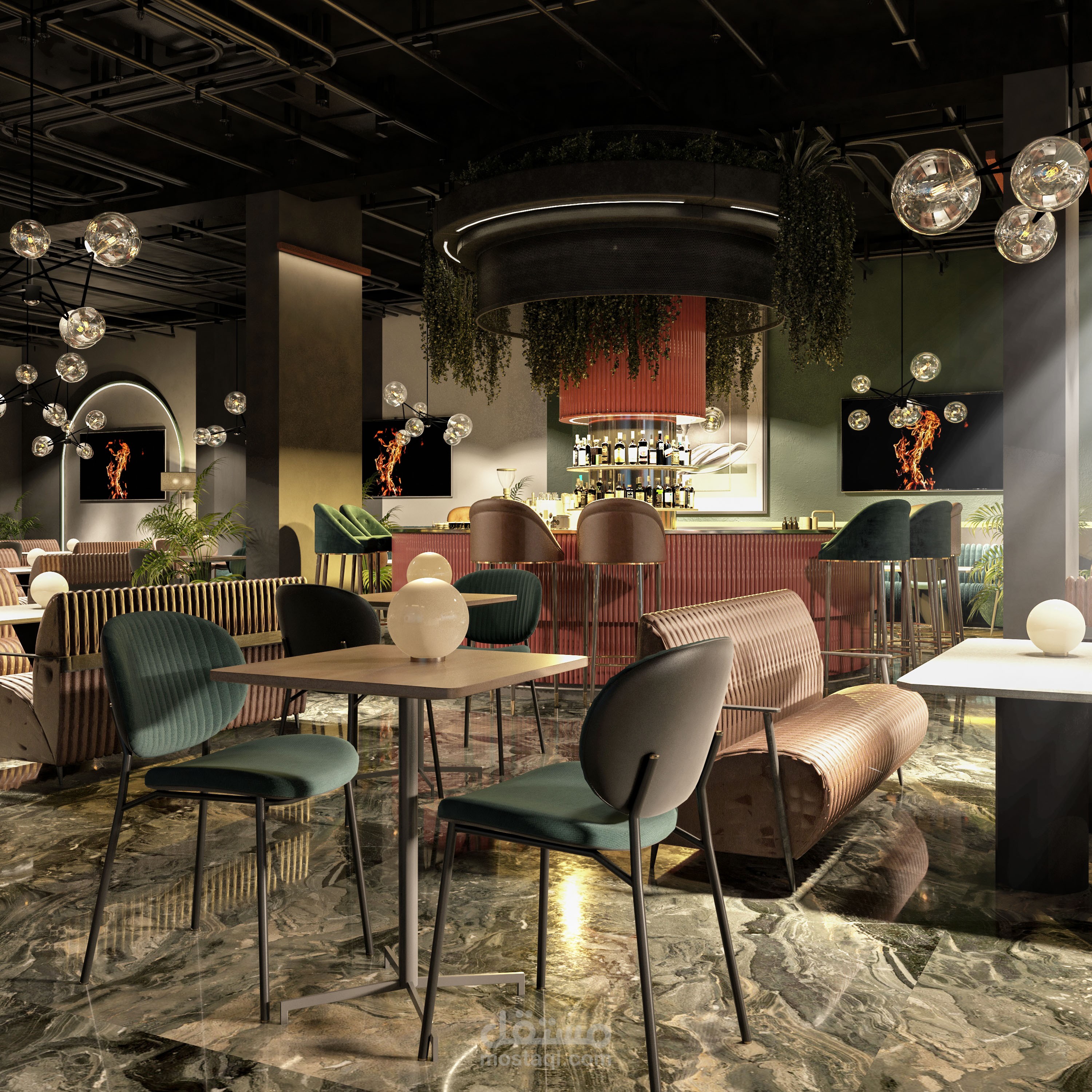 تصميم داخلي متكامل لمطعم بطابع عصري فاخر يمزج بين الأناقة والراحة ضمن أجواء مميزة تلائم تجربة تناول الطعام الراقية. تم اختيار لوحة ألوان جريئة تعتمد على الأخضر الهادئ والنحاسي الدافئ، مع استخدام خامات فاخرة مثل المخمل والرخام لتعزيز إحساس الفخامة.
