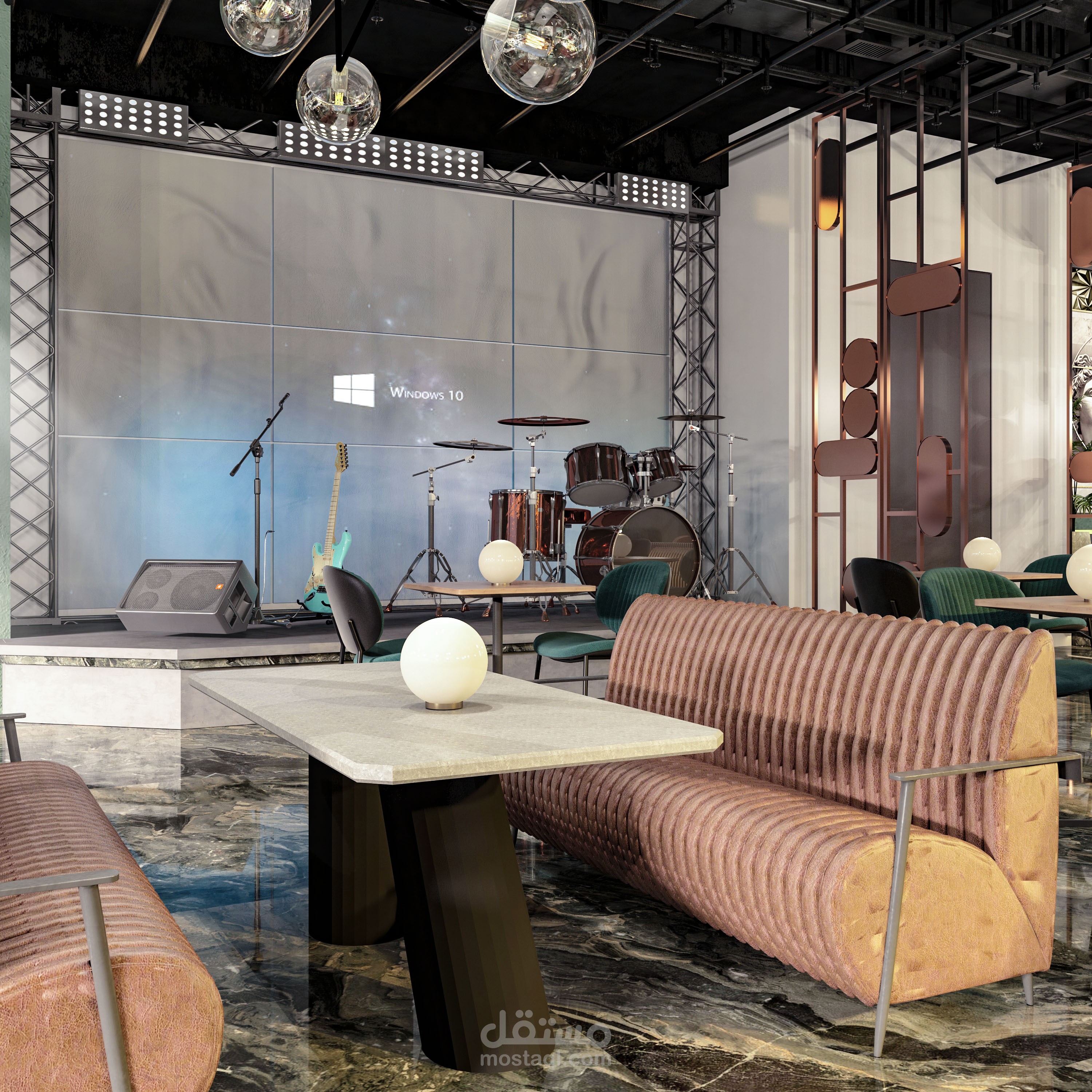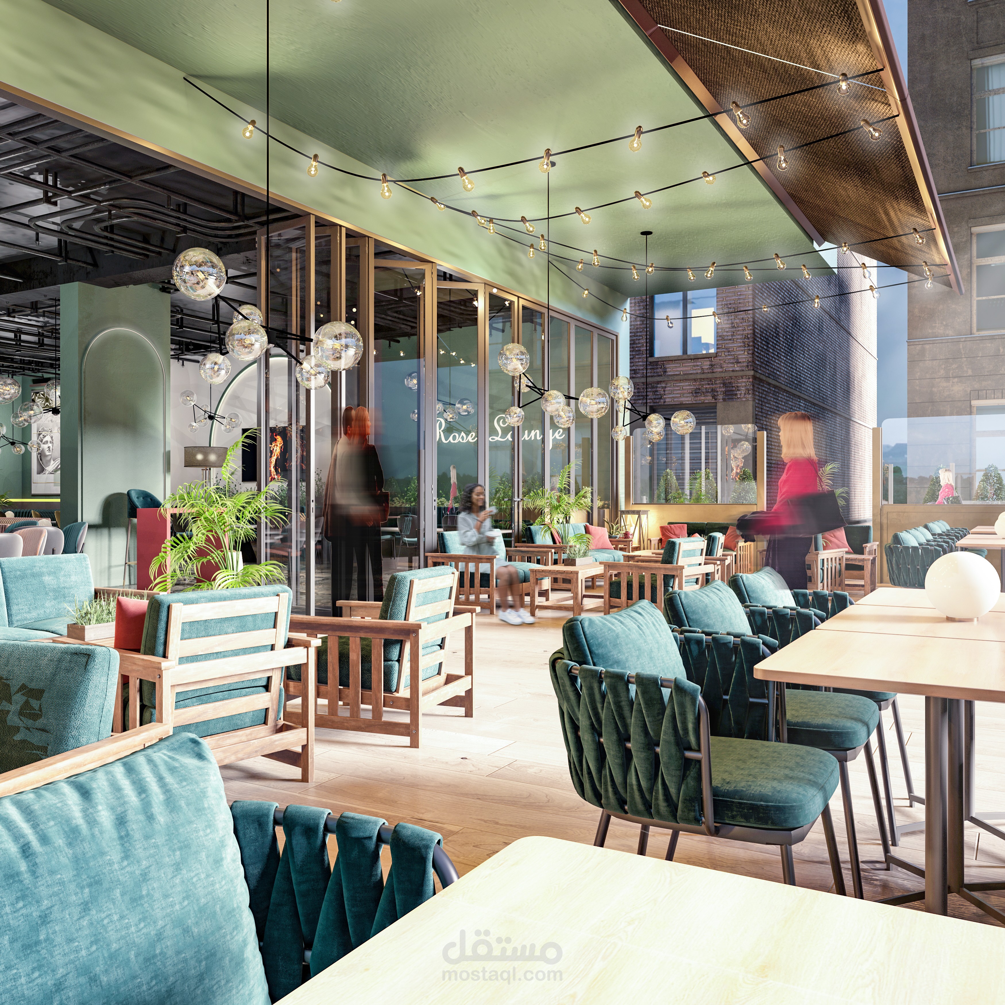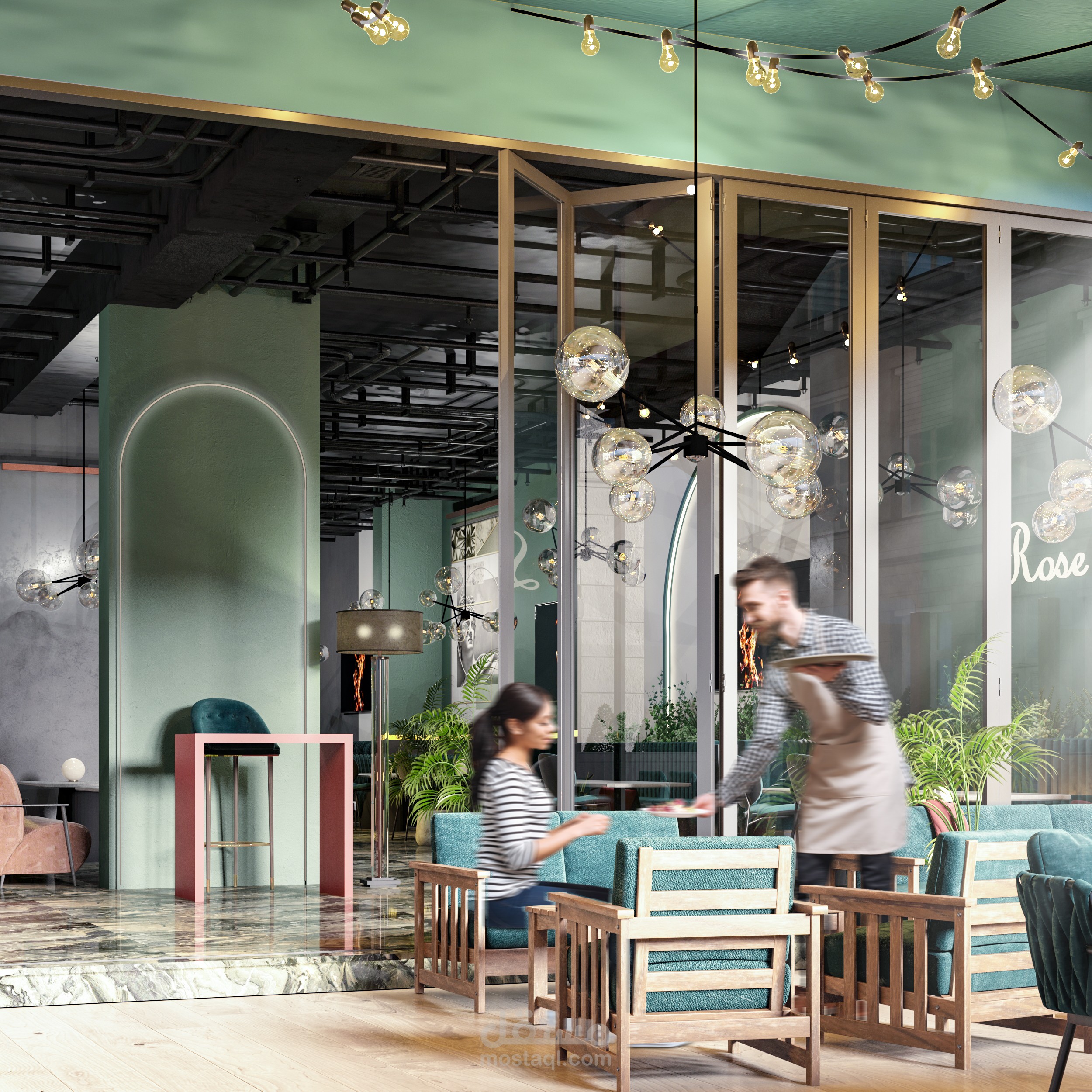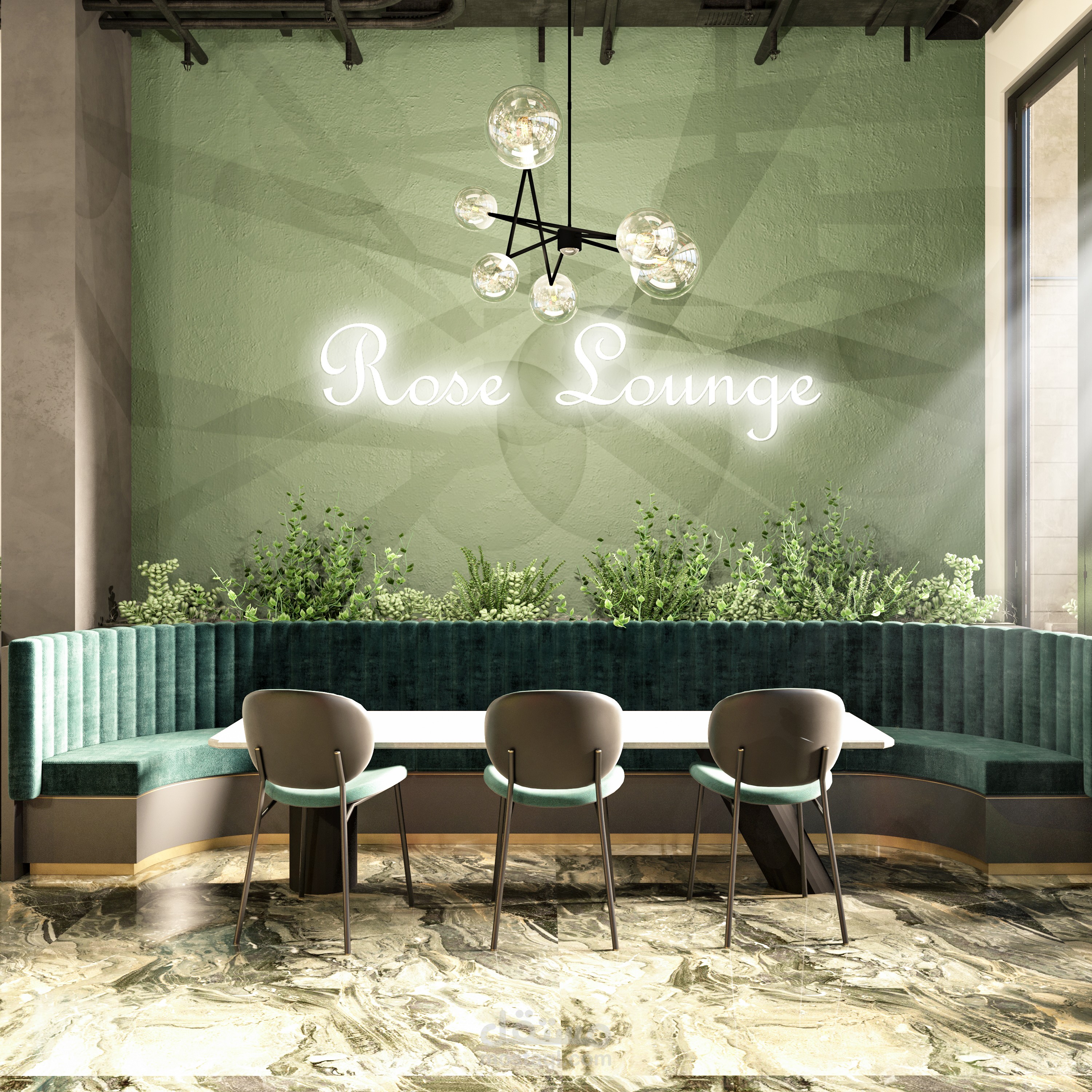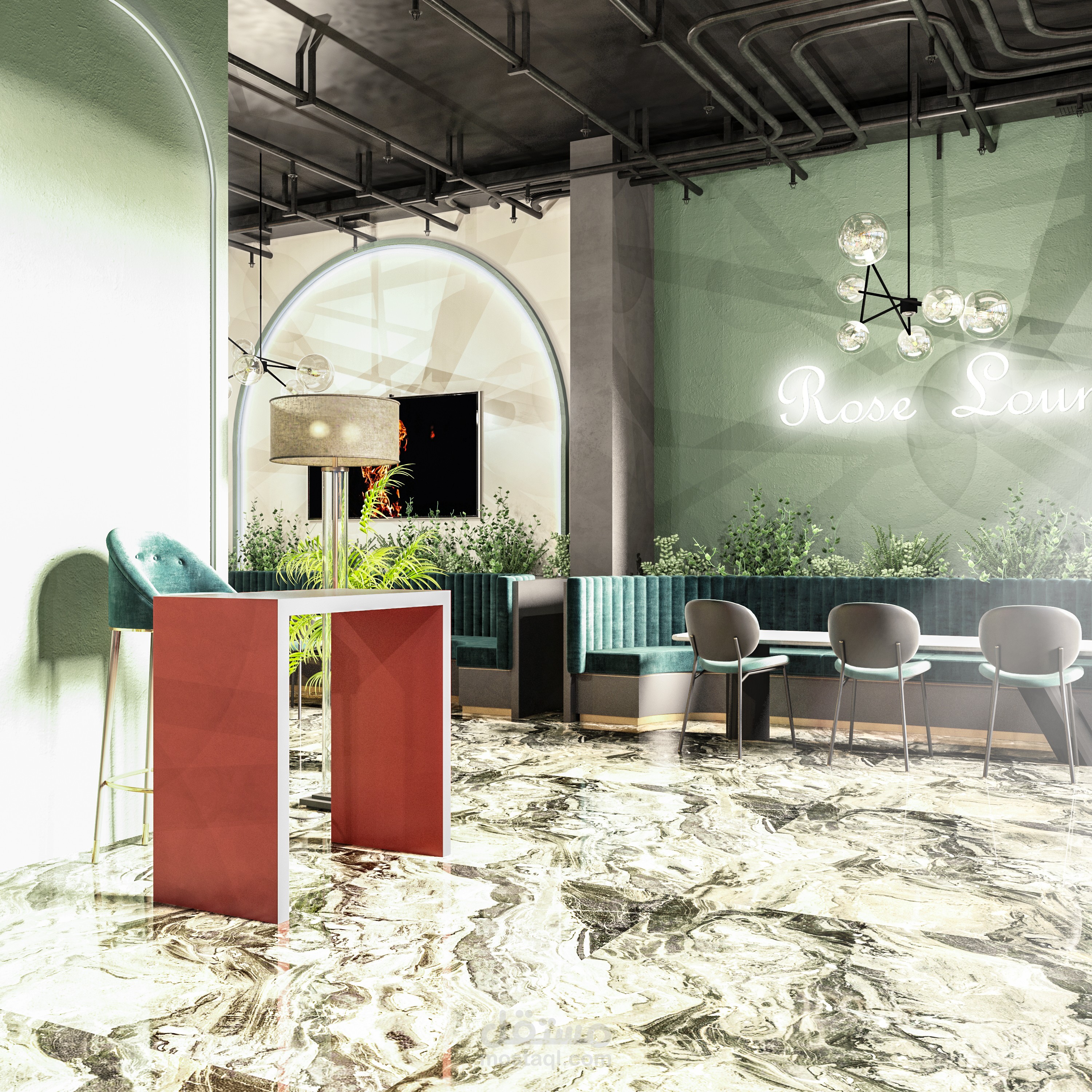 تصميم داخلي متكامل لمطعم بطابع عصري فاخر يمزج بين الأناقة والراحة ضمن أجواء مميزة تلائم تجربة تناول الطعام الراقية. تم اختيار لوحة ألوان جريئة تعتمد على الأخضر الهادئ والنحاسي الدافئ، مع استخدام خامات فاخرة مثل المخمل والرخام لتعزيز إحساس الفخامة.