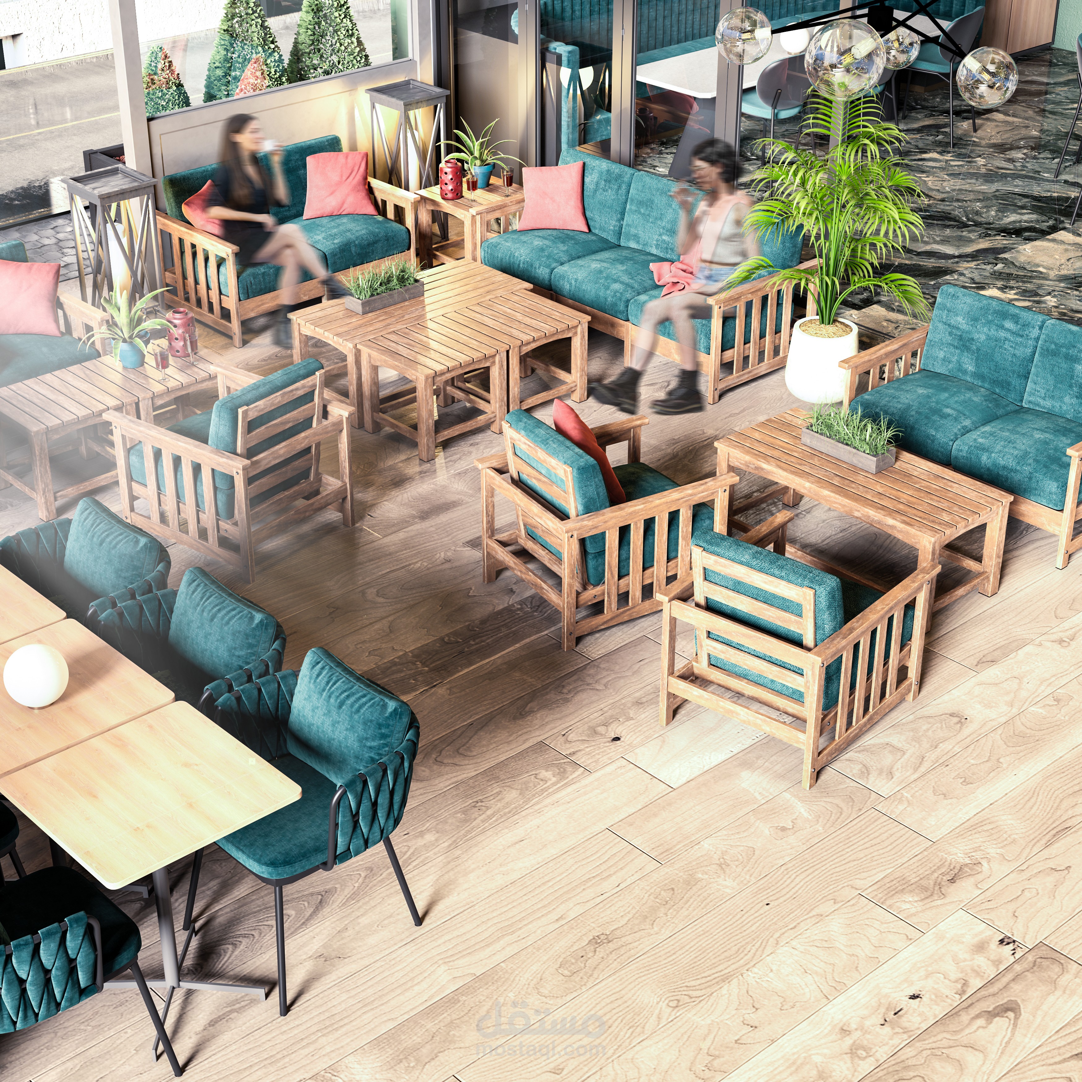 يضم المطعم جلسات داخلية وخارجية بتوزيع مدروس يحقق الانسيابية والخصوصية في آنٍ معاً، مع إضافة لمسات نباتية وديكورات جدارية فنية تعزز من هوية المكان. الإضاءة لعبت دوراً محورياً في إبراز تفاصيل التصميم، من خلال وحدات إضاءة معلقة بترتيب فني يُضفي عمقاً وديناميكية على الفراغ.