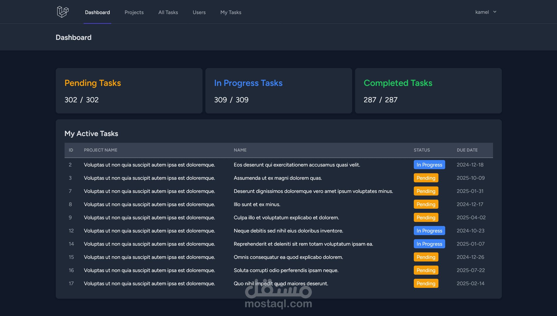 نظام إدارة المهام هو تطبيق ويب قوي وسهل الاستخدام، مبني باستخدام Laravel (PHP) في الواجهة الخلفية وReact.js في الواجهة الأمامية (باستخدام Inertia.js). صُممت هذه المنصة لتبسيط إدارة المشاريع والمهام والمستخدمين وتبسيطها للفرق والمؤسسات من جميع الأحجام.