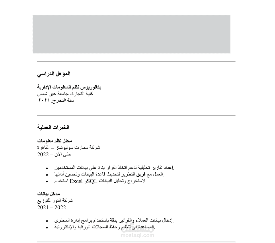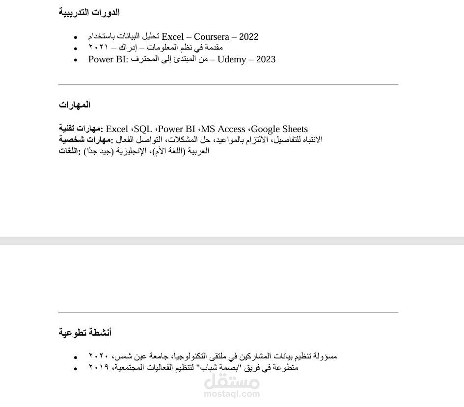 سيرة ذاتية احترافية باللغة العربية، مصممة لتناسب الوظائف الإدارية وتحليل البيانات.