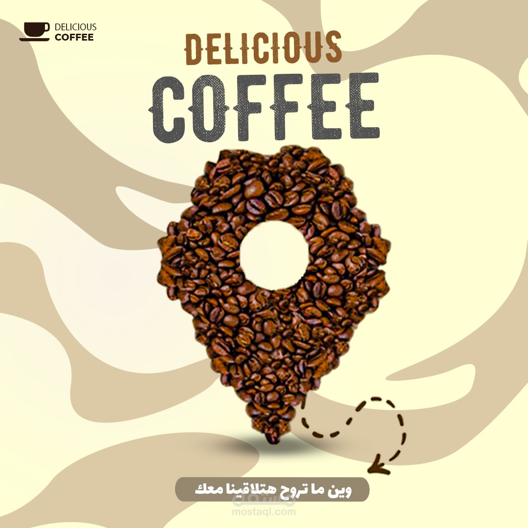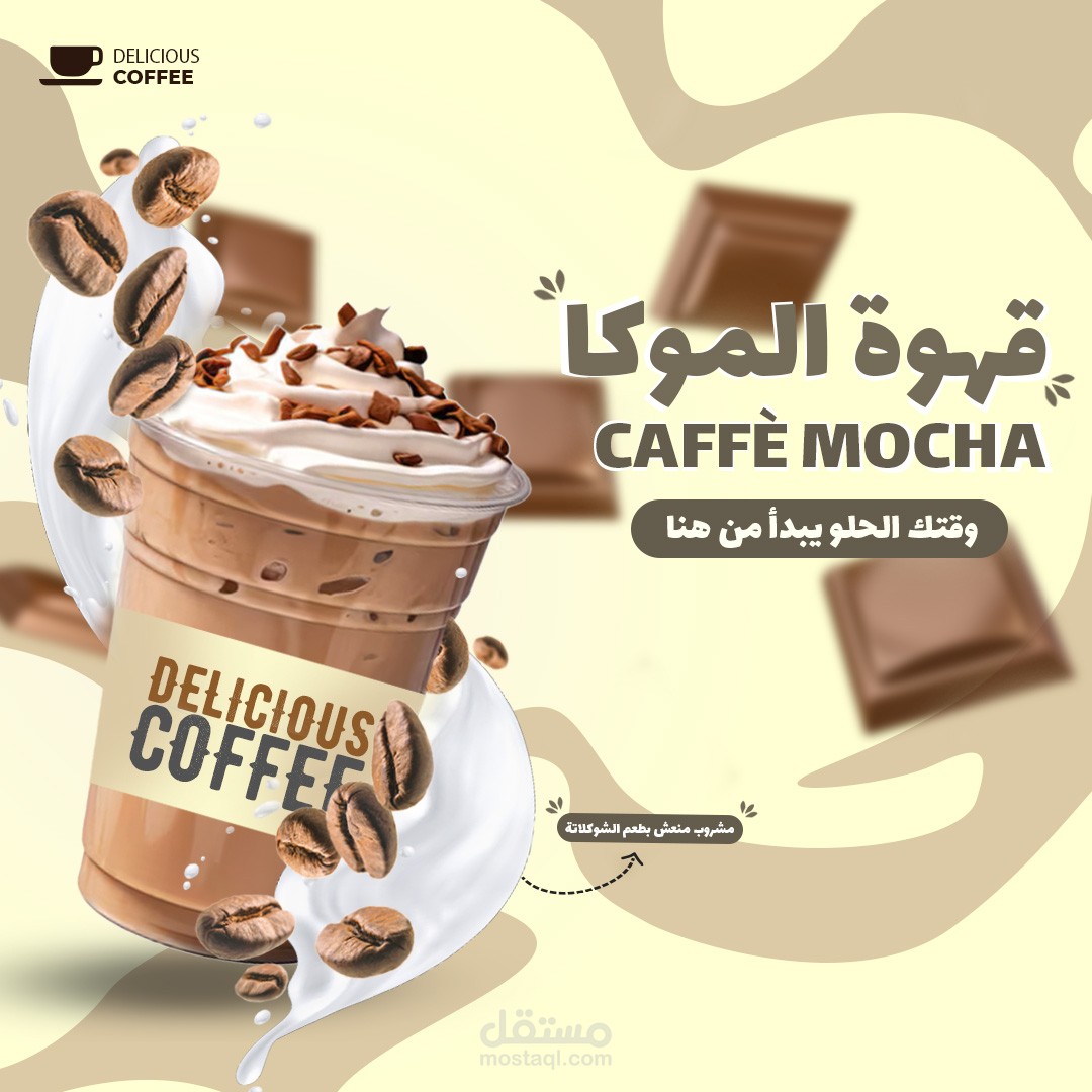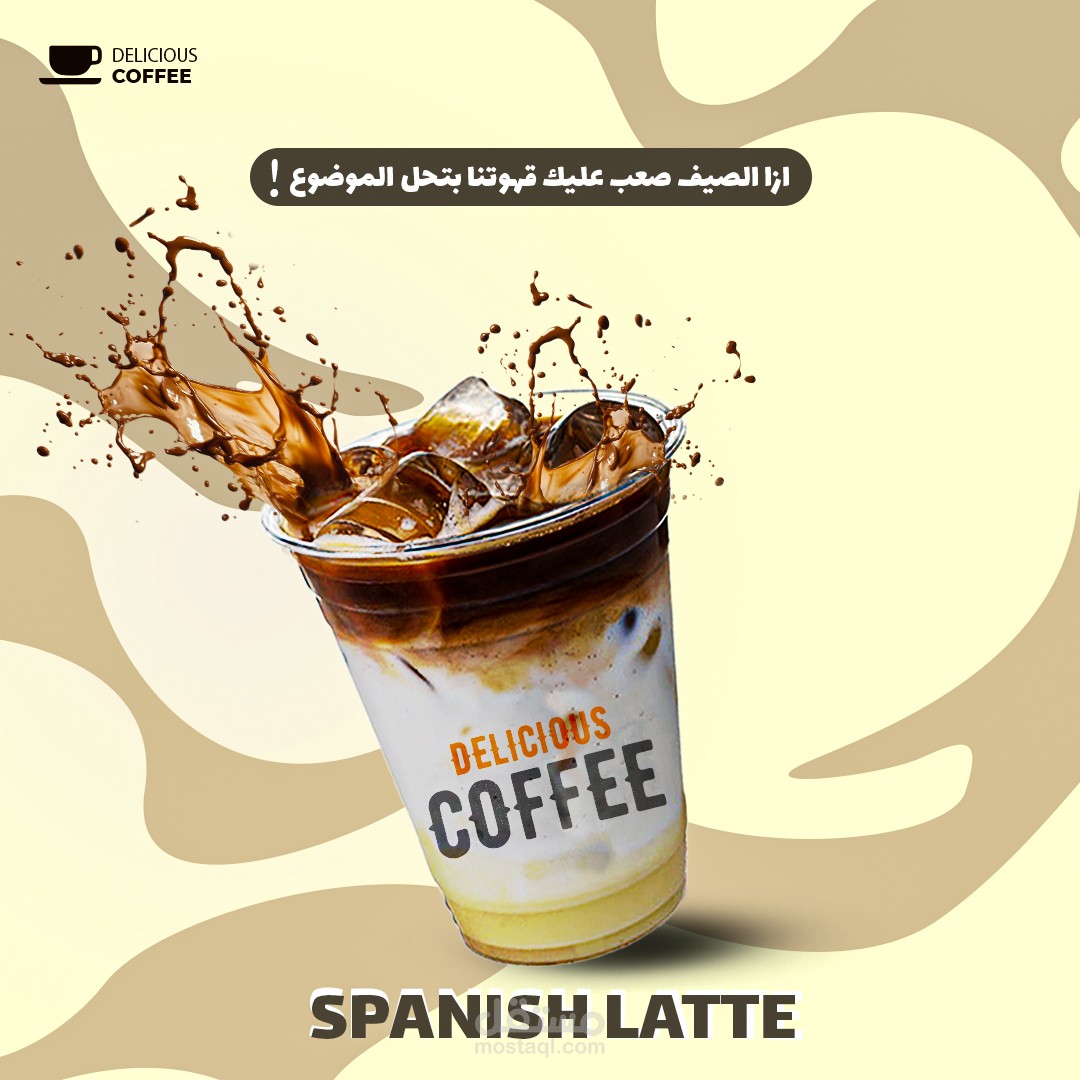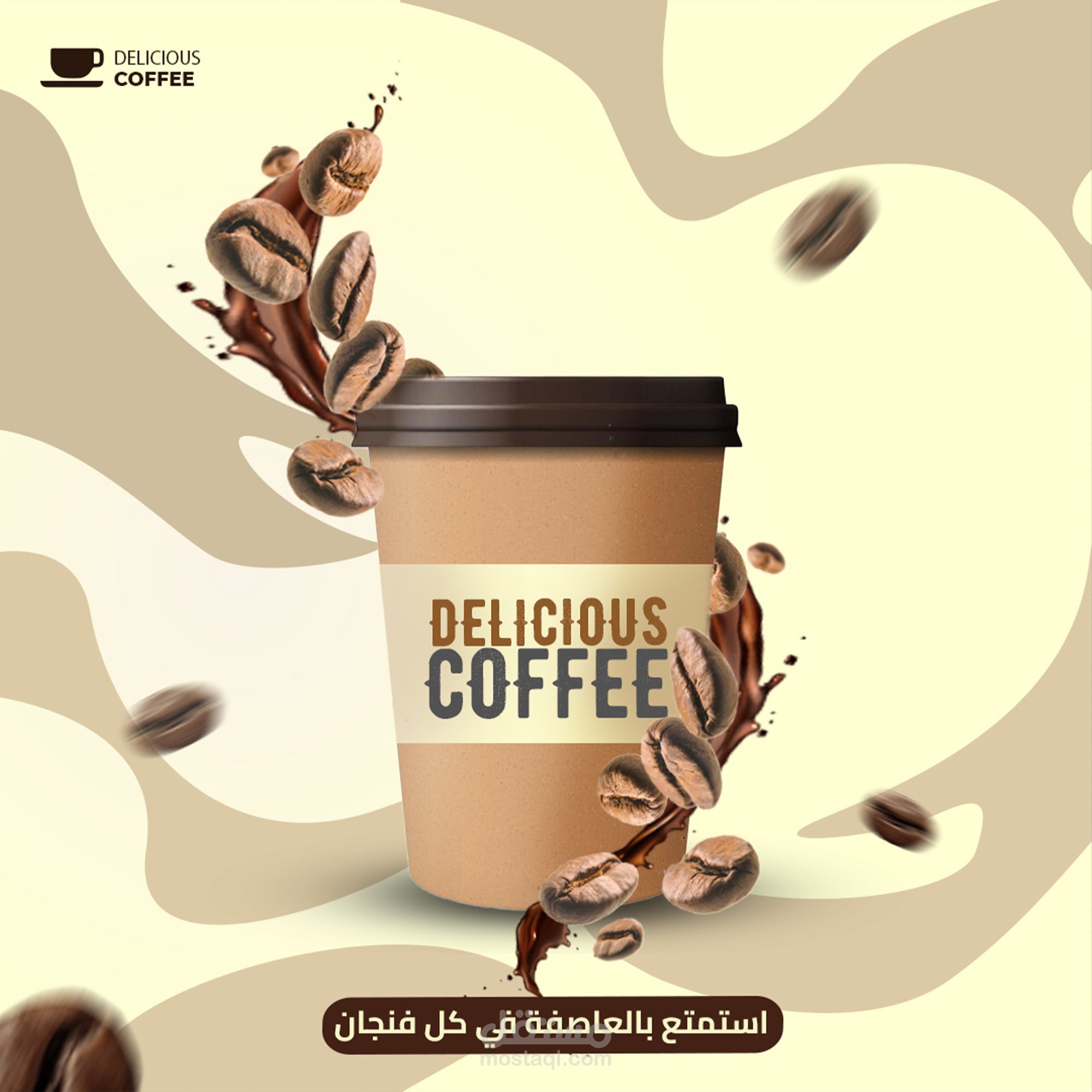 تصاميم إعلانية جذابة لعلامة "Delicious Coffee" تروّج لمجموعة متنوعة من المشروبات مثل الموكا والسبانيش لاتيه، بأسلوب بصري أنيق يجمع بين الألوان الدافئة وحبوب القهوة، مع عبارات تسويقية تعكس الطعم الغني وتدعو للاستمتاع بكل رشفة.