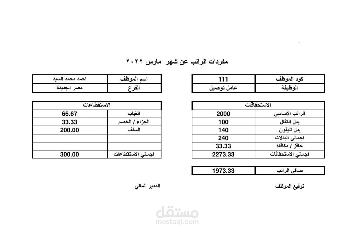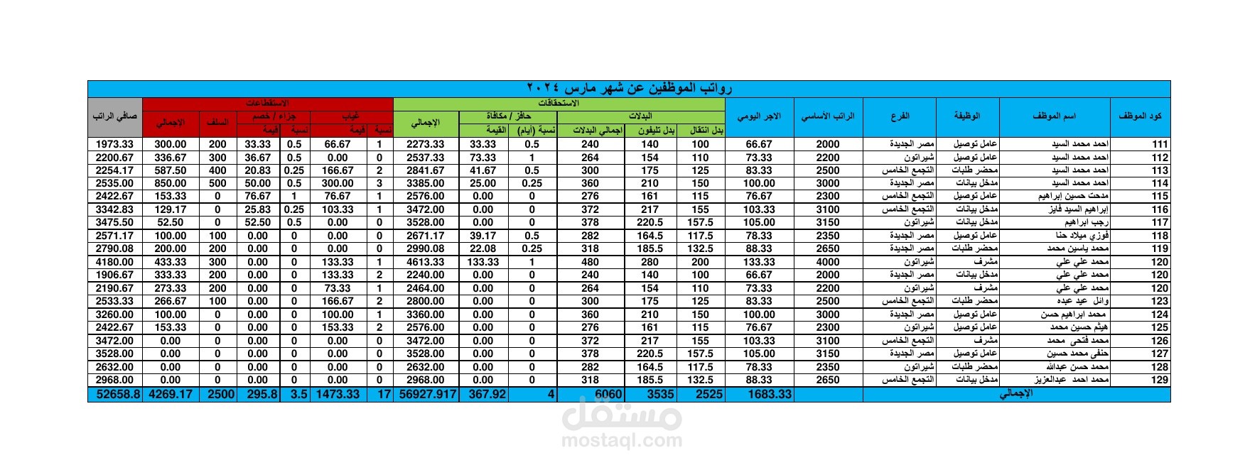 شيت رواتب للموظفين بيانات كل موظف مكود برقم كود لسهولة عرض البيان يتكون من الاستحقاقات مخصوم منه الاستقطاعات لحساب صافي الراتب و من خلاله عمل مفردات المراتب