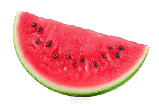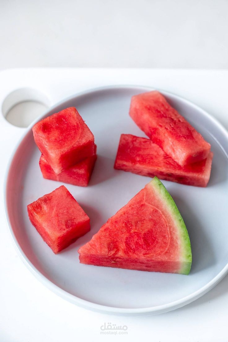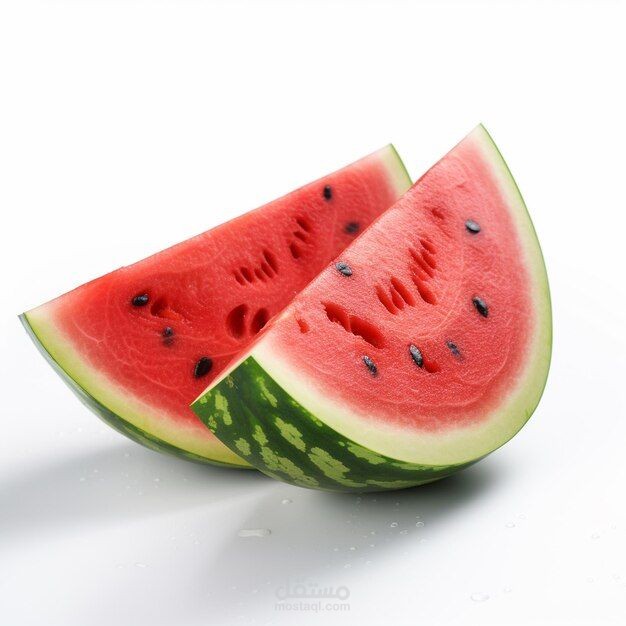 يُزين المشهد انفجار مائي ديناميكي حول العلبة، مع خلفية خضراء مائلة للداكن تتخللها أشعة ضوء مائلة تعزز من جاذبية المنتج وتعطي طابعًا صيفيًا مشرقًا. قطع البطيخ المنتشرة في الخلفية توحي بالطبيعة والانتعاش، وتُبرز الطابع الطبيعي للعصير.