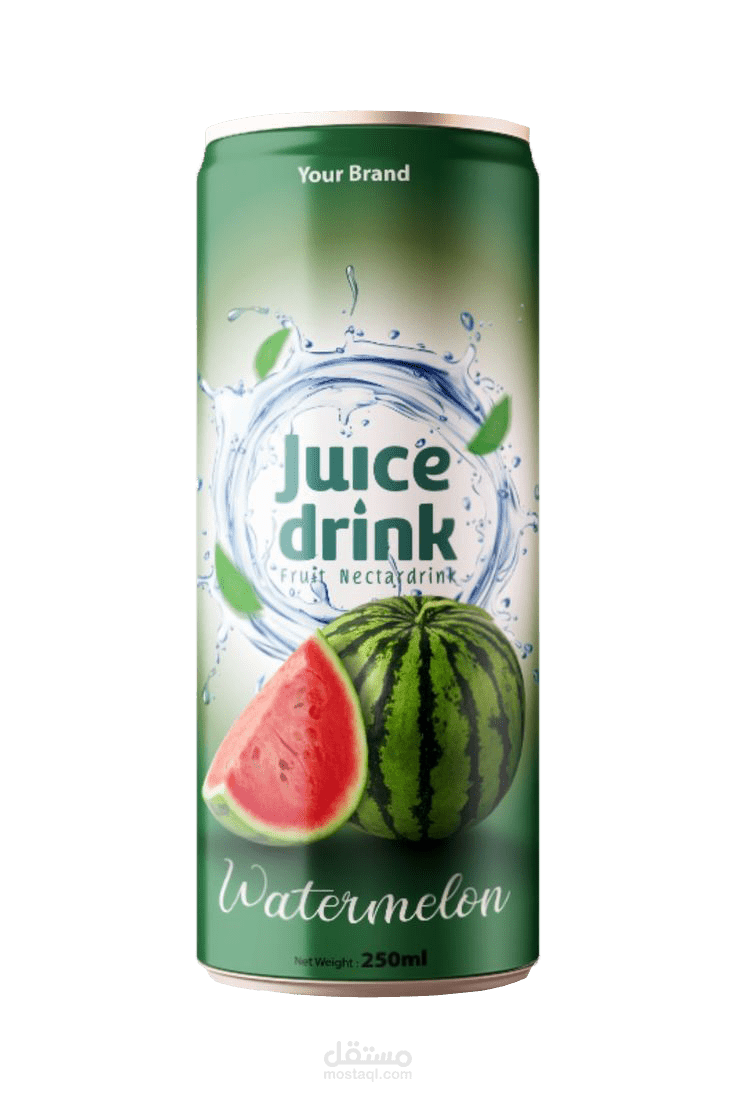 تُظهر الصورة تصميمًا جذابًا ومنعشًا لعبوة عصير بطيخ.