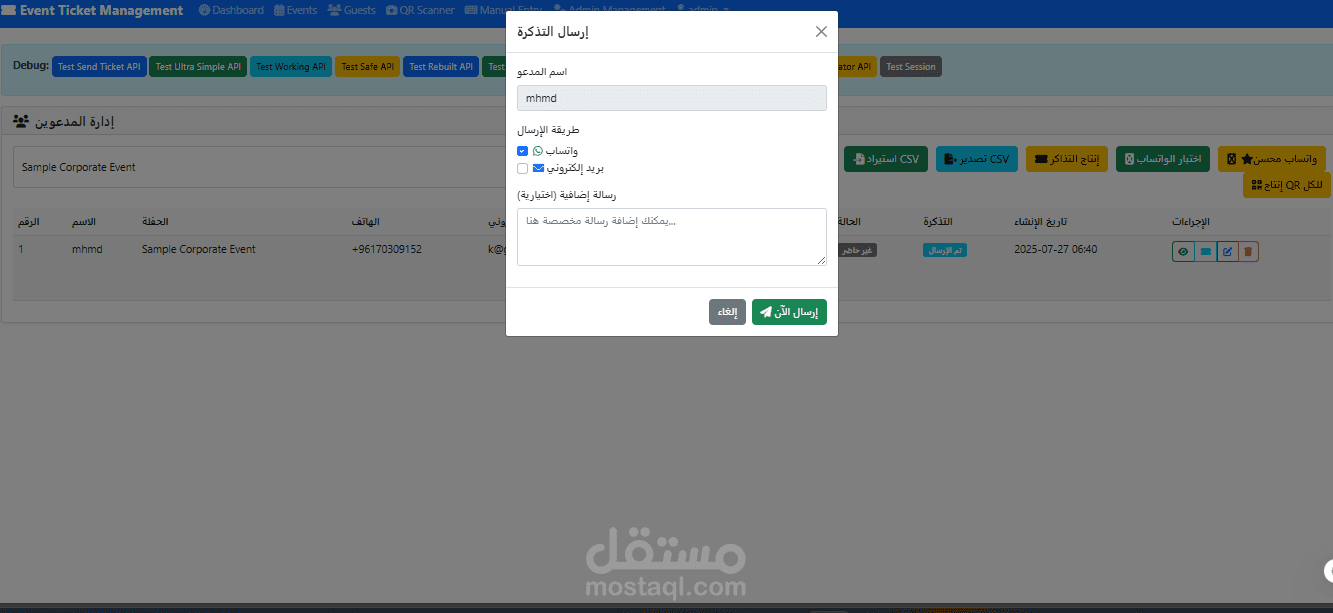 إرسال التذاكر عبر WhatsApp (تكامل مبدأي).