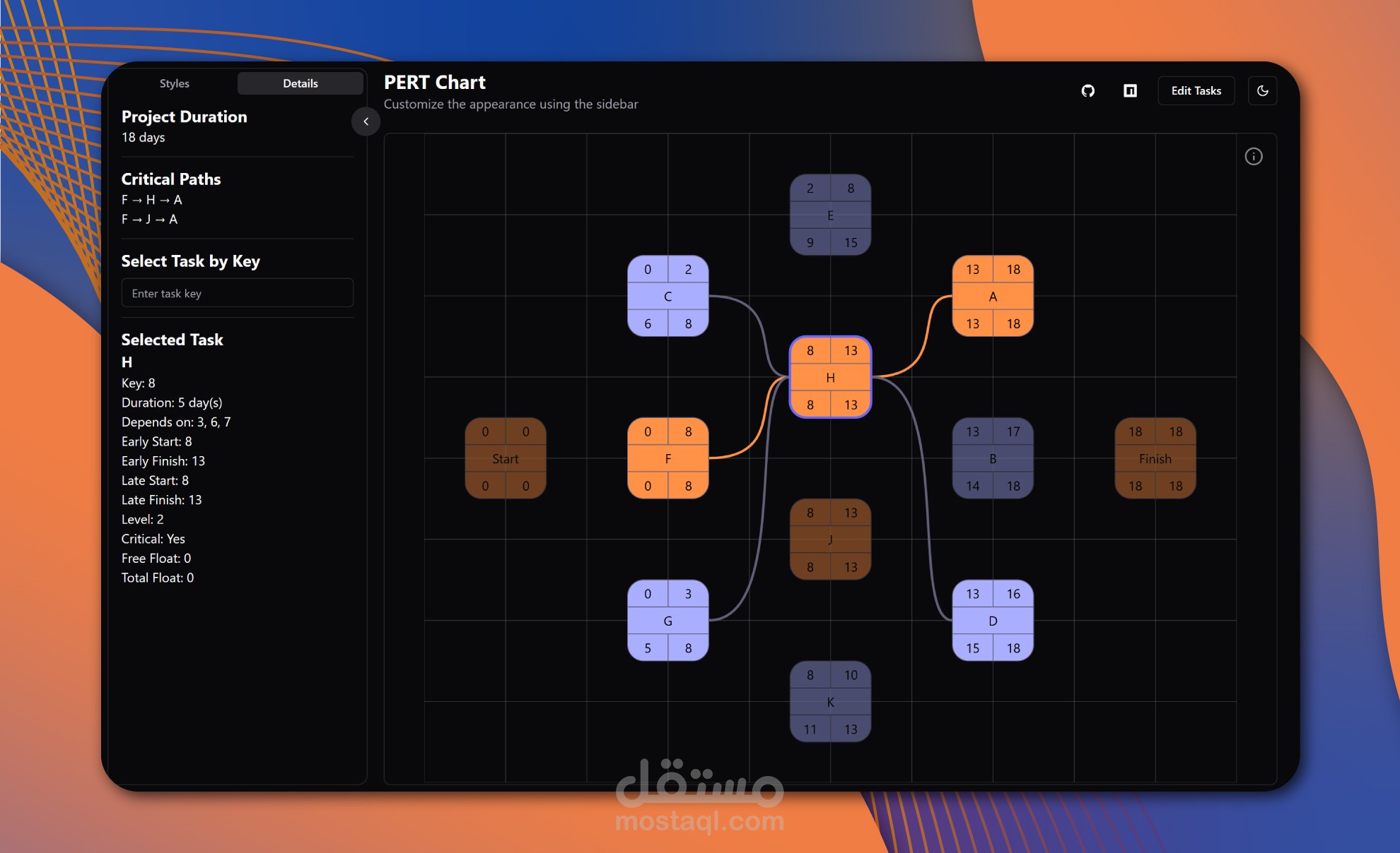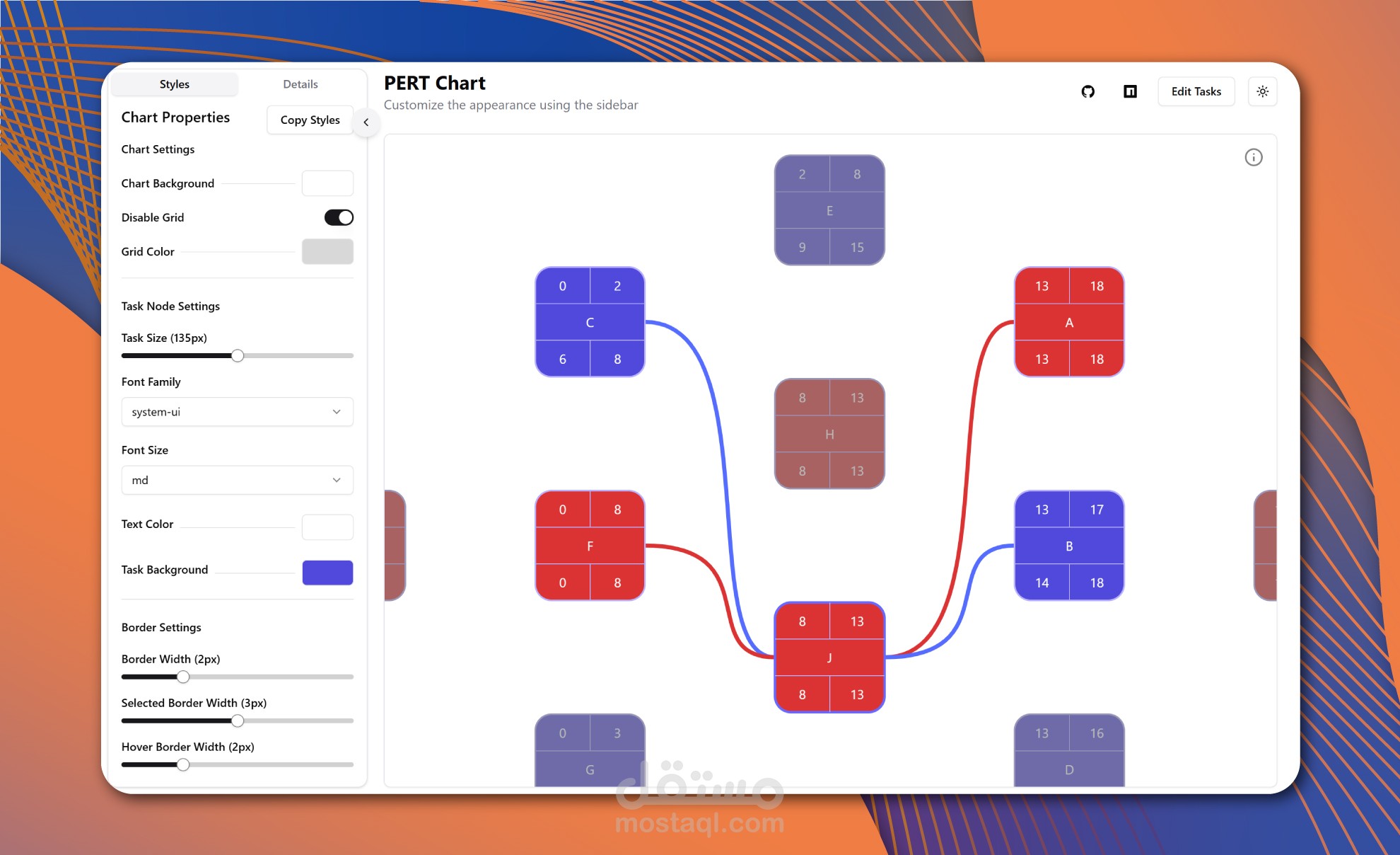 مكتبة React خفيفة الوزن وقابلة للتخصيص، مصممة لمساعدة المطورين على تمثيل سير عمل المشاريع بصريًا باستخدام مخططات PERT. تتيح لك هذه المكتبة توضيح تبعيات المهام، وفتراتها، والمسار الحرج بطريقة سلسة وتفاعلية وسهلة الاستخدام للمطورين.
