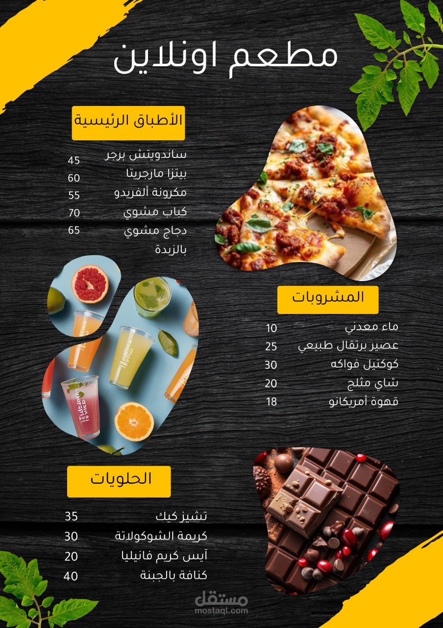 تصميم منيو جذاب لمطعم أونلاين يعرض الأطباق الرئيسية، المشروبات، والحلويات بشكل منظم وواضح. البوست يتميز بأسلوب بصري حديث، يجمع بين البساطة والوضوح مع صور عالية الجودة تُبرز شهية الطعام وتشد الانتباه من أول نظرة. الخلفية الخشبية الداكنة منحت التصميم طابع دافئ وأنيق، في حين أن ألوان العناصر (الأصفر والبرتقالي) أضافت لمسة عصرية وحيوية.
