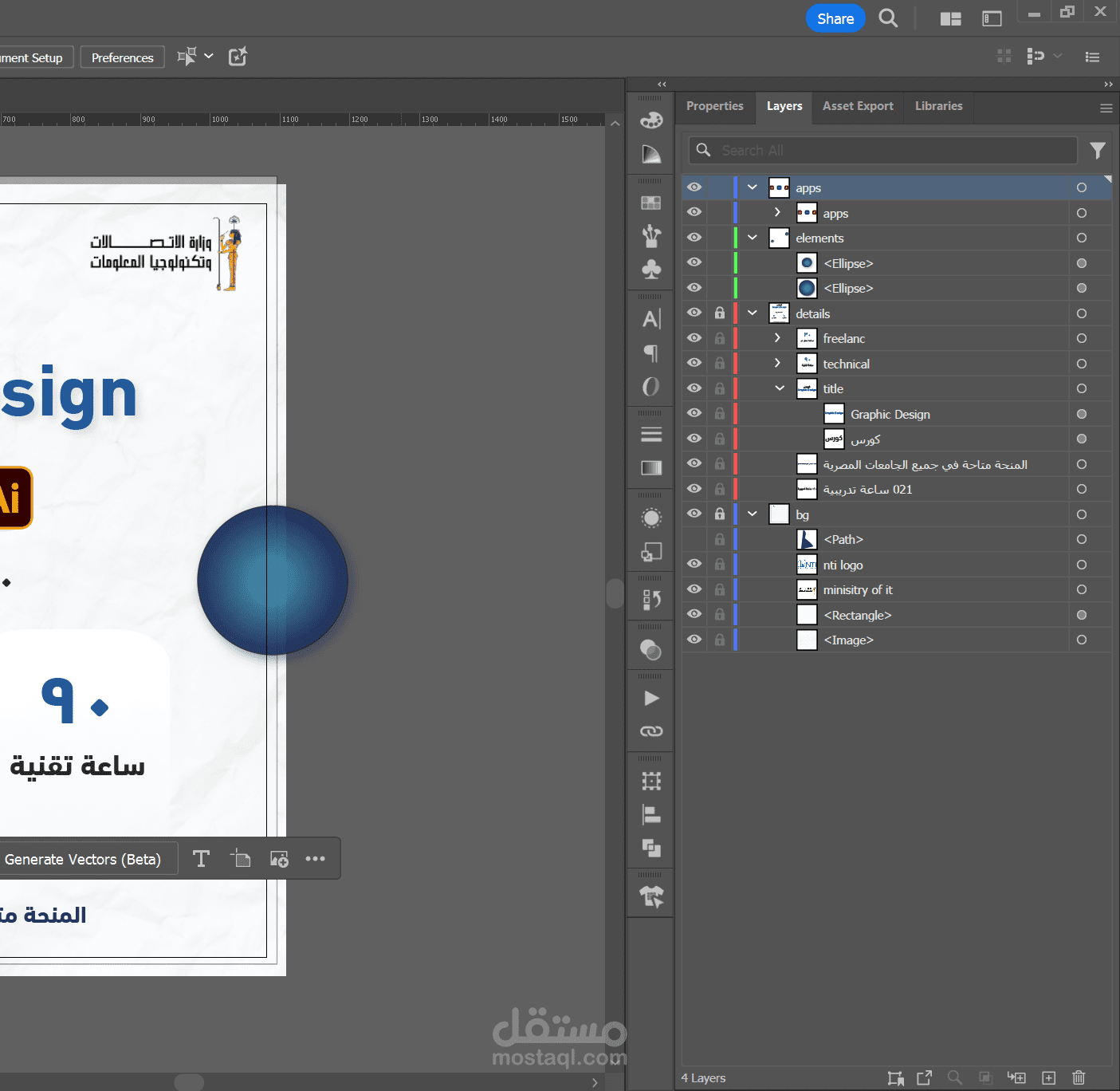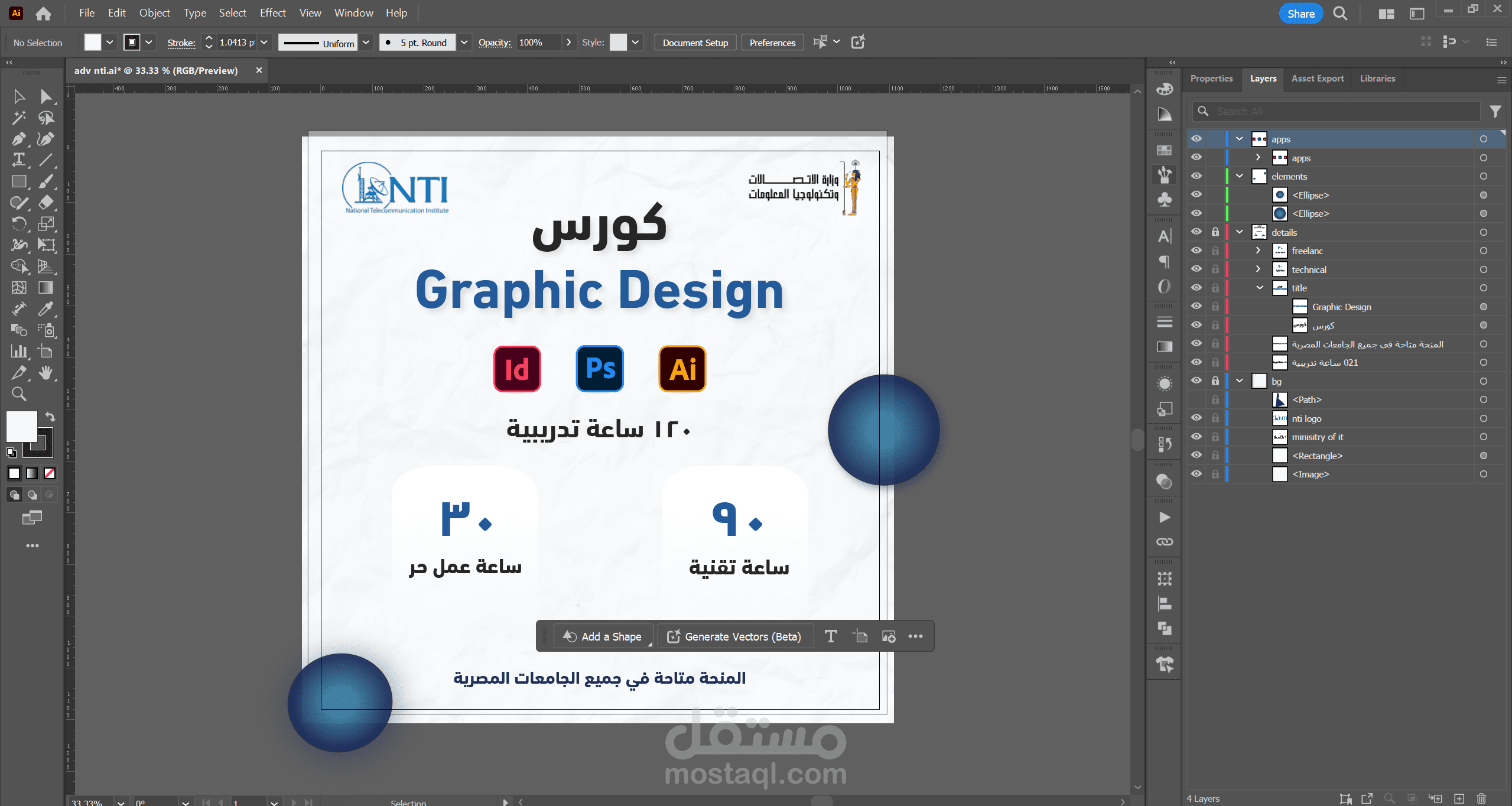 قمت بتصميم هذا الإعلان بالكامل باستخدام برنامج Adobe Illustrator، بهدف الترويج لكورس جرافيك ديزاين مقدم من المعهد القومي للاتصالات (NTI).