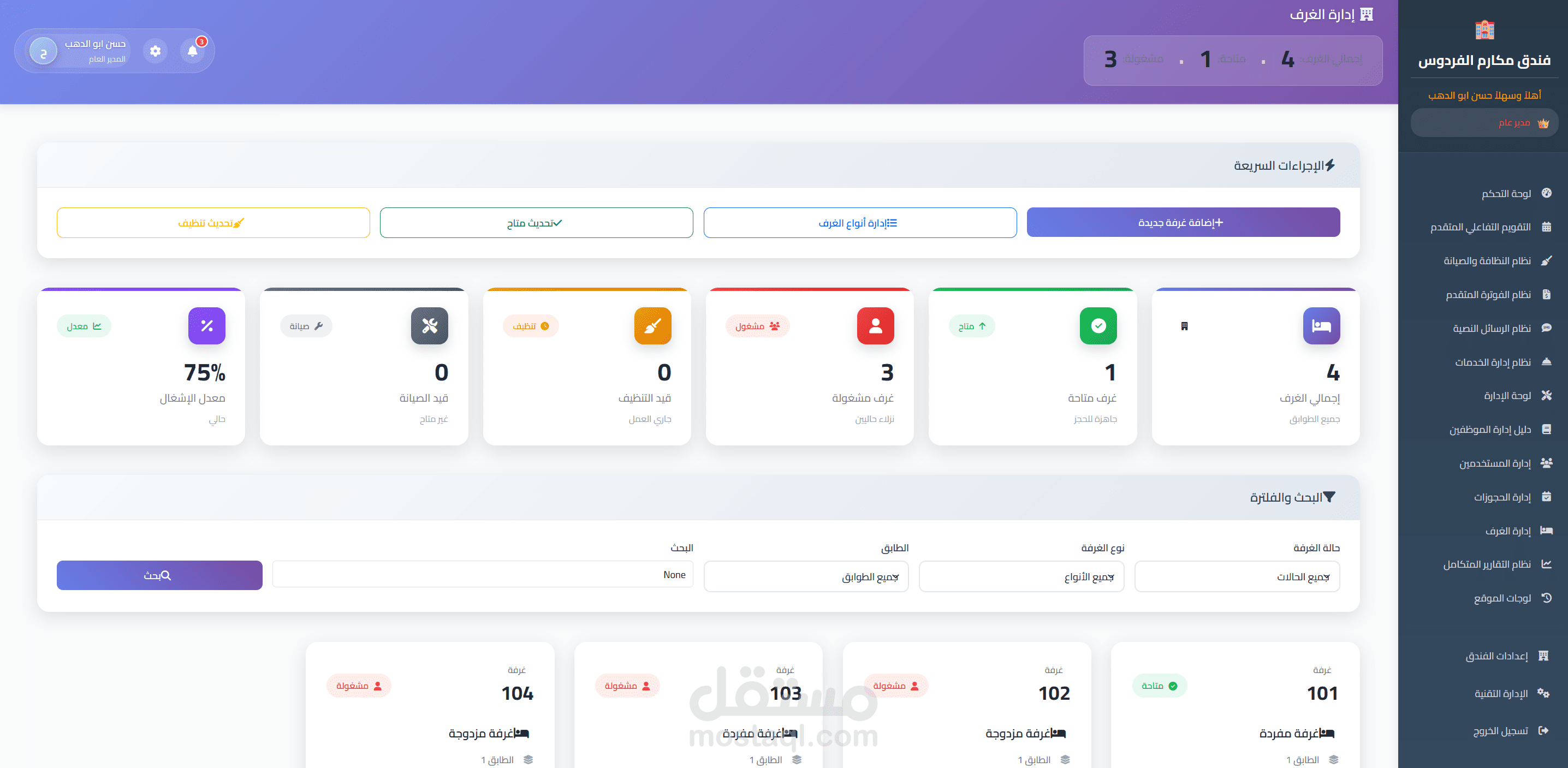 نظام إدارة الغرف (Room Management) مع تصنيفات الحالة (متاحة، محجوزة، تحت الصيانة...).