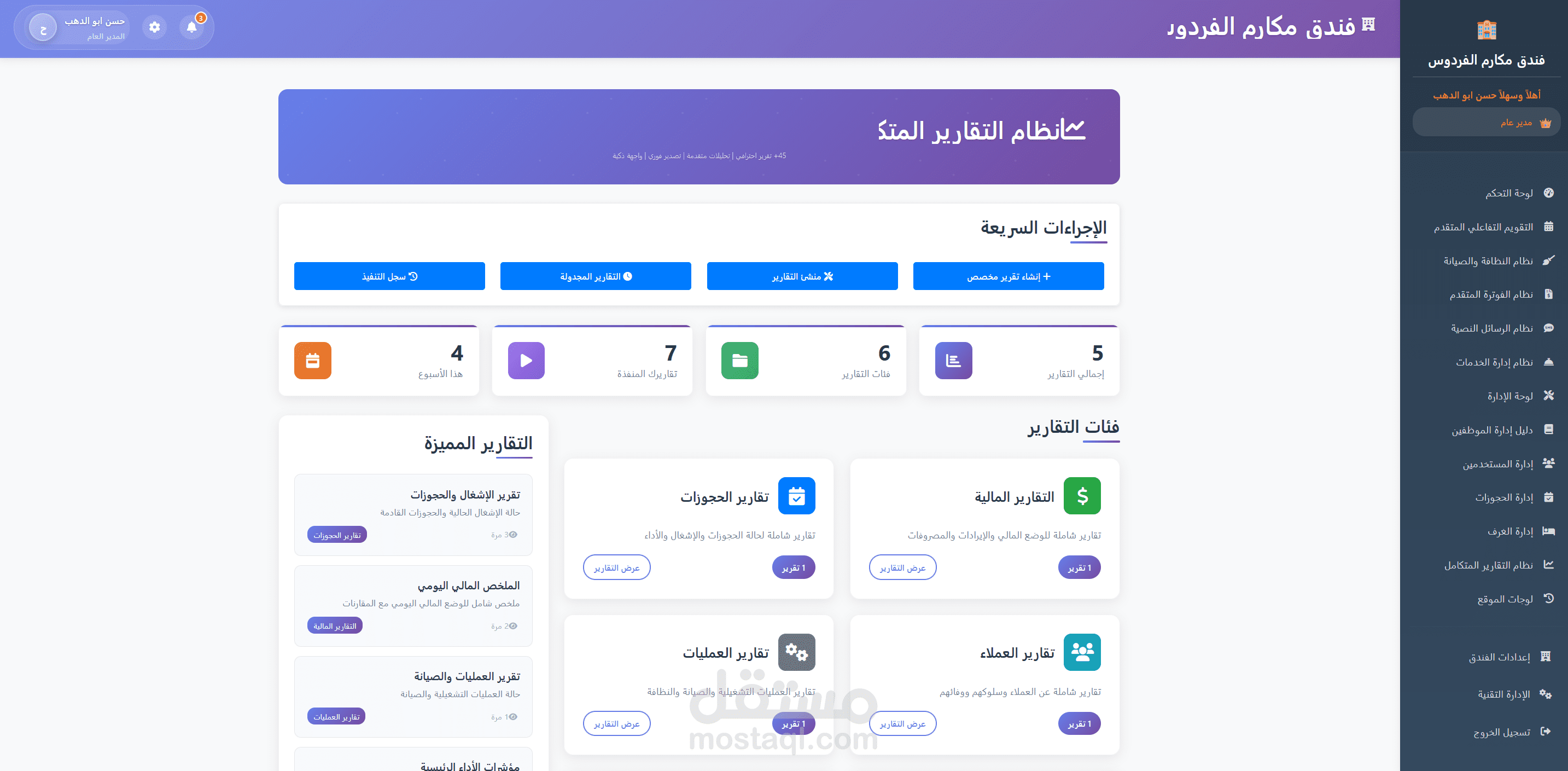 تقارير شاملة (Reports System) للأداء والحجوزات.