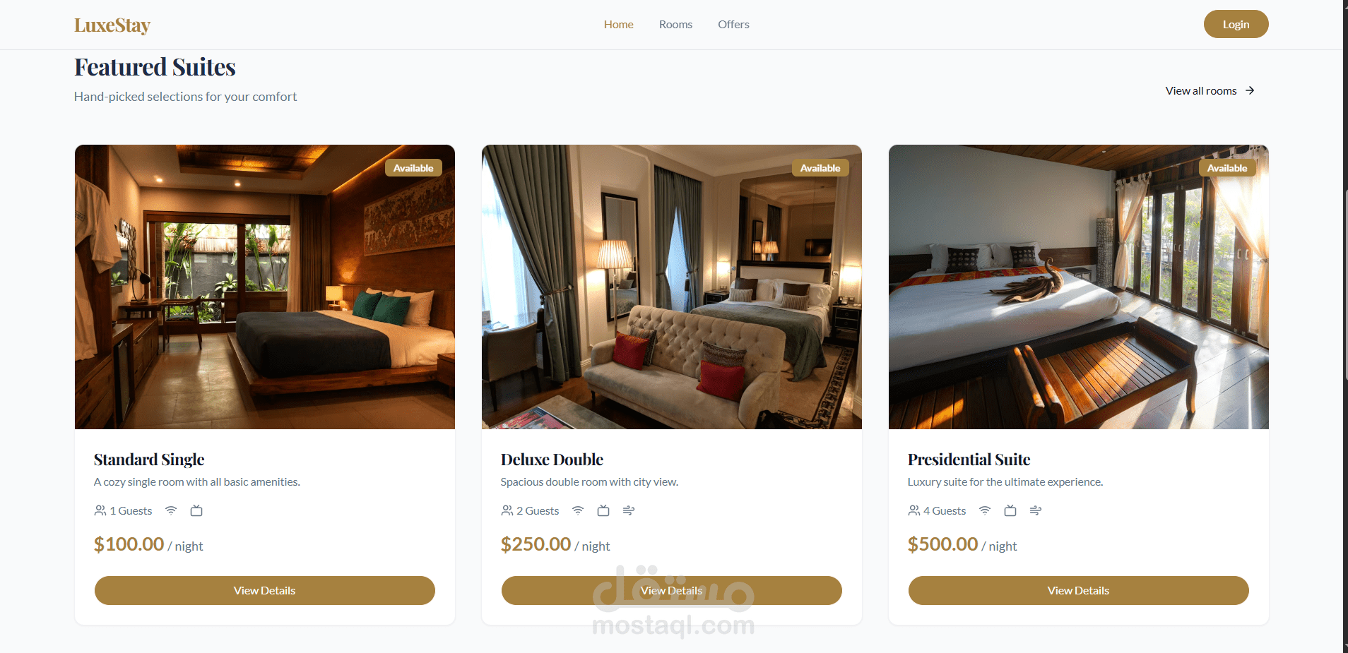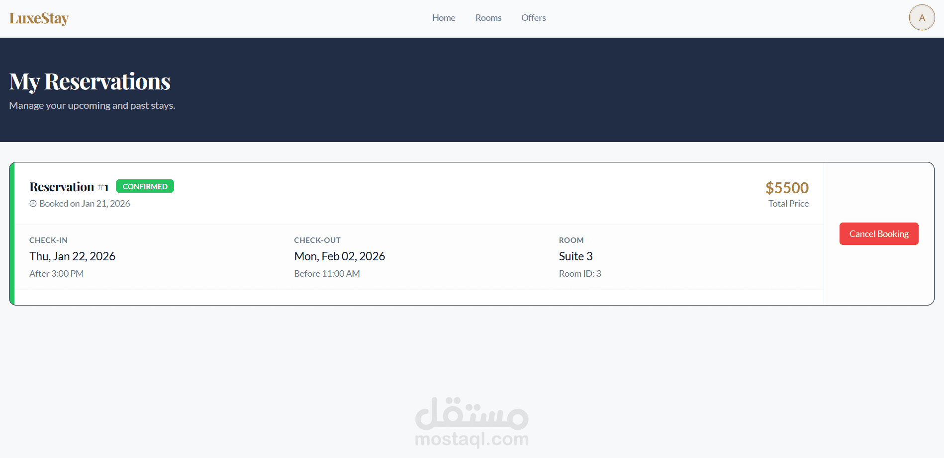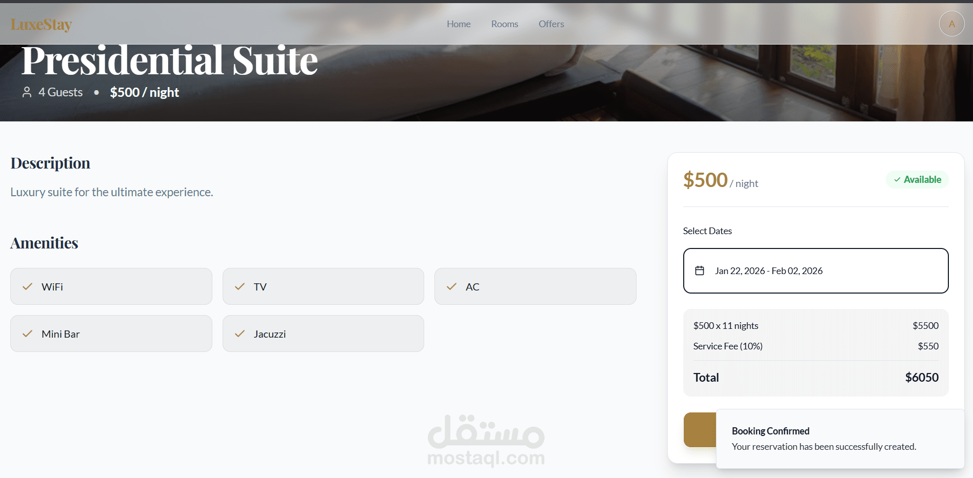 قمت بتطوير LuxeStay، وهو نظام متكامل لإدارة الفنادق (Hotel Management System) يهدف إلى تسهيل إدارة عمليات الحجز والغرف والعملاء بشكل احترافي، مع توفير تجربة سلسة للنزلاء ولوحة تحكم قوية لإدارة الفندق.
