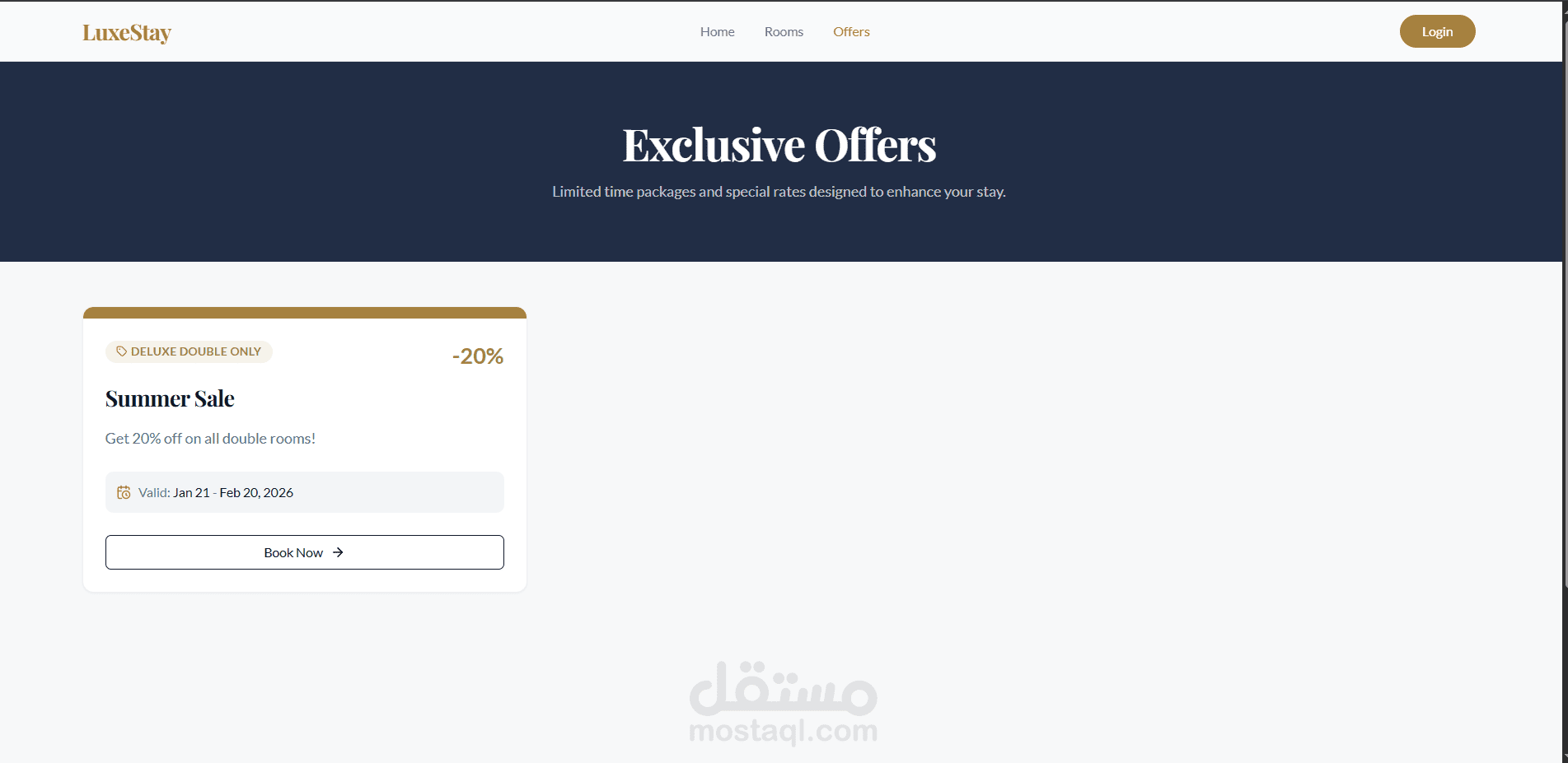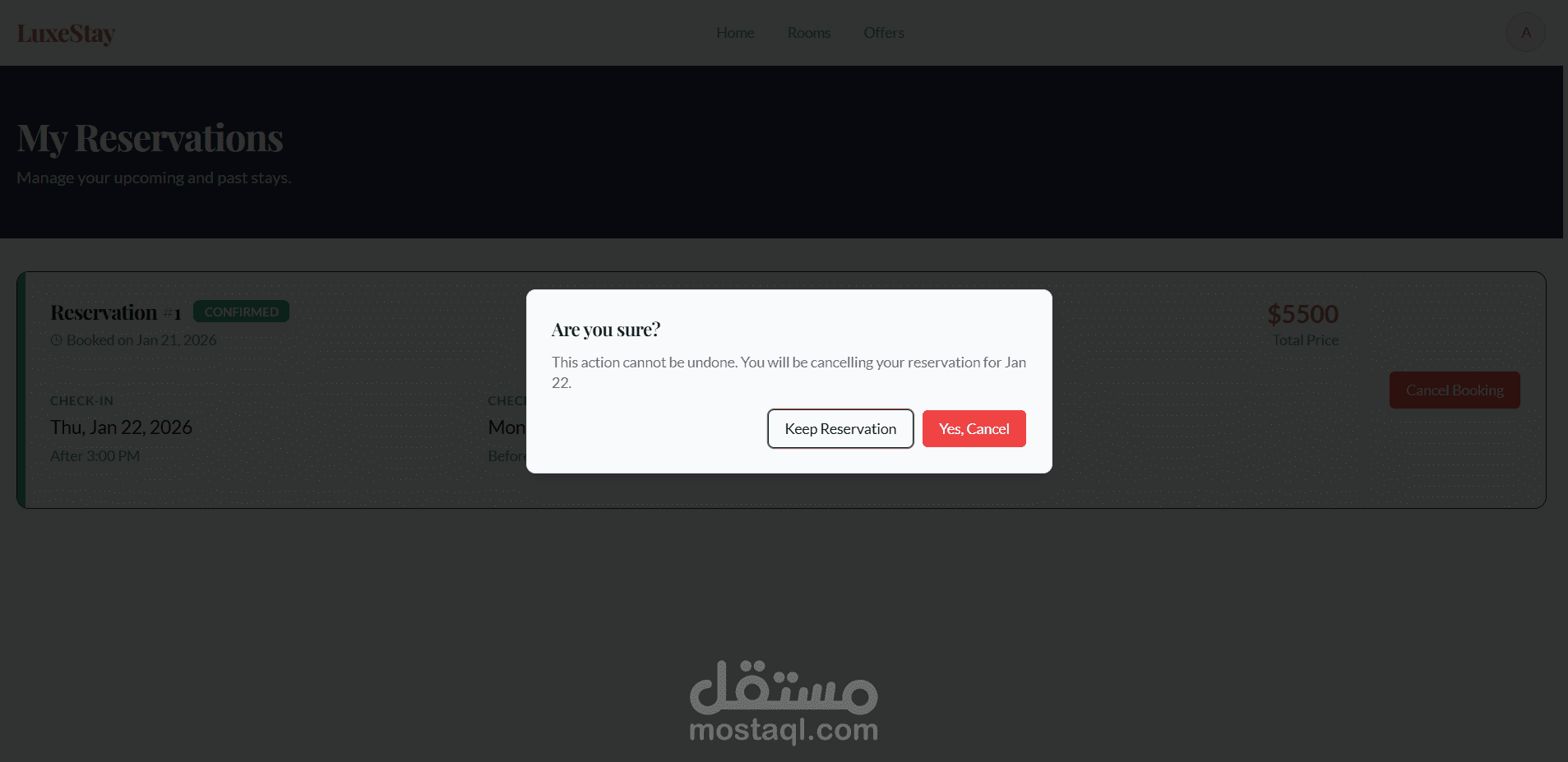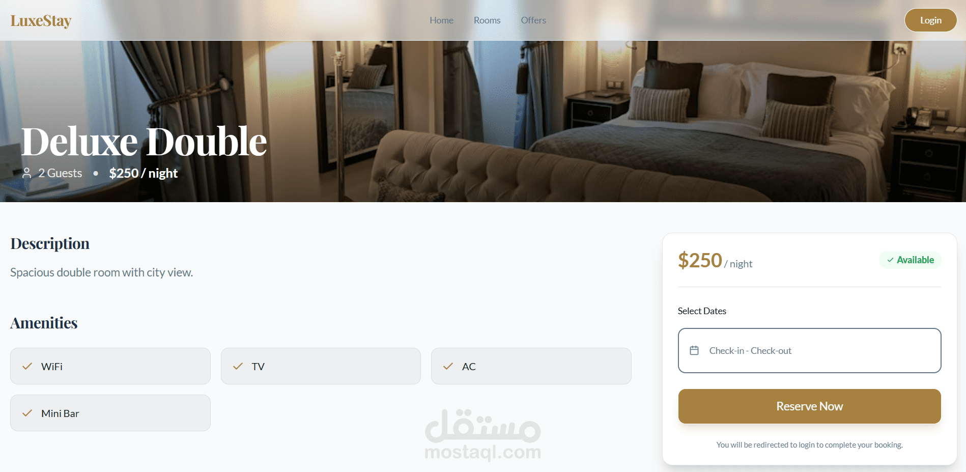 قمت بتطوير LuxeStay، وهو نظام متكامل لإدارة الفنادق (Hotel Management System) يهدف إلى تسهيل إدارة عمليات الحجز والغرف والعملاء بشكل احترافي، مع توفير تجربة سلسة للنزلاء ولوحة تحكم قوية لإدارة الفندق.