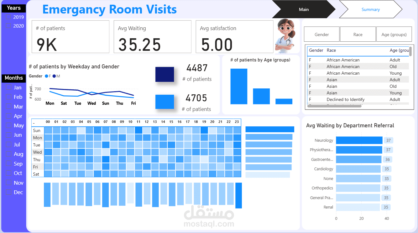 يهدف هذا المشروع إلى تحليل بيانات زيارات المرضى لقسم الطوارئ خلال عامي 2019 و2020، بهدف فهم أنماط الزيارات ومستويات رضا المرضى ومتوسط أوقات الانتظار.
