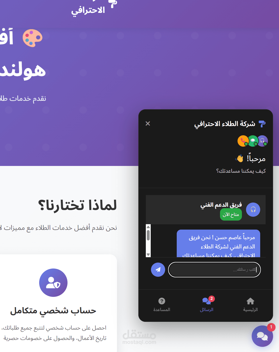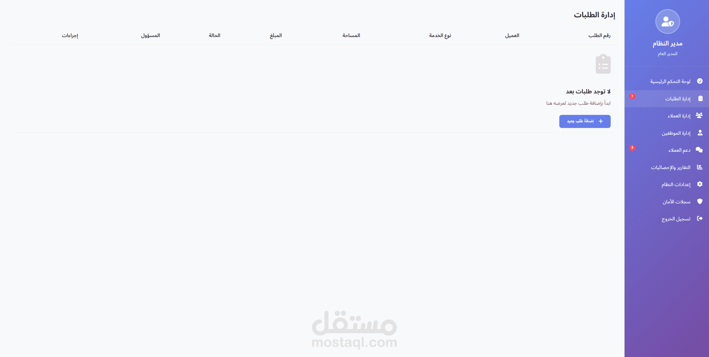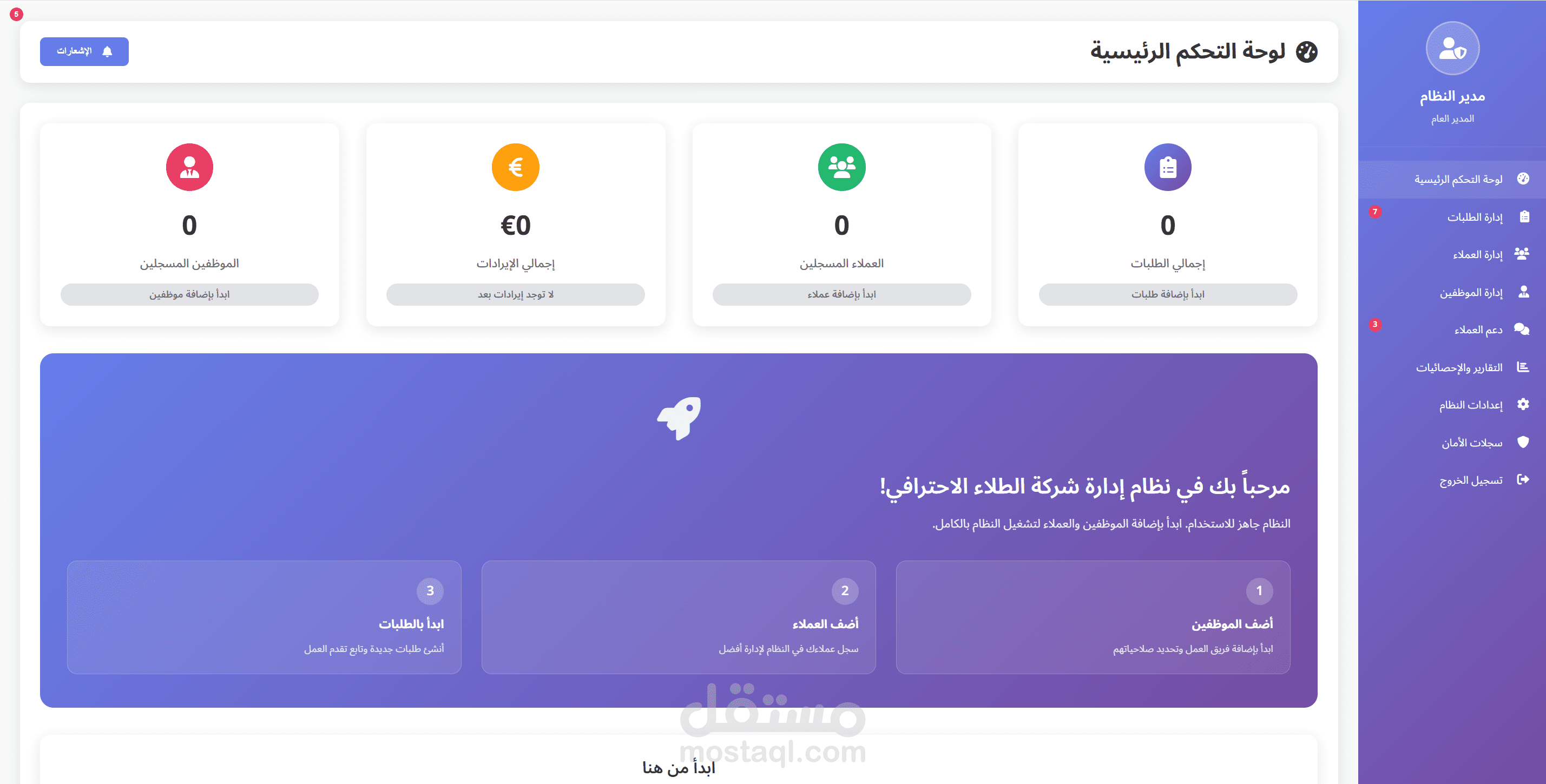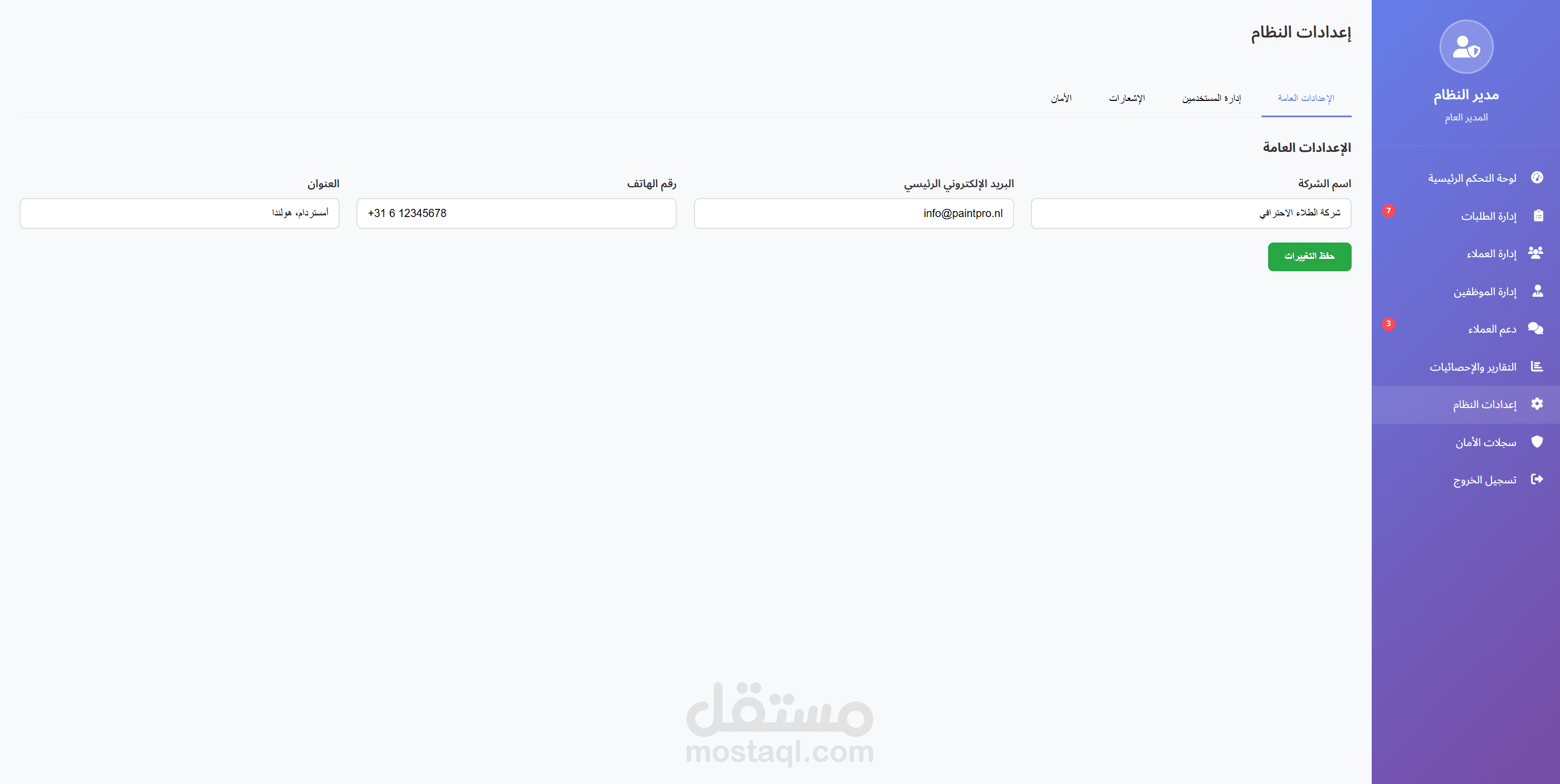 قمت بتطوير لوحة تحكم احترافية بالكامل باللغة العربية مخصصة لإدارة شركات الطلاء والخدمات المنزلية. النظام يساعد الإدارة في التحكم الكامل بالطلبات والعملاء والموظفين والدعم الفني من مكان واحد.