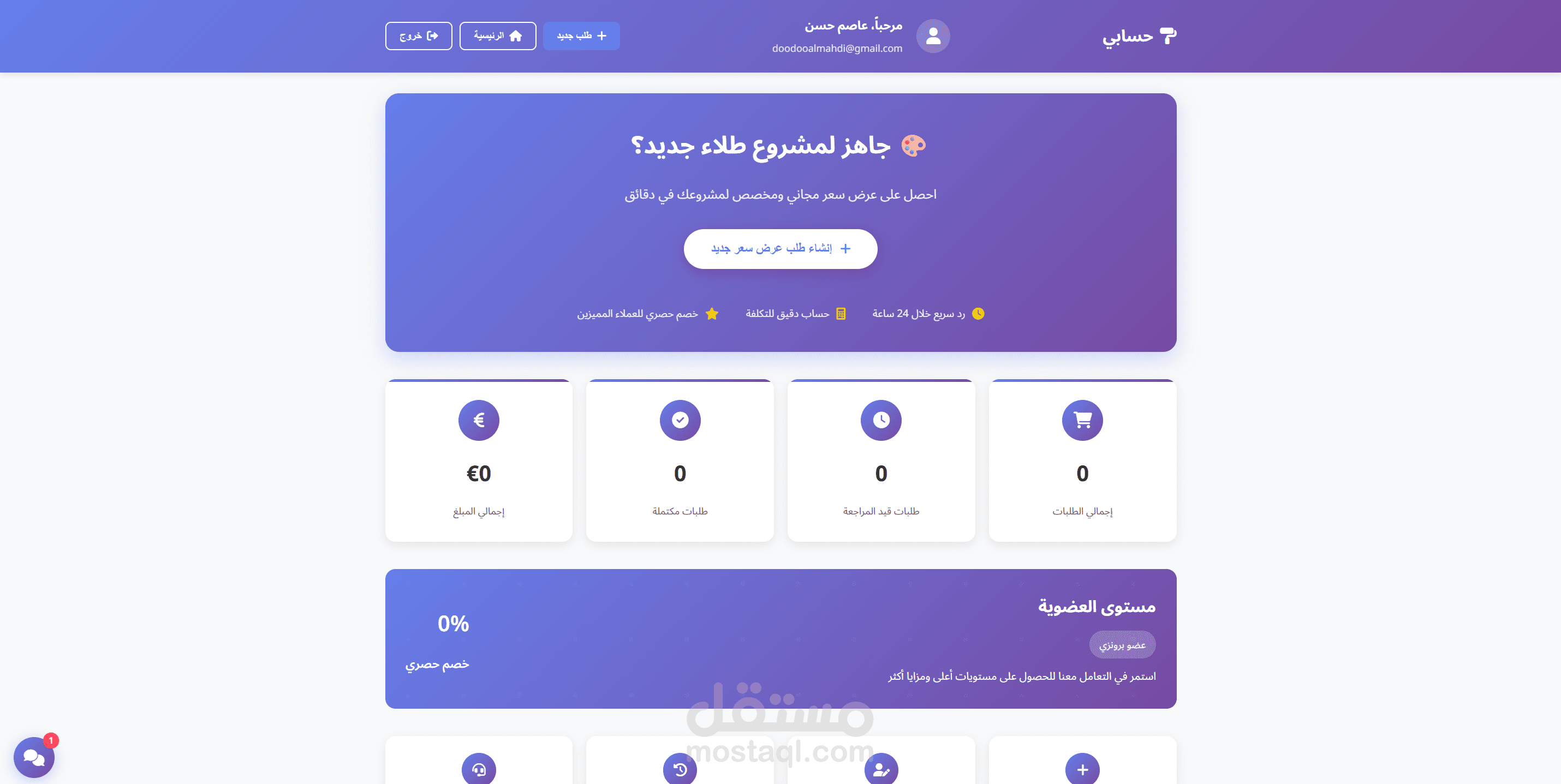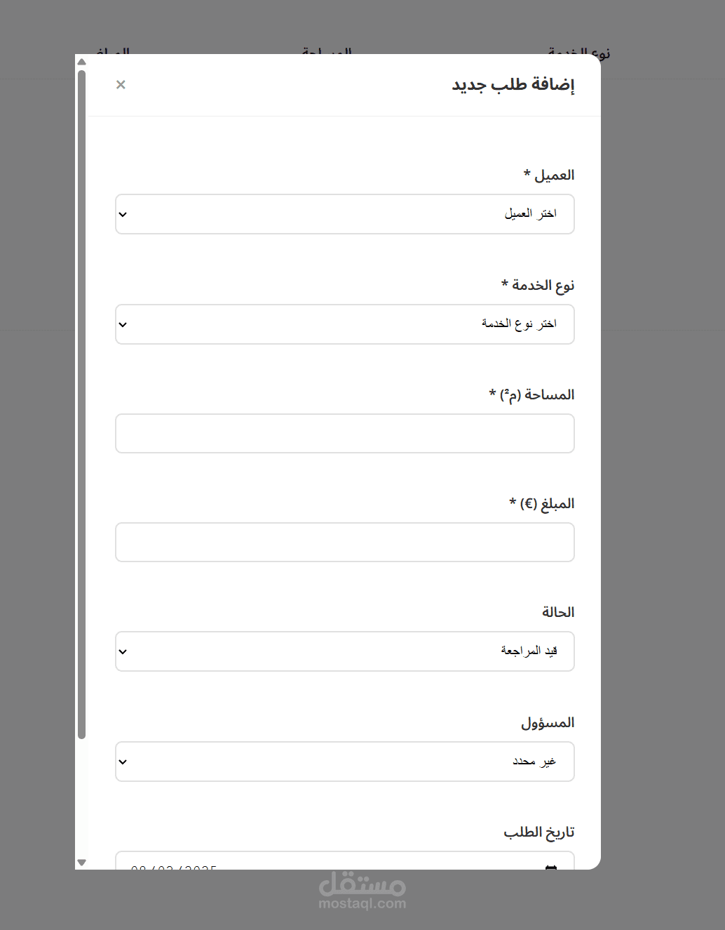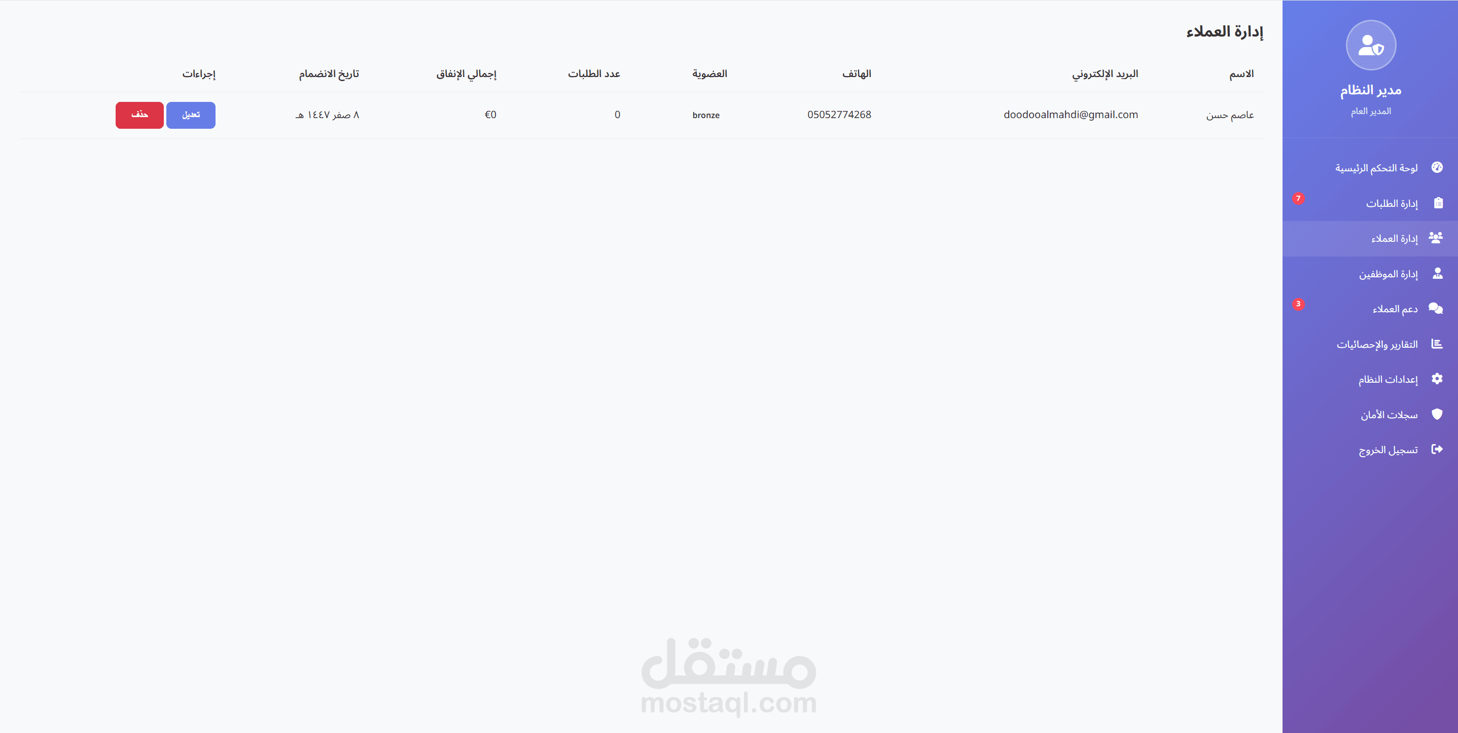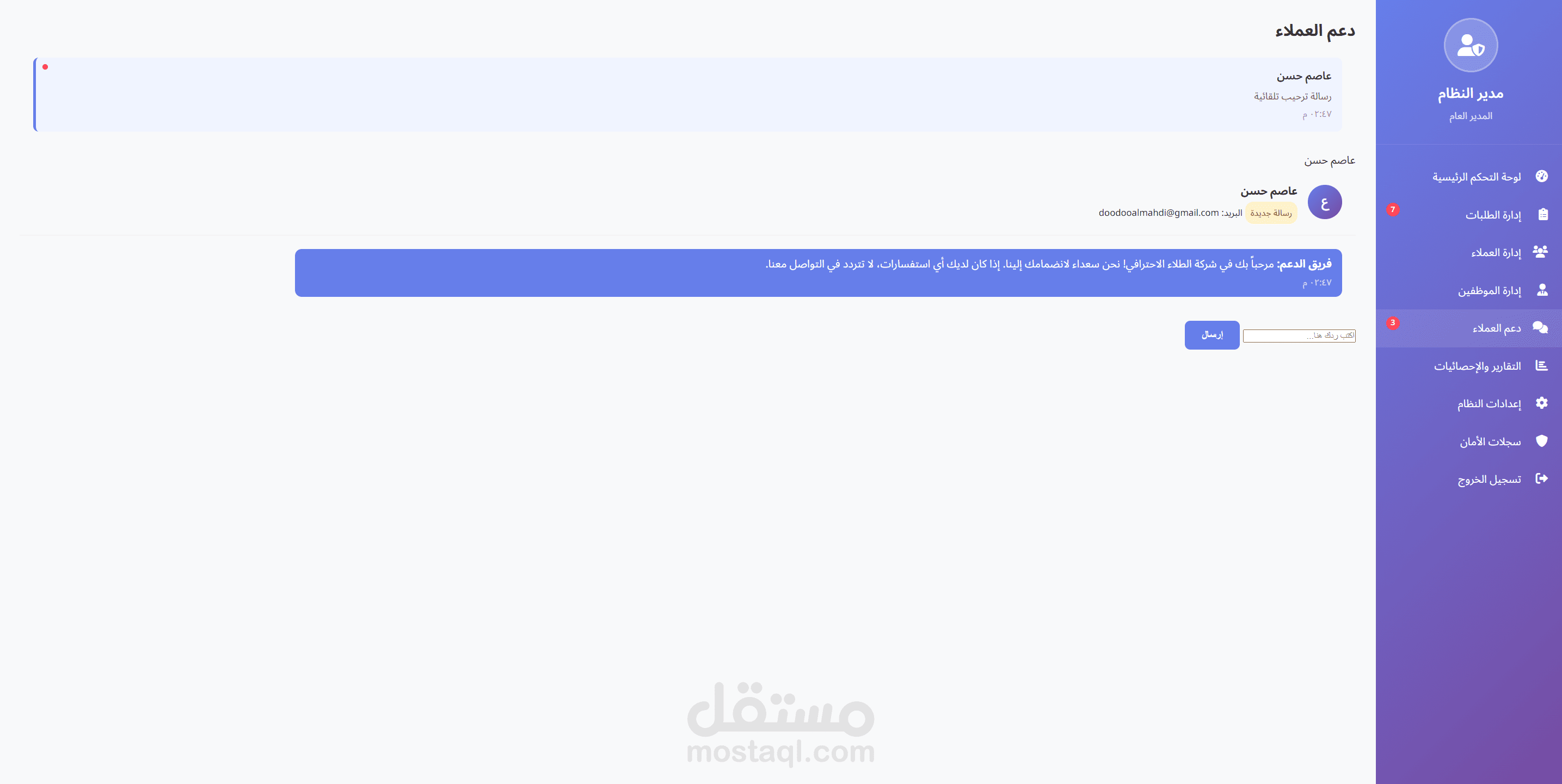قمت بتطوير لوحة تحكم احترافية بالكامل باللغة العربية مخصصة لإدارة شركات الطلاء والخدمات المنزلية. النظام يساعد الإدارة في التحكم الكامل بالطلبات والعملاء والموظفين والدعم الفني من مكان واحد.
